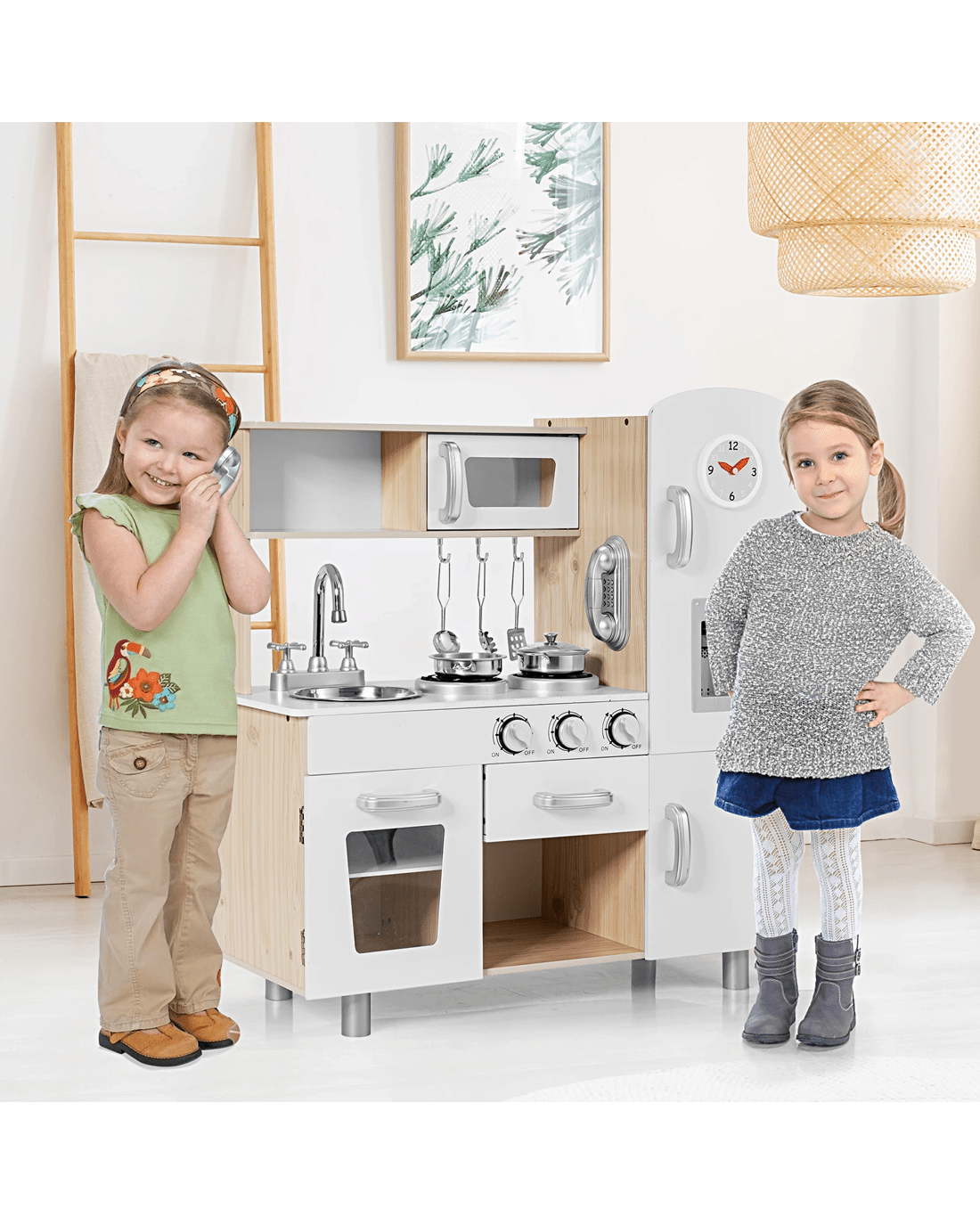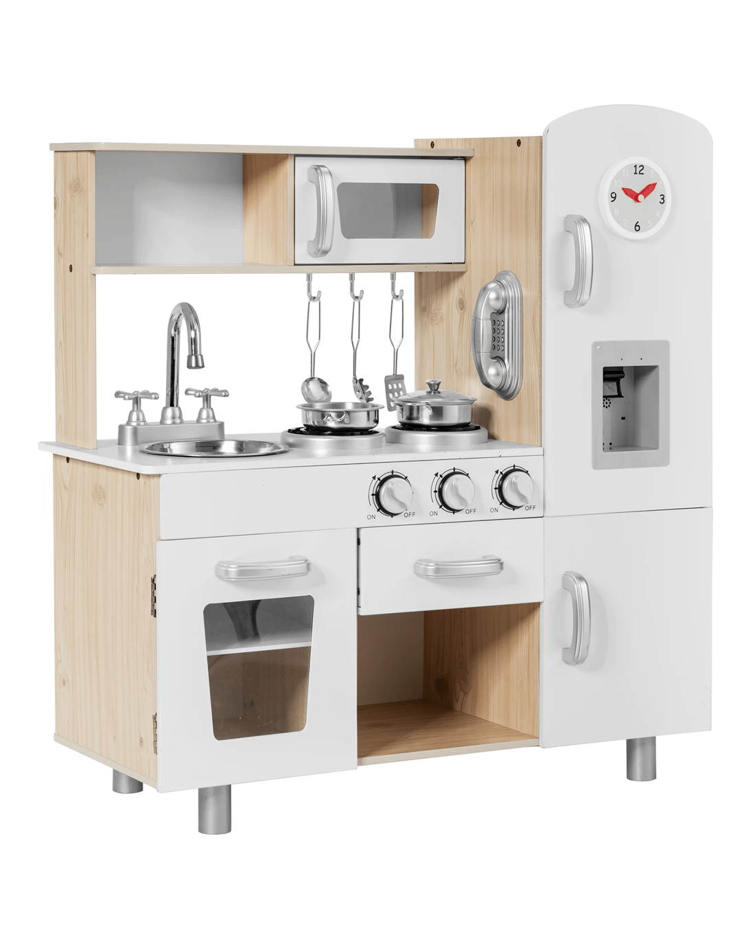 Accessories include a pot with lids, a pan, 3 cooking utensils and a telephone