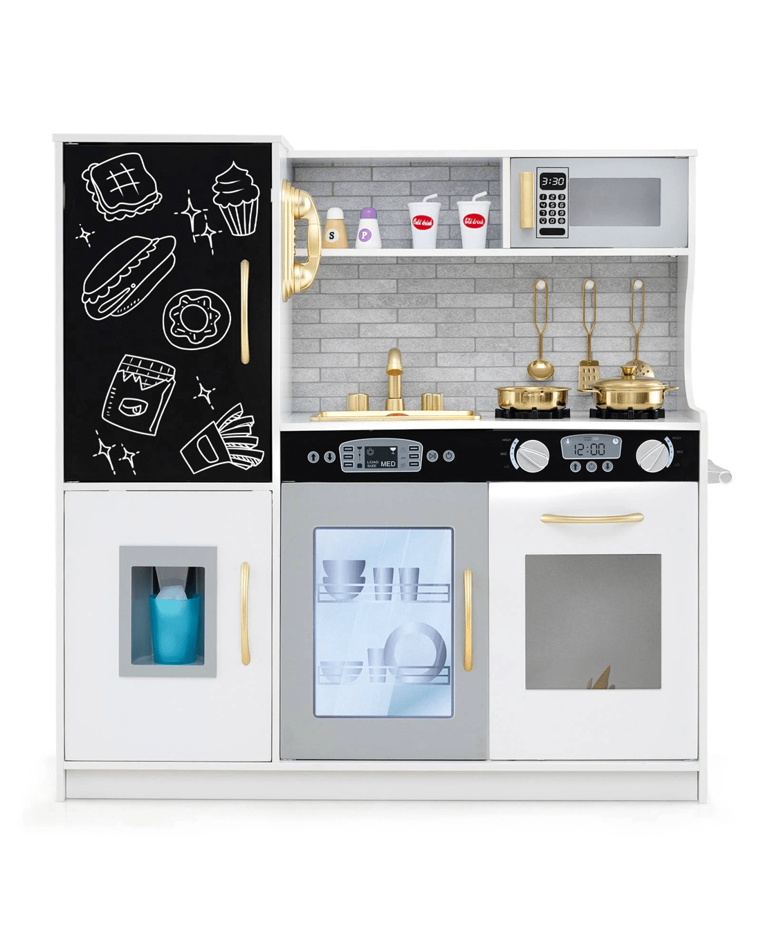 This little ones kitchen toy features a microwave, sink, stoves, ice maker, dishwasher and oven, offering an immersive kitchen experience to little ones. Moreover, the chalkboard and telephone bring extra fun. Realistic sound is available by rotating the knobs. In addition, little ones are able to promote their hands-on ability, imagination, creativity through role play. Furthermore, the ample storage space as well as convenient hooks and towel rack holds various things orderly. While there are built-in handles for easy opening. To create a safer environment, you are able to fix the little ones kitchen to the wall firmly with the equipped anti-toppling device.