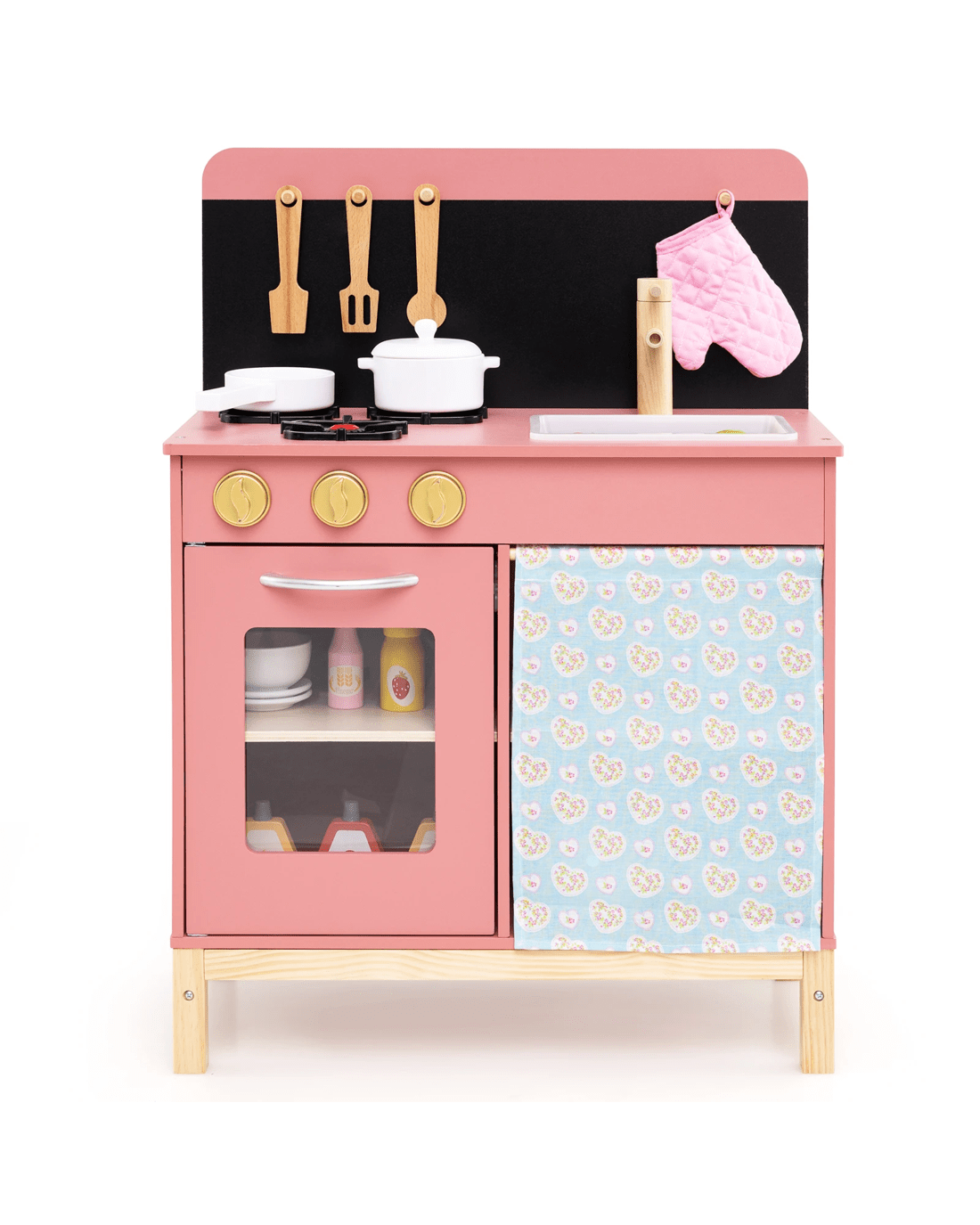 The “click” sound of the knobs as your little chef rotates them, along with the stoves, sink, faucet, and oven, create a comprehensive cooking experience. security is paramount with a splinter-free surface and rounded edges. Enhancing the play experience further, the toy kitchen set comes with cookware accessories that can be organized with the storage cabinet, glove and utensil hooks. Perfect for little ones above 3 years old, this wooden kitchen play set makes a delightful gift, cultivating various skills through imaginative play.
