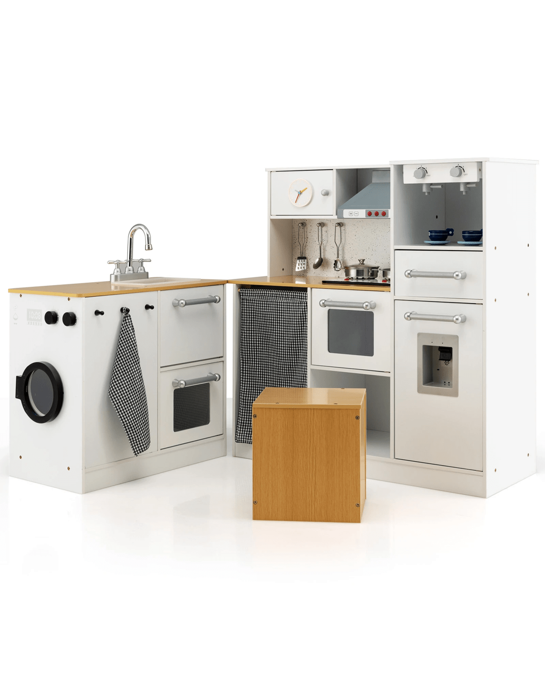 With complete accessories and realistic appearance, the play set can instantly catch your little ones' attention. It's composed of 2 separate parts and has multiple playing areas so that little ones can experience different playing fun. The pretend range hood and stove burner can simulate cooking sounds and emit warm lights, letting little ones immersed in the role-play game. Besides, there is plenty of storage space to accommodate the accessories. What's more, little one's security is our superiority. This pretend chef toy set is constructed of durable MDF and designed with round corners, ensuring long service life as well as safe use experience.