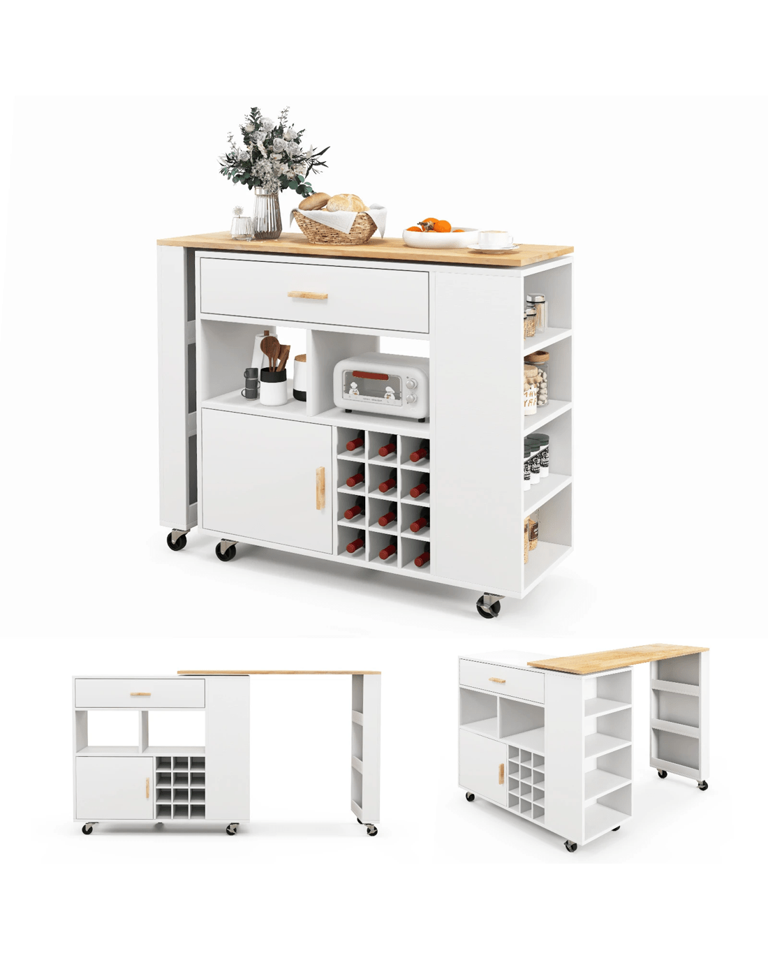 This 2-in-1 reversible kitchen island cart is a great way to transform your home, which can be served as a bar table when you rotate the tabletop. As you can see, the mobile serving cart features wide rubber wood countertop to keep kitchen supplies you need within reach. The large drawer, 2 open shelves, storage cabinet and 4-tier side shelves are designed to hold a variety of kitchen essentials. Otherwise, 3-position adjustable shelf suits kitchen supplies of different sizes. Come with 12-bottle wine rack, you can store wine bottles or remove the partition to be a large storage shelf. 7 smooth-rolling casters (3 lockable) are convenient to move the cart from kitchen to dining room. Not only a kitchen storage cart, but also can be used as a bar serving cart or food cart for dining room. You can maximize its usage as per your preference.
