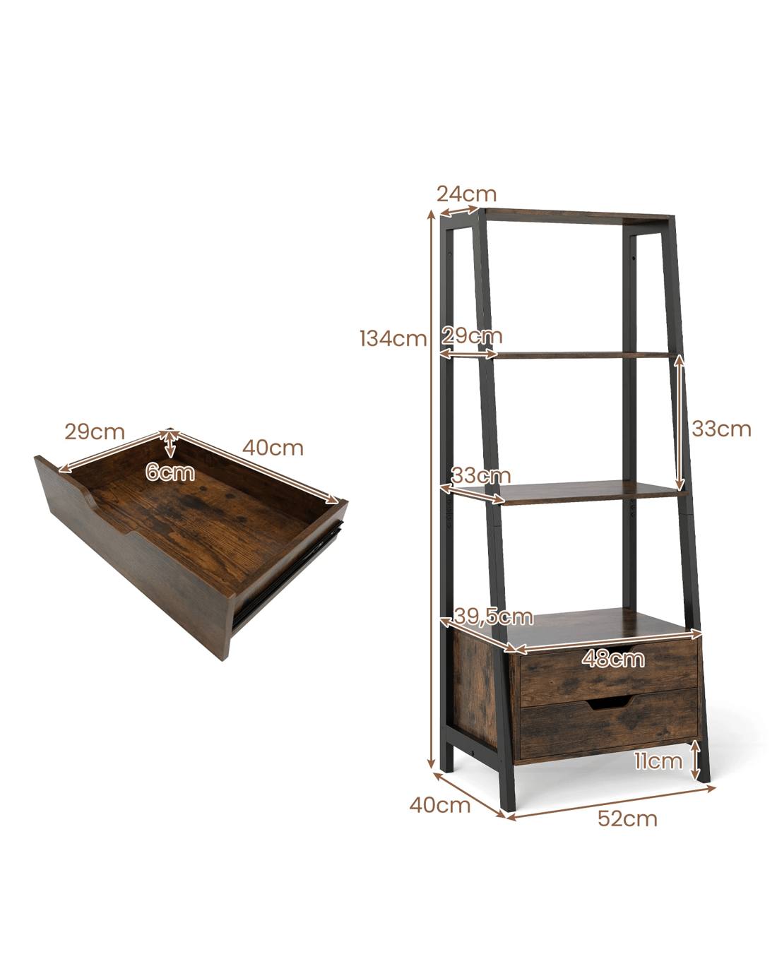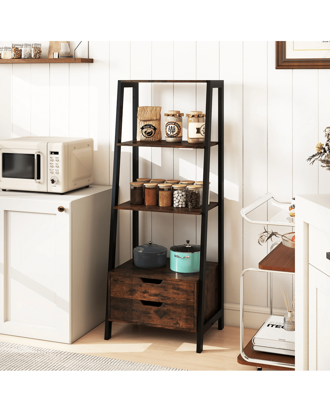 4-tier open shelves and 2 spacious drawers for books, photos, and decorations