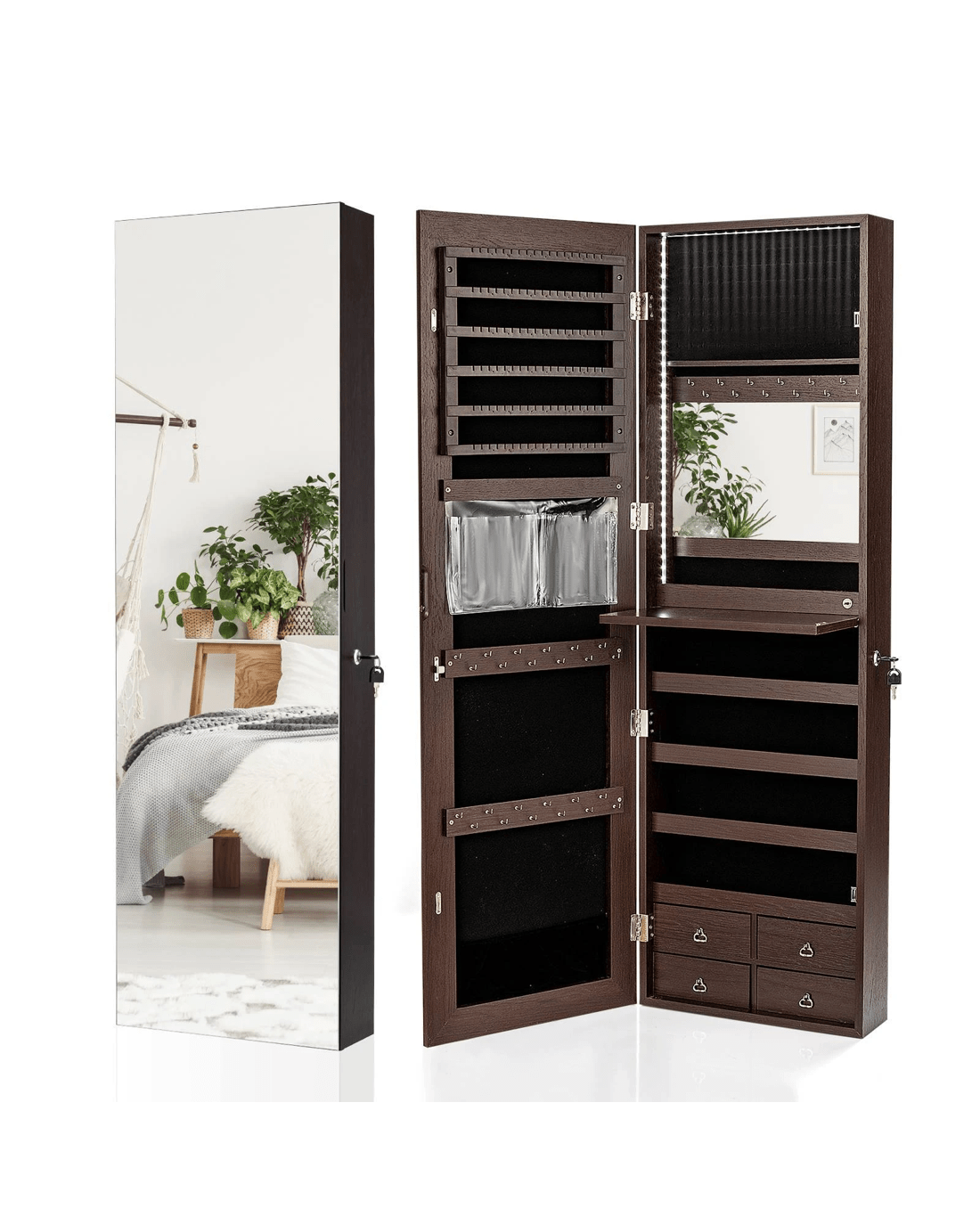 Your loved one will be obsessed with such a multifunctional jewelry cabinet with full-length frameless mirror and ample storage space. The jewelry area of this cabinet includes 36 necklace hooks, 108 earring positions, and 91 ring slots, which can orderly keep your jewelry and make them no longer messy. Meanwhile, you can also put cosmetics into the cabinet, since there are 2 facial mask pockets, 1 bottom pouch, 4 racks, and 4 drawers gathering all the beauty secrets. In addition, the cabinet has an inner mirror, 3-side LED light and a dropleaf board for daily makeup steps. More importantly, the jewelry cabinet can be easily hung on the door with metal hooks or fixed on the wall with screws, which is designed to save floor space.
