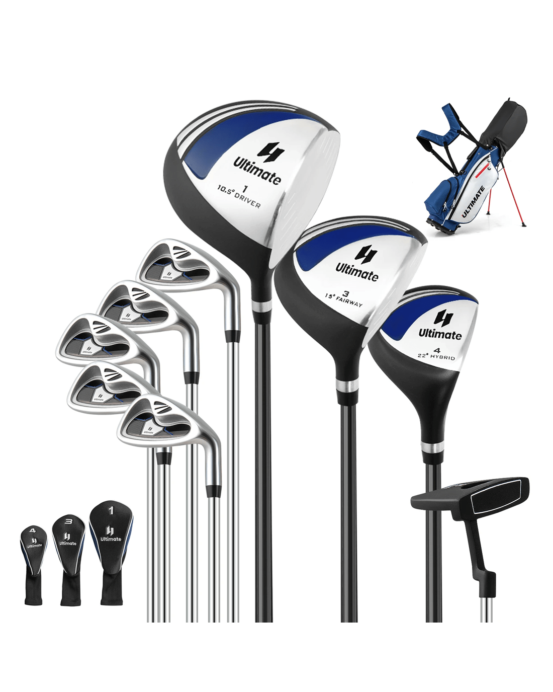 Whether you're a beginner or an avid golfer, this men's golf club set is the perfect choice. With completed components, the golf clubs set includes alloy driver, 3 fairway wood, 4# hybrid, 6#-9# irons, pitching wedge, putter and the lightweight stand bag. To improve forgiveness on off-center hits, the oversized club heads are friendly adopted and allow the beginner to hit the ball in the air easier. The aluminum driver is toe and heel weighted to offer better center gravity, which improves head speed and delivers greater distance. Plus, the pitching wedge is equipped so as to hit the ball over obstacles. The irons ranging from 6# to 9# with different slopes meet all your needs. And the putter is specially designed to keep putts on line.