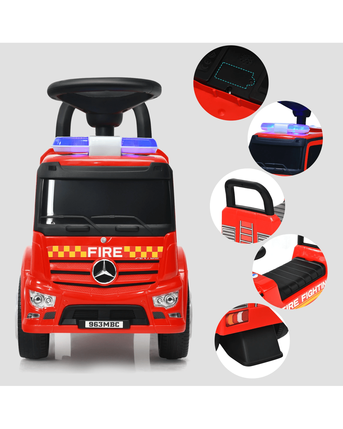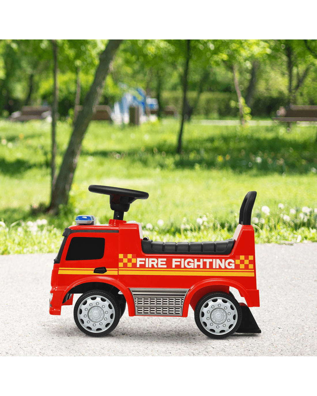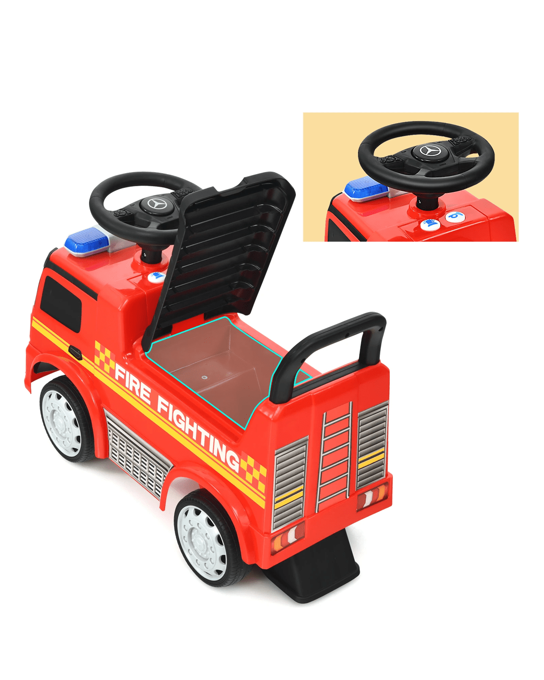 Fire engine appearance to provide little ones with an authentic driving experience