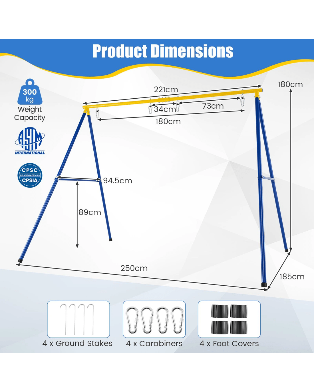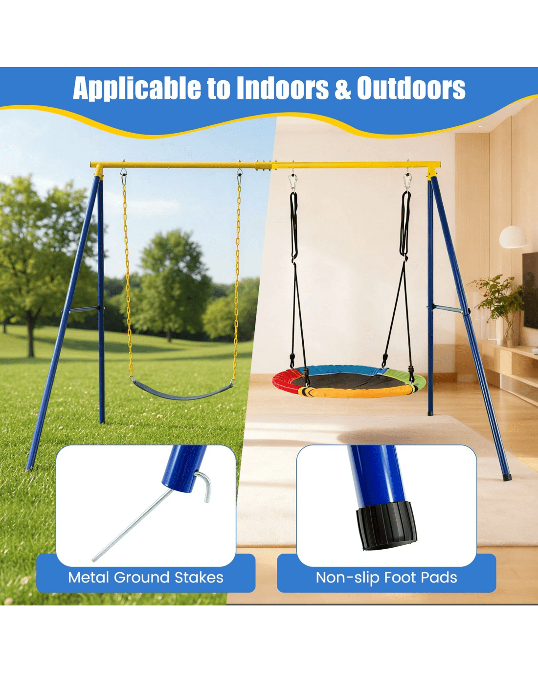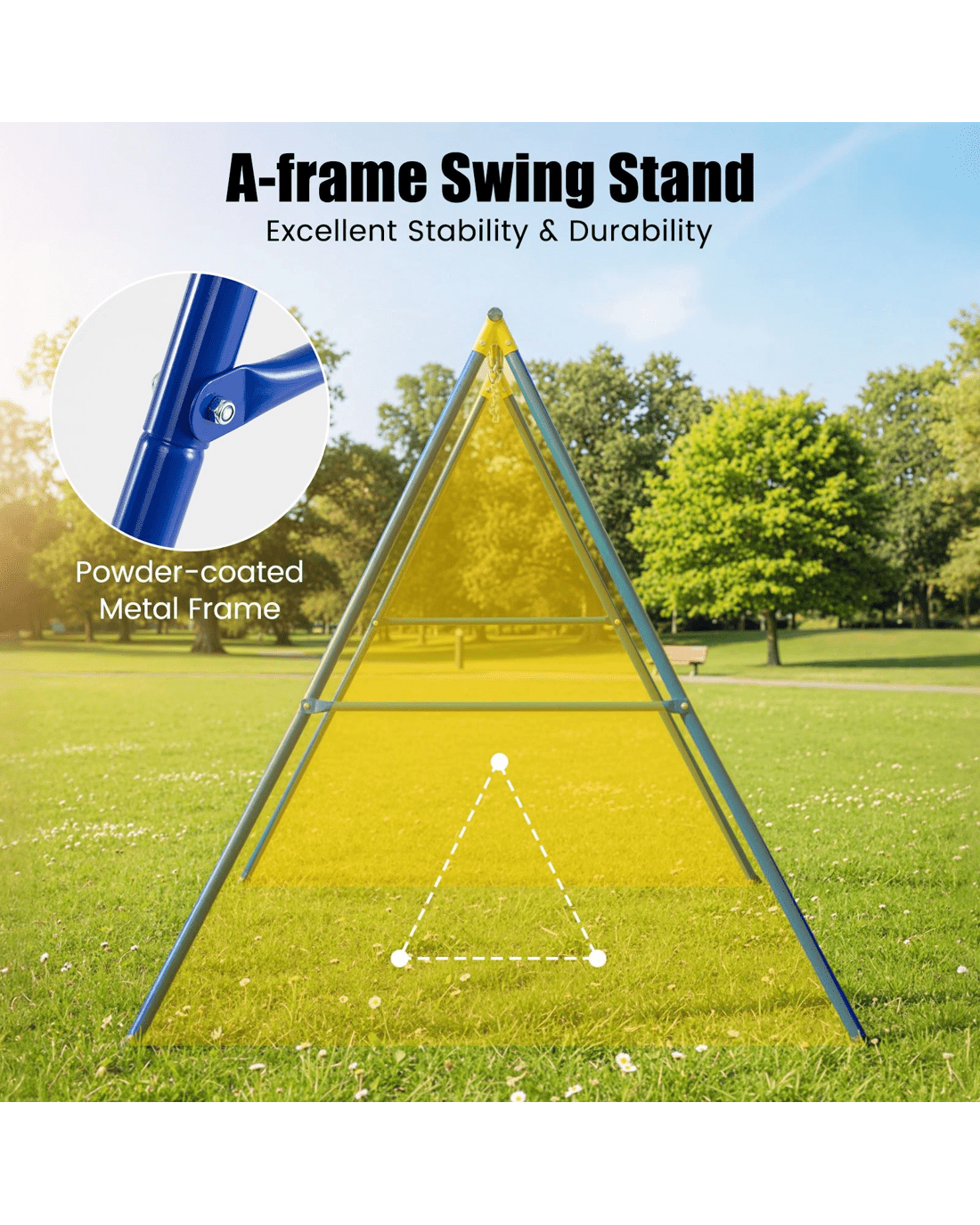 If you are still worried about what to put in your backyard or patio to make the whole family happy and make the backyard pretty, our A-frame swing stand could help you with that. Our swing stand is much wider than the market average, giving your families more room to play safely with a extra large size at the base. Made of heavy-duty metal pipes, this A-shaped swing stand is very sturdy, and its weight capacity is up to 300kg.The ground stakes, as well as the center structure on the cross-bar, can enhance its stability. Besides, the anti-rust finish is durable enough to stand the test of time, which also requires low maintenance. This weather-resistant swing stand is ideal for both indoor and outdoor use, and you can hang a net swing, mesh swing, swing chair or even a yoga rope on it. Enjoy the endless fun of swinging!