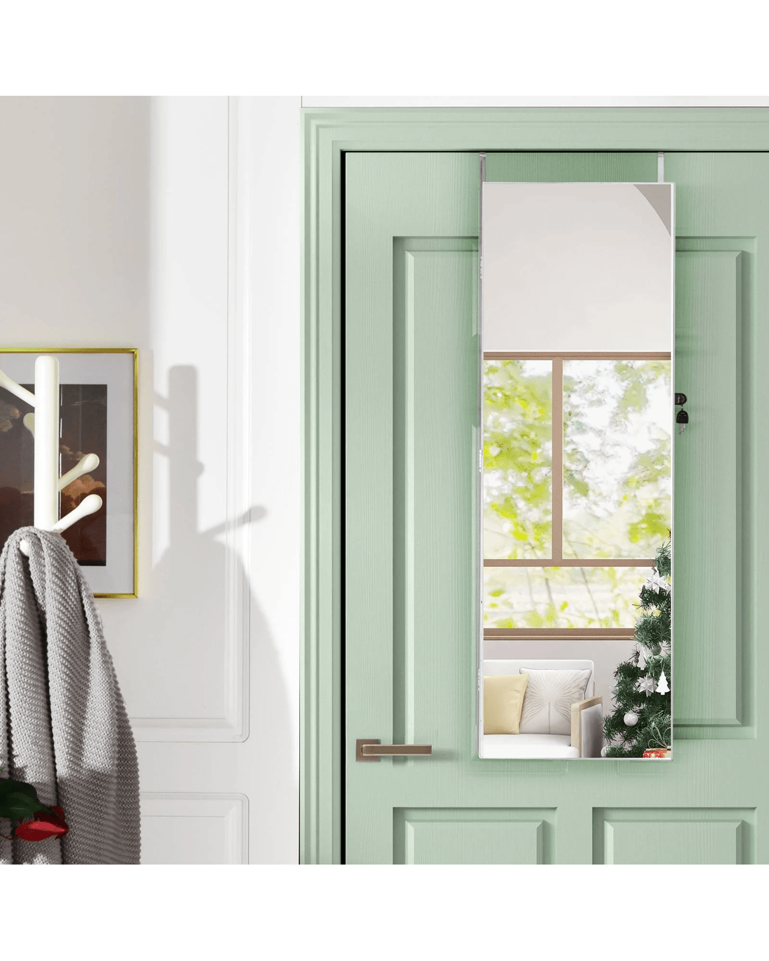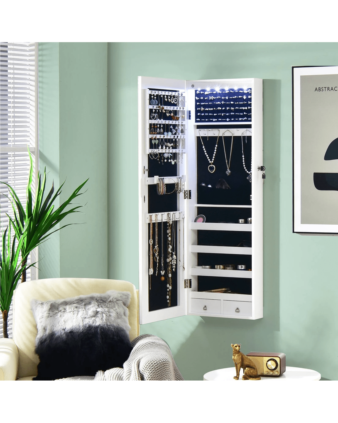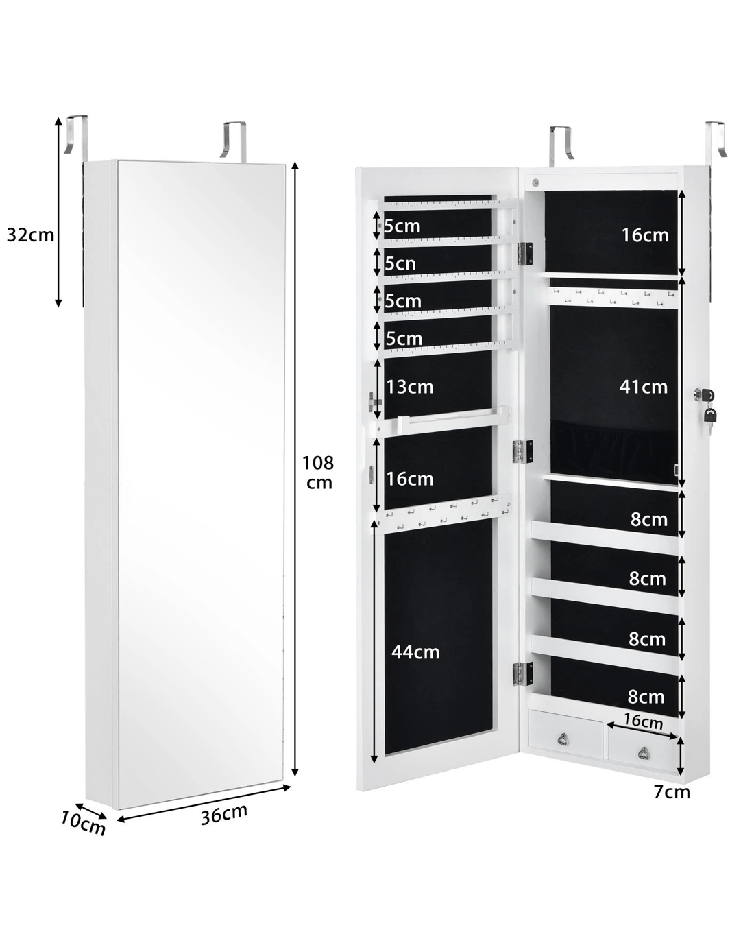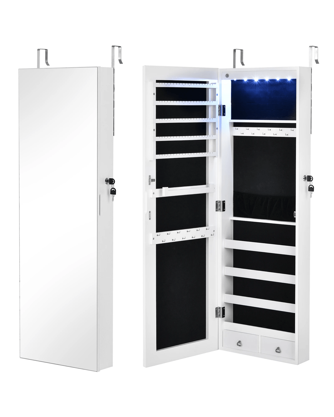 Costway Mirrored LED Jewellery Cabinet Wall/Door Mounted Jewelry Armoire w/2 Drawers Box Organizer - White