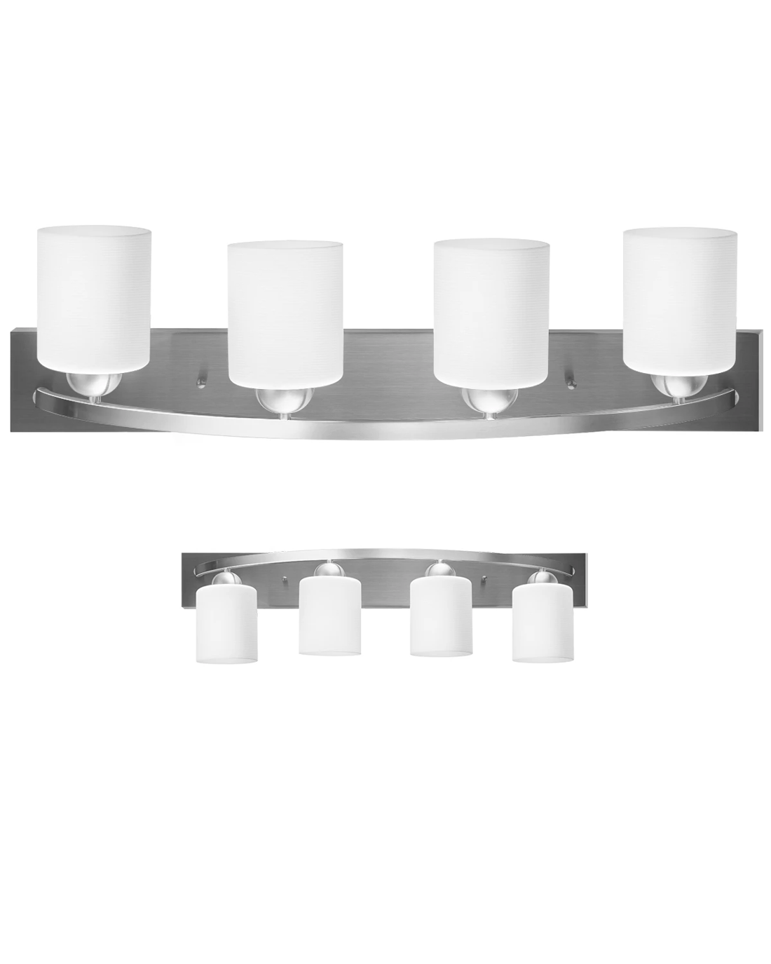 This modern bathroom wall sconce adds simplistic charm to your bathroom décor. It features a sophisticated look with smooth curved lines and white painted glass shades. The lighting fixture is crafted from metal, which provides sturdiness and makes it last longer and the shades are burnished white finish adding to the fixtures appeal. The modern design will facilitate mix-and-match coordination to perfectly enhance the decor.