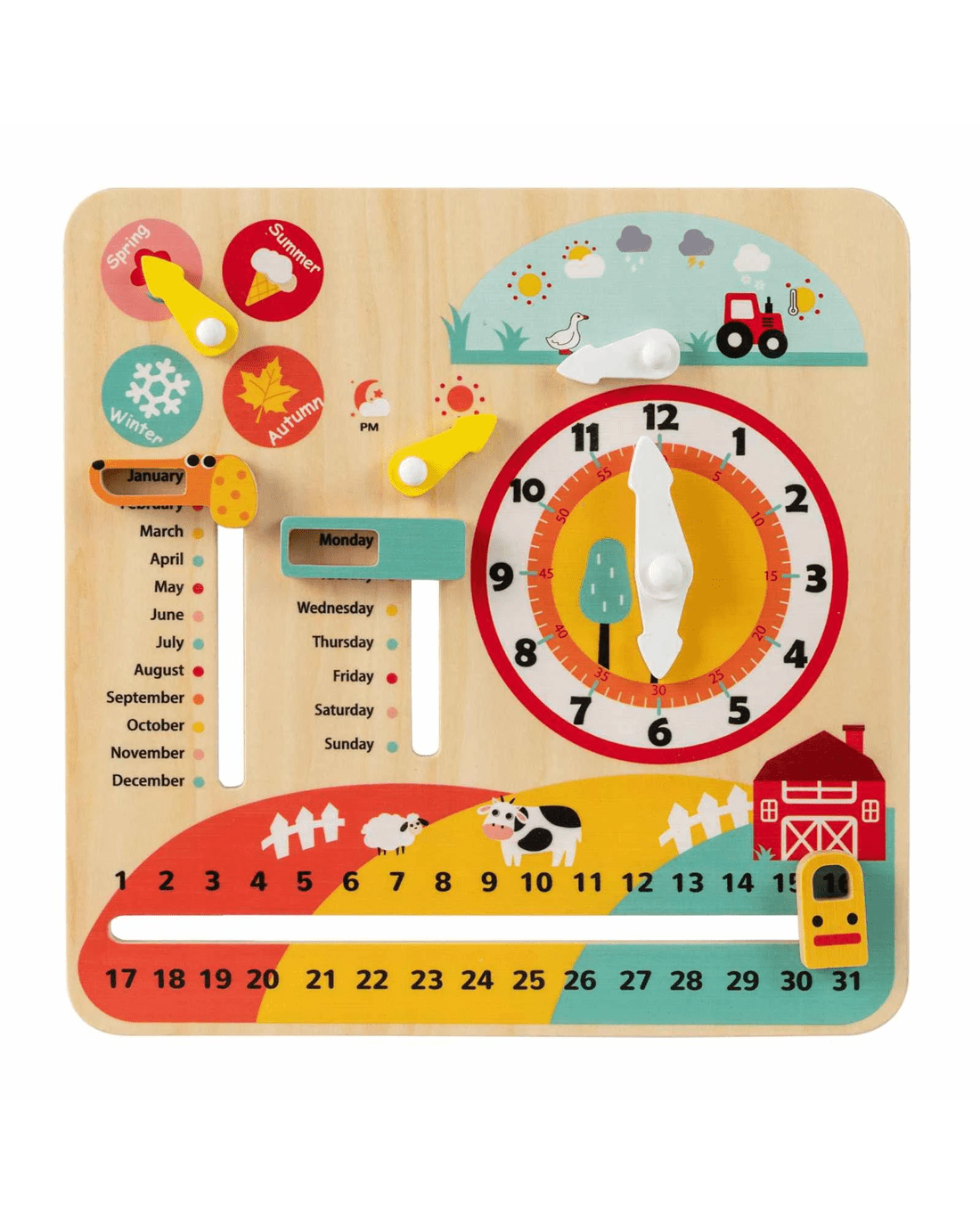 This engaging little ones learning toy blends education and play to introduce users aged 3 and up to time concepts like months, weeks and dates. Featuring vibrant, illustrated panels with a 4 seasons pointer, weather pointer and day/night pointer, it sparks curiosity about seasons, weather patterns, and the cycle of day and night. It also has a clock, month slider, week slider, and date slider, turning time-telling into an enjoyable hands-on activity. Crafted from natural material - premium beech wood - with high sturdiness, smooth rounded edges, and well-made details, this enduring educational tool ensures long service life, perfect for little ones through early elementary years. Easy knob adjustment allows to interact effortlessly. With 2 wall mounting holes, it is a space-saving choice for small rooms and can be displayed on walls or flat surfaces. This versatile design supports everyday learning, easy at home, fostering early science cognition and logical observation training.