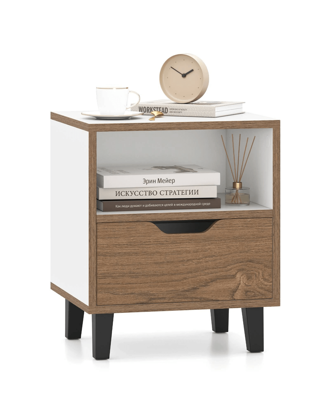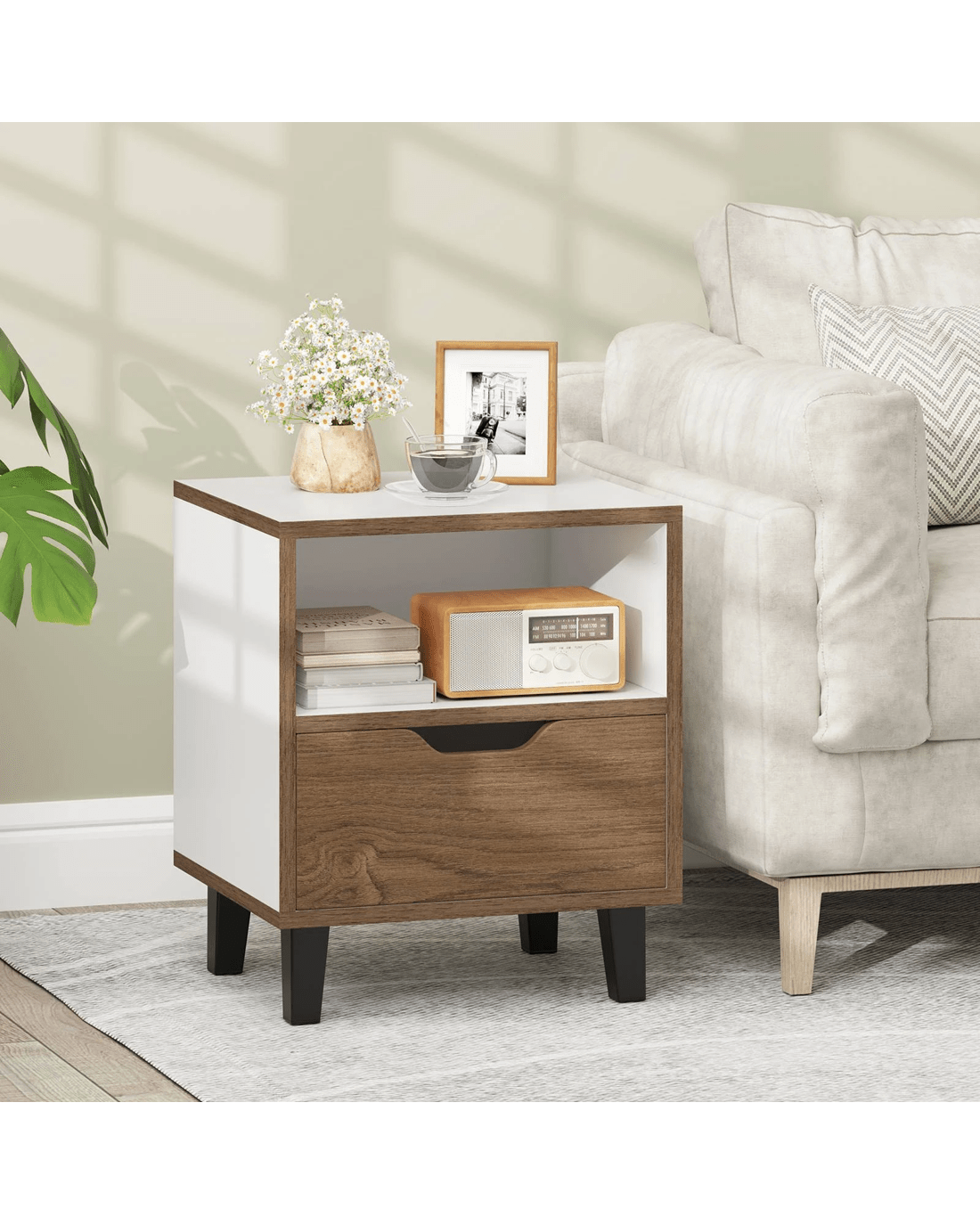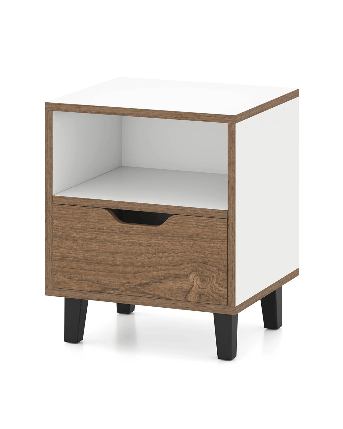 Combining elegant wood grains with sleek panels, our dual-toned bedside table brings a chic modern flair to any room. Benefit from the convenience of an open shelf for quick access to your tablet or latest read, while the top surface is perfect for a bedside lamp to create ambiance. The drawer effortlessly slides open, offering a handy storage solution for personal items like undergarments and beauty essentials. Featuring durable metal legs, anti-slip foot pads, and an easy-to-care-for surface, our nightstand is a reliable and enduring addition to your home!