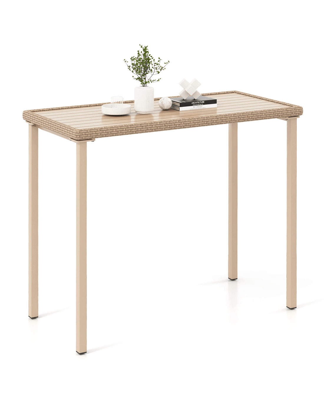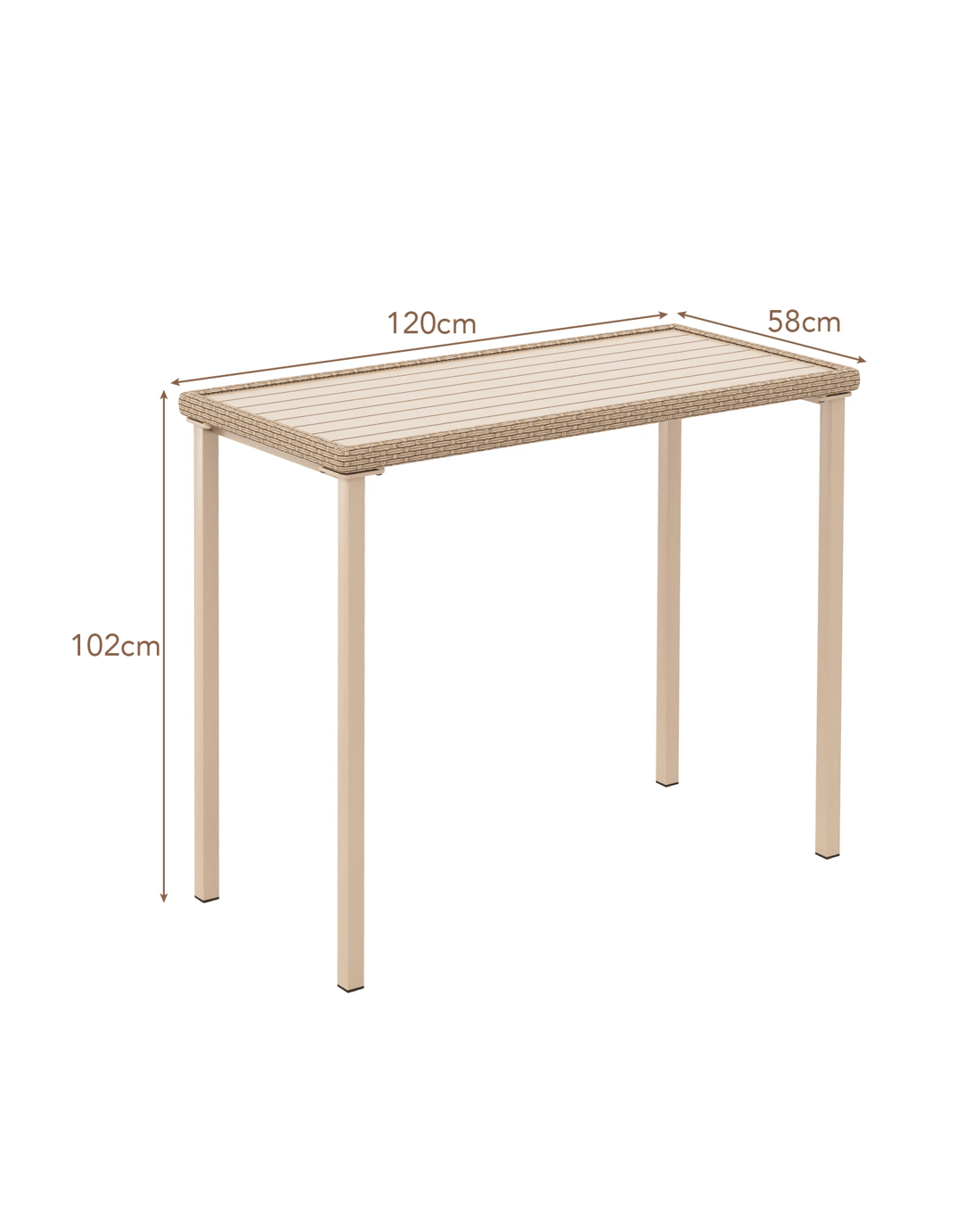 Crafted with a robust metal frame and adorned with elegant, sunproof light brown PE rattan, this table combines functionality with a decorative flair. The 120 x 58 cm slatted metal tabletop is spacious and sturdy enough for multiple food and drinks, and prevents water accumulation for easy maintenance. Standing at 102 cm, it pairs seamlessly with most bar stools, making it an ideal choice for any social setting. Whether placed in the backyard, by the poolside, or on the balcony, this versatile table is designed to enhance your outdoor living experience. Transform your space into a chic and inviting retreat with this exquisite bar table.