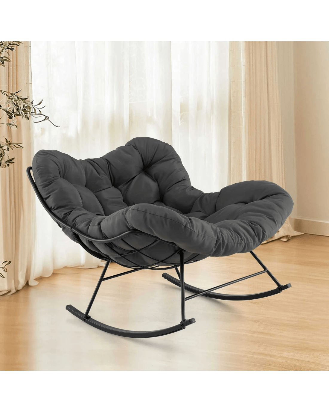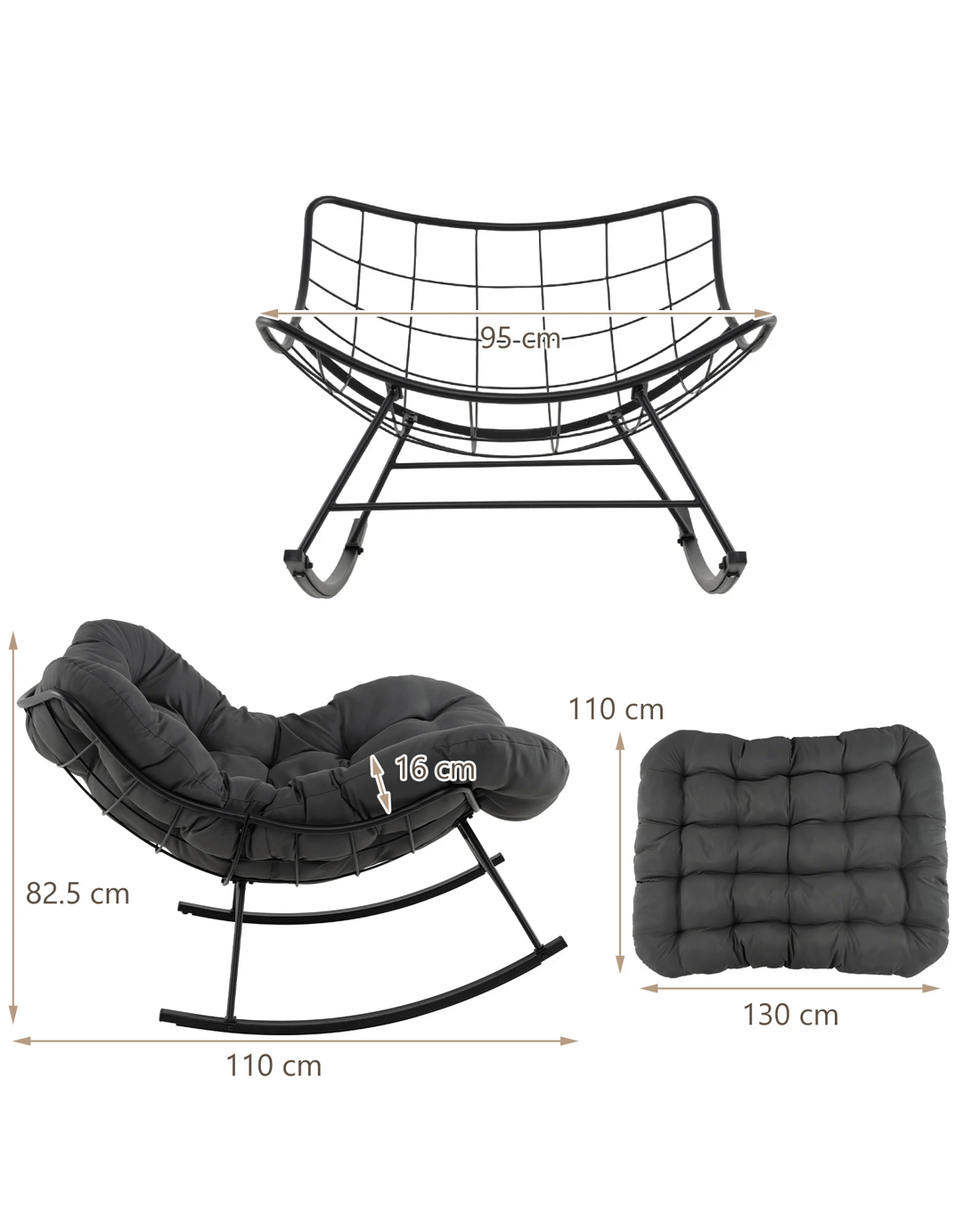 Boasting a reinforced metal frame, the rocking chair is engineered to support up to 205 kg without compromising on style or comfort. The 13 cm thick cloud-like cushion invites you to bid adieu to fatigue and embrace pure relaxation. With our chair's smooth rocking motion, you can immerse in a good book or simply enjoy the beauty of your surroundings. The oversized rocker chair boasts adjustable foot pads and stability enhancements, ensuring a worry-free experience every time you take a seat. Also, the non-slip pads avoid damage to the floor, making it suitable for indoor and outdoor use.