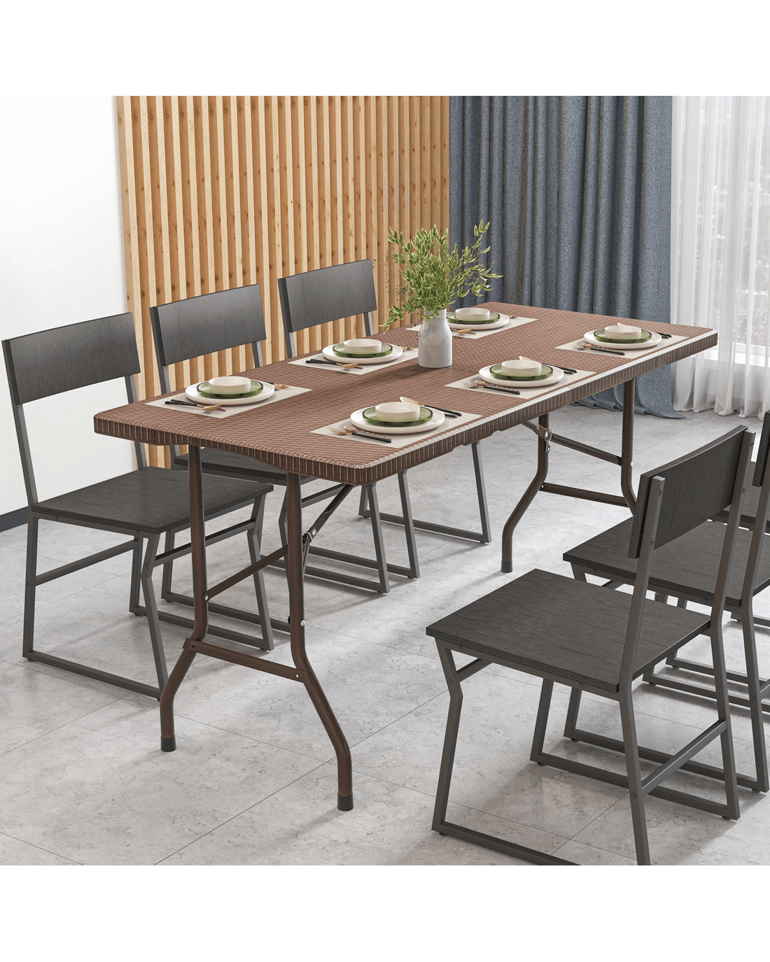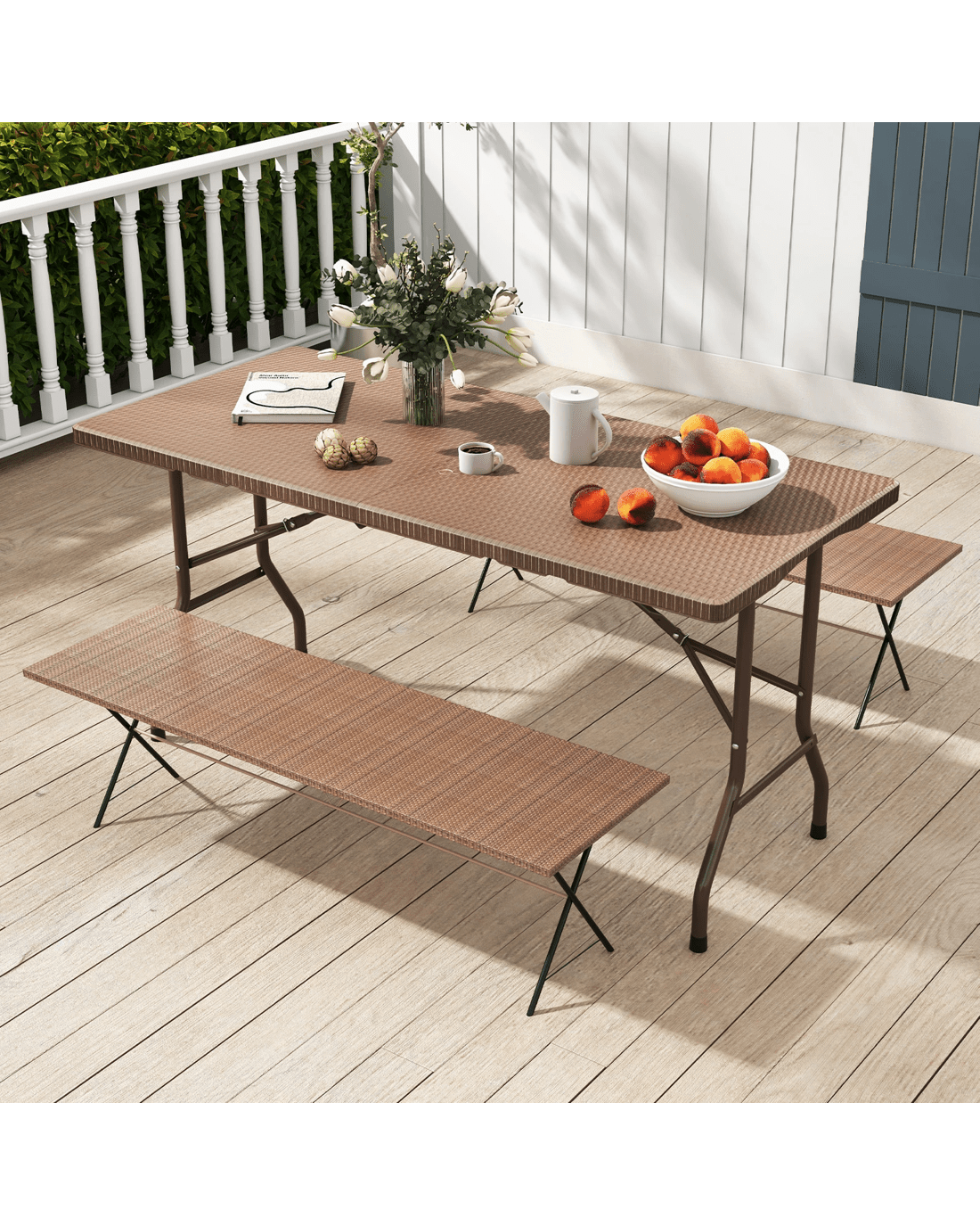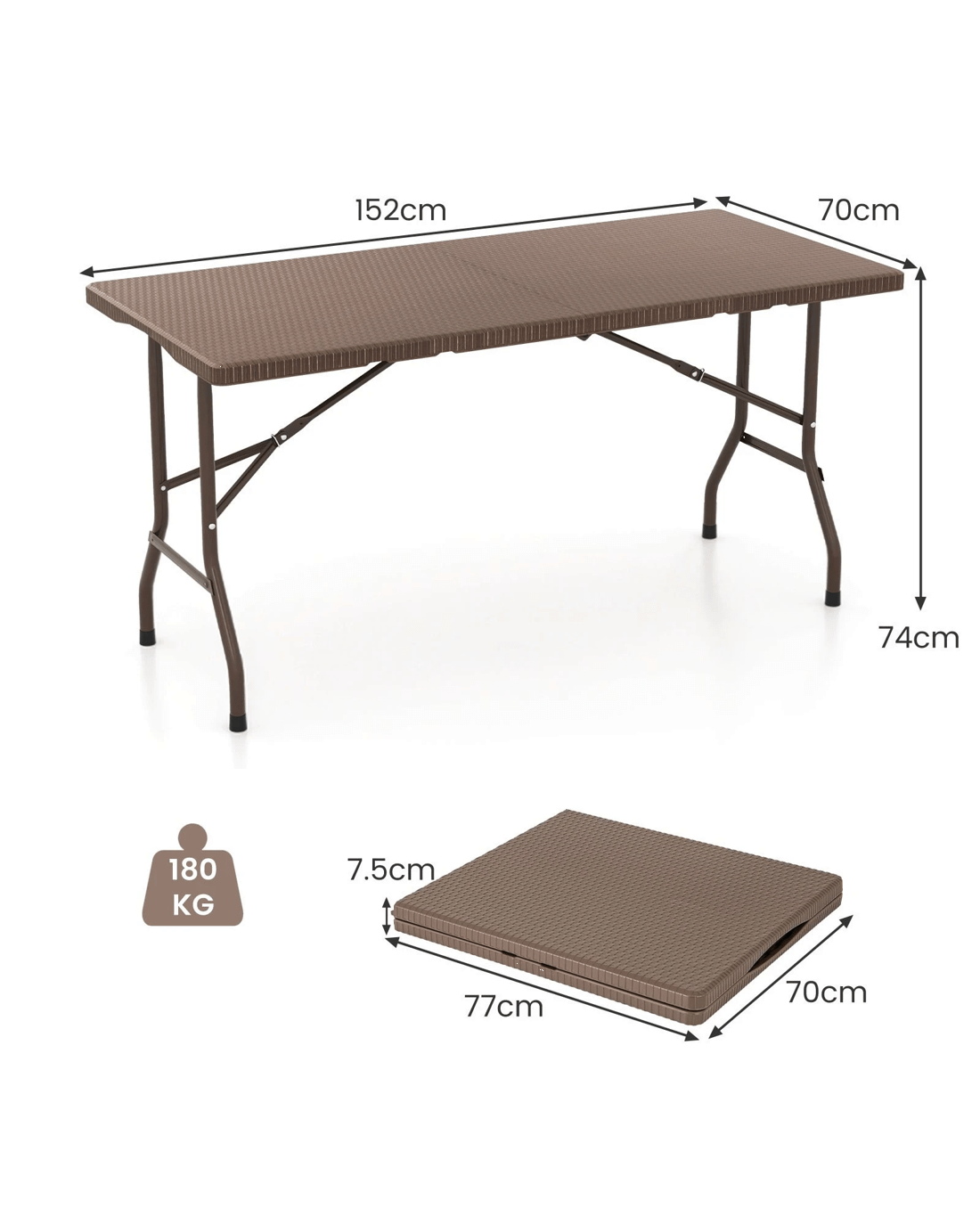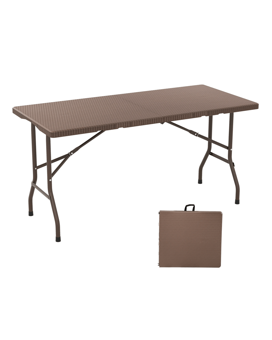 Discover the ultimate dining solution with our versatile folding picnic table. Crafted from HDPE, its elegant rattan-like tabletop resists wear, scratches, and water, ensuring lasting beauty and effortless cleaning. Comfortably seating 4 to 6 people, the camping table is perfect for family gatherings, barbecues, and crafting sessions. The robust metal frame, enhanced by a triangular structure, supports up to 400 lbs, while non-slip foot pads provide stability. Easily foldable for compact storage, the picnic table features a convenient carry handle for hassle-free transport. Ideal for both indoor and outdoor settings, the rattan textured folding table adds a stylish touch to your space. Elevate your dining and leisure activities with this must-have addition!