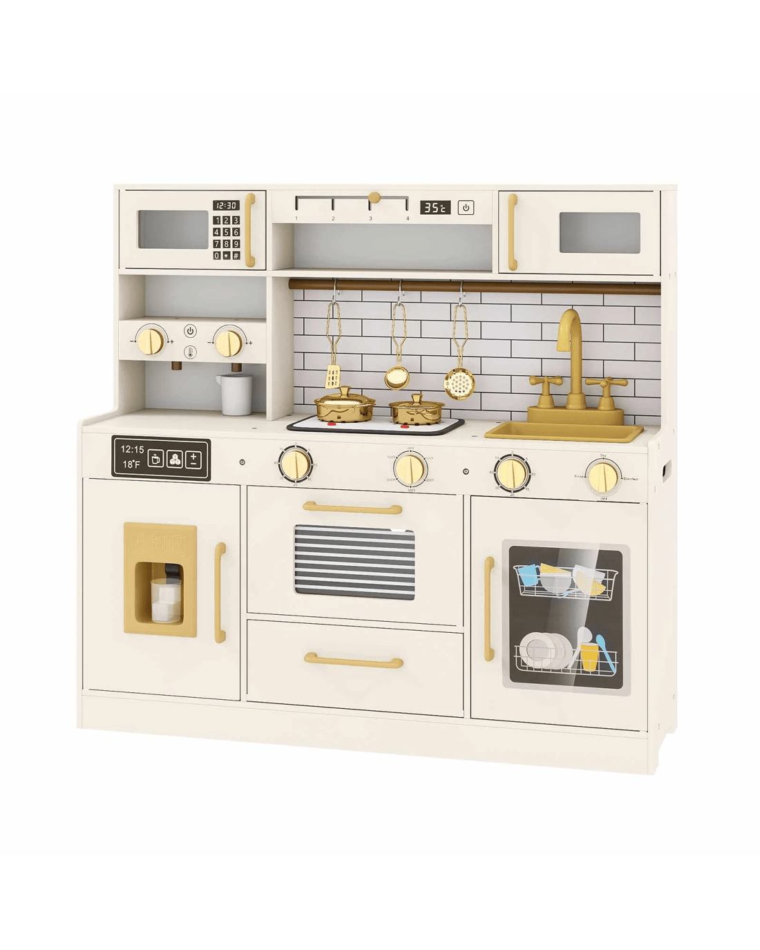 This vibrant little users play kitchen set sparks imaginative play with 2 interactive stoves that light up and make sounds (2 AAA batteries needed, not included). Equipped with 10 fun accessories like pots, pans, and utensils, it invites little chefs to explore various roles using its realistic features: a faucet and sink, microwave, ice and water dispenser, oven, range hood, and dishwasher. Security comes first with smooth surfaces and rounded edges. Thoughtfully crafted storage solutions - including shelves, hooks, and cabinets - bring joy in every tidy touch, where fun stays organized, and play never misses a beat. With well-made details throughout, this pretend kitchen keeps all utensils neatly arranged for easy cleanup. Designed for little user aged 3 and up, this engaging toy kitchen inspires creativity, social skills, and hand-eye coordination, making it an ideal gift for budding culinary artists