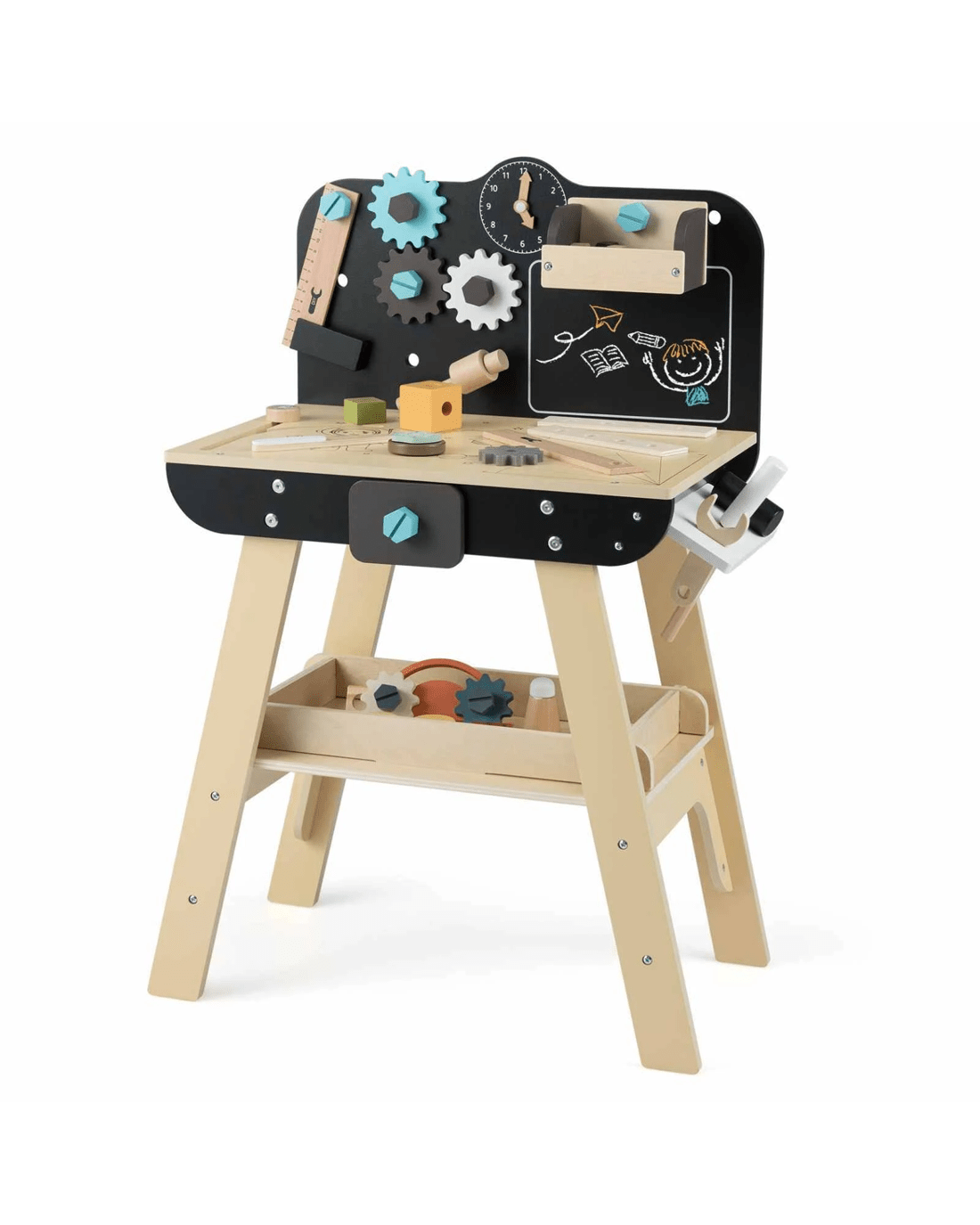 Discover the fun of building with this wooden little users tool bench! The complete toy tools and accessories help little user unleash their creativity and imagination. Little users can enjoy activities like measuring and fastening screws, which help develop hand-eye coordination and fine motor skills. The spacious desktop, storage box and storage shelf offer convenient storage when playtime ends. Made from safe, little user-friendly materials, this tool bench is perfect for young builders.