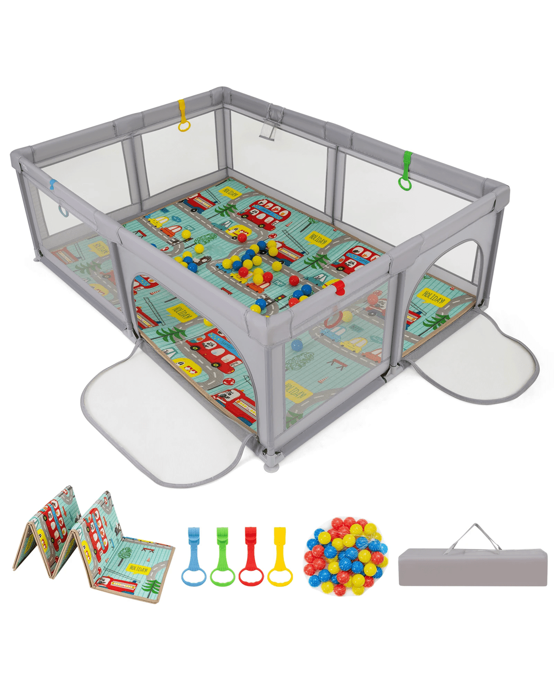 The set includes 50 ocean balls, a hoop, a play mat, and a carry bag for added fun and convenience. Wrapped in soft foam padding, with sturdy metal pipes and anti-slip suction feet, this playard is designed for security and stability. Mesh walls allow airflow and clear views, and zip-open doors give easy access for both parents and little ones. Foldable and portable, this playpen is easy to set up at home or take along for travel, meeting the needs of active families.