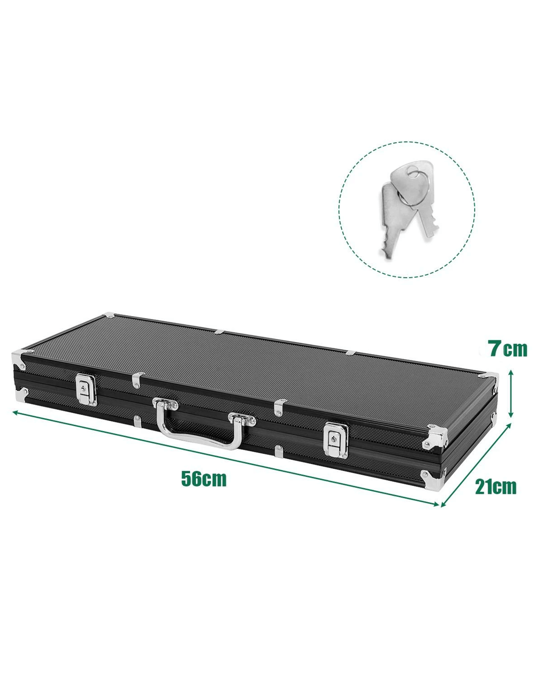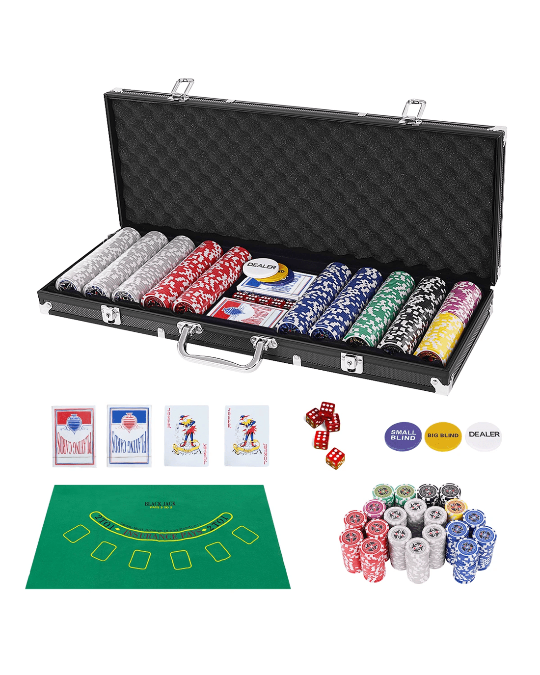 Having everything you need to host a top-notch poker night with 500 pieces of chips, 2 decks of playing cards, 5 dices, 3 poker buttons, a table cloth, and an aluminum carrying case for neat storage and transfer. 7 colors with exquisite patterns give the chips a unique and distinct look while the premium material features the chip a proper weight and touch on hand. Suitable as a gift for pros and starters of all ages to have fun, the full set of poker chips renders you unlimited thrill and fun playing Texas Holdem, Blackjack, etc.