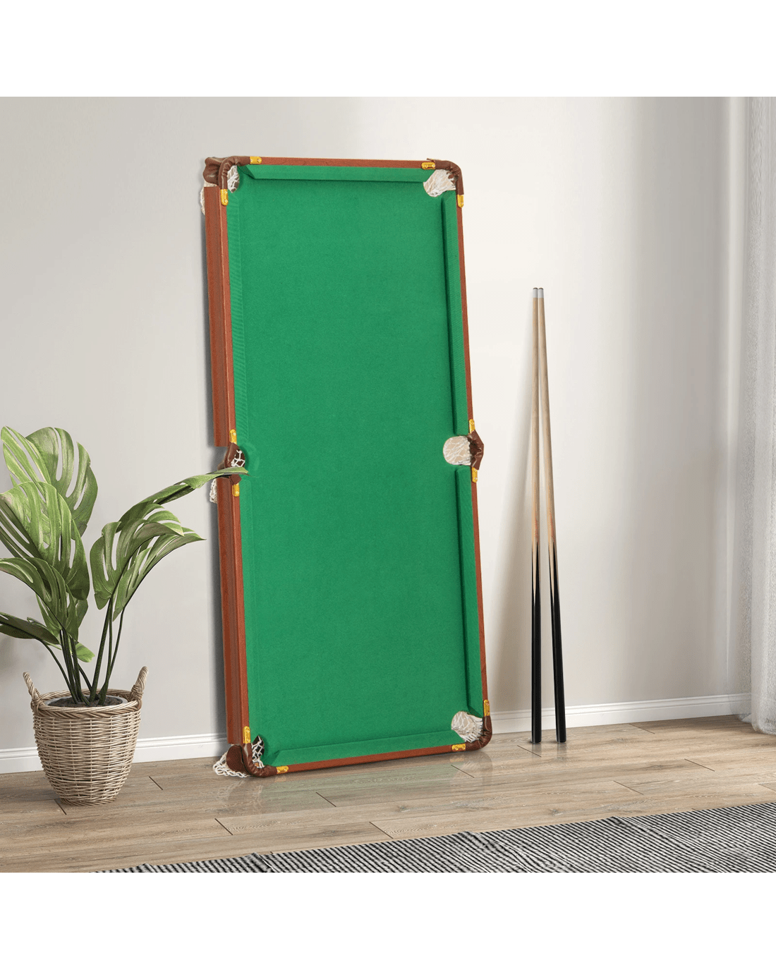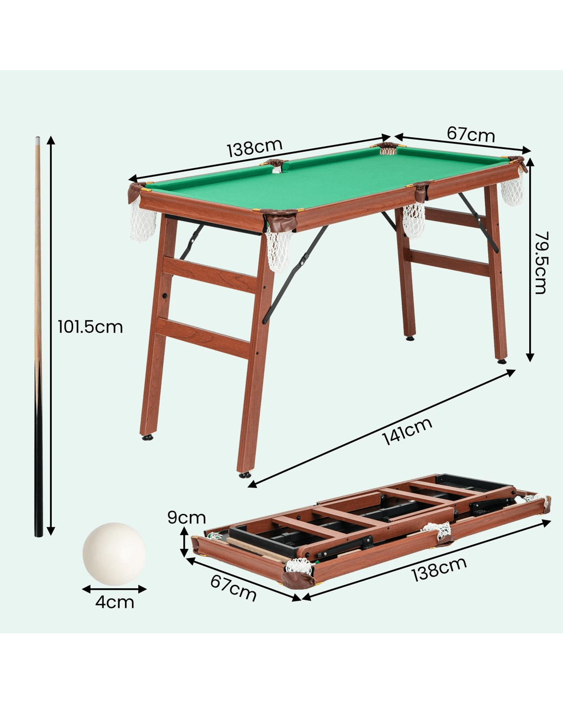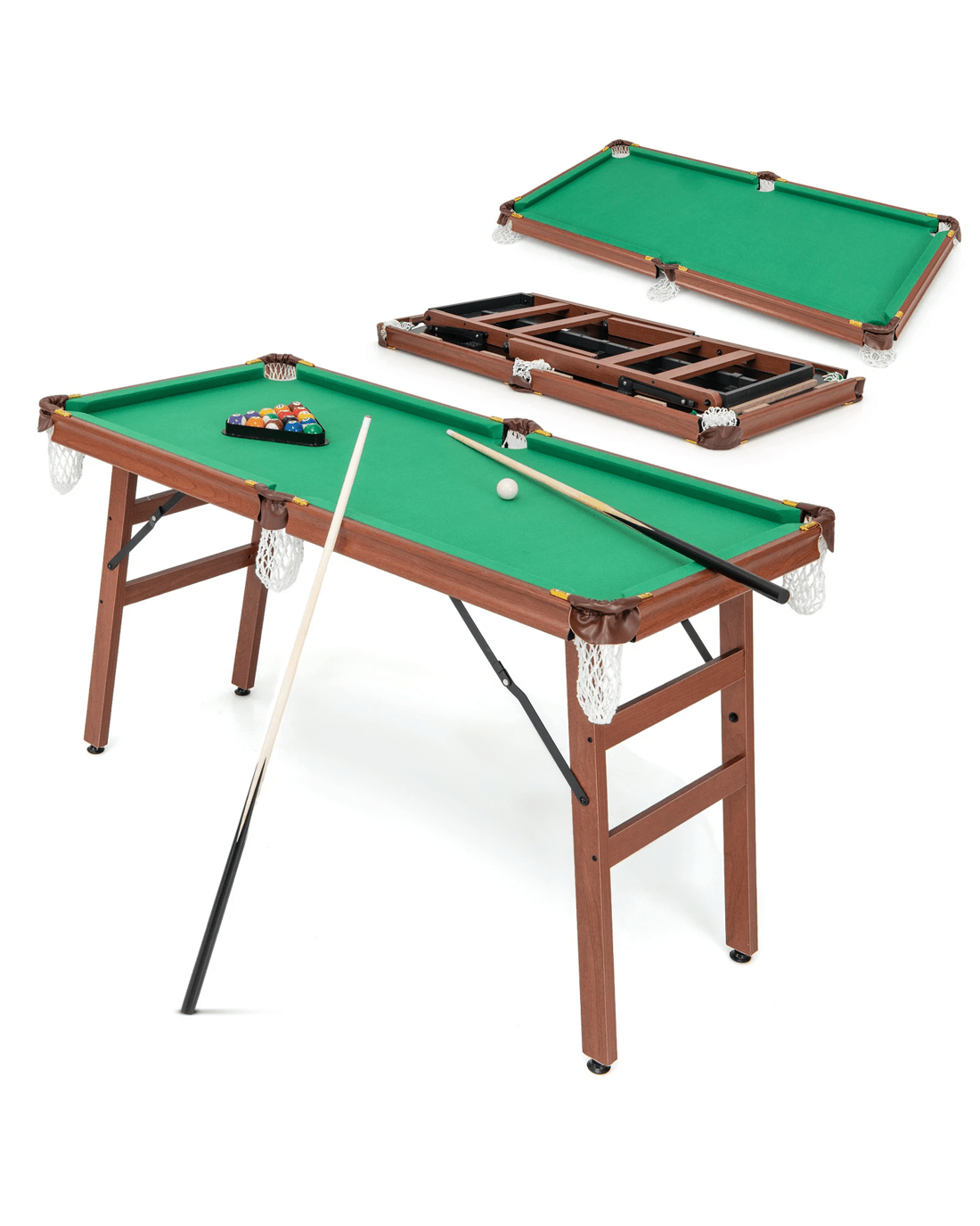 Are you tired of dealing with bulky and space-consuming pool tables? Look no further! Our pool game table features an easy folding design that allows you to fold and store it in a compact size, saving valuable room space. Whether it's a party activity, a family interaction, or a relaxation break in the office, this multifunctional billiard pool table is suitable for various occasions. Crafted with a sturdy and durable frame, including reinforced crossbars for extra stability, it ensures a reliable and enjoyable playing experience. With adjustable foot levelers, sturdy ball nets, and leather protected corners, this pool table showcases exquisite details. Plus, it comes with everything you need to start playing, including cue sticks, chalks, a brush, billiard balls, and a triangle. Upgrade your game and bring the fun to any space with our easy folding pool game table!