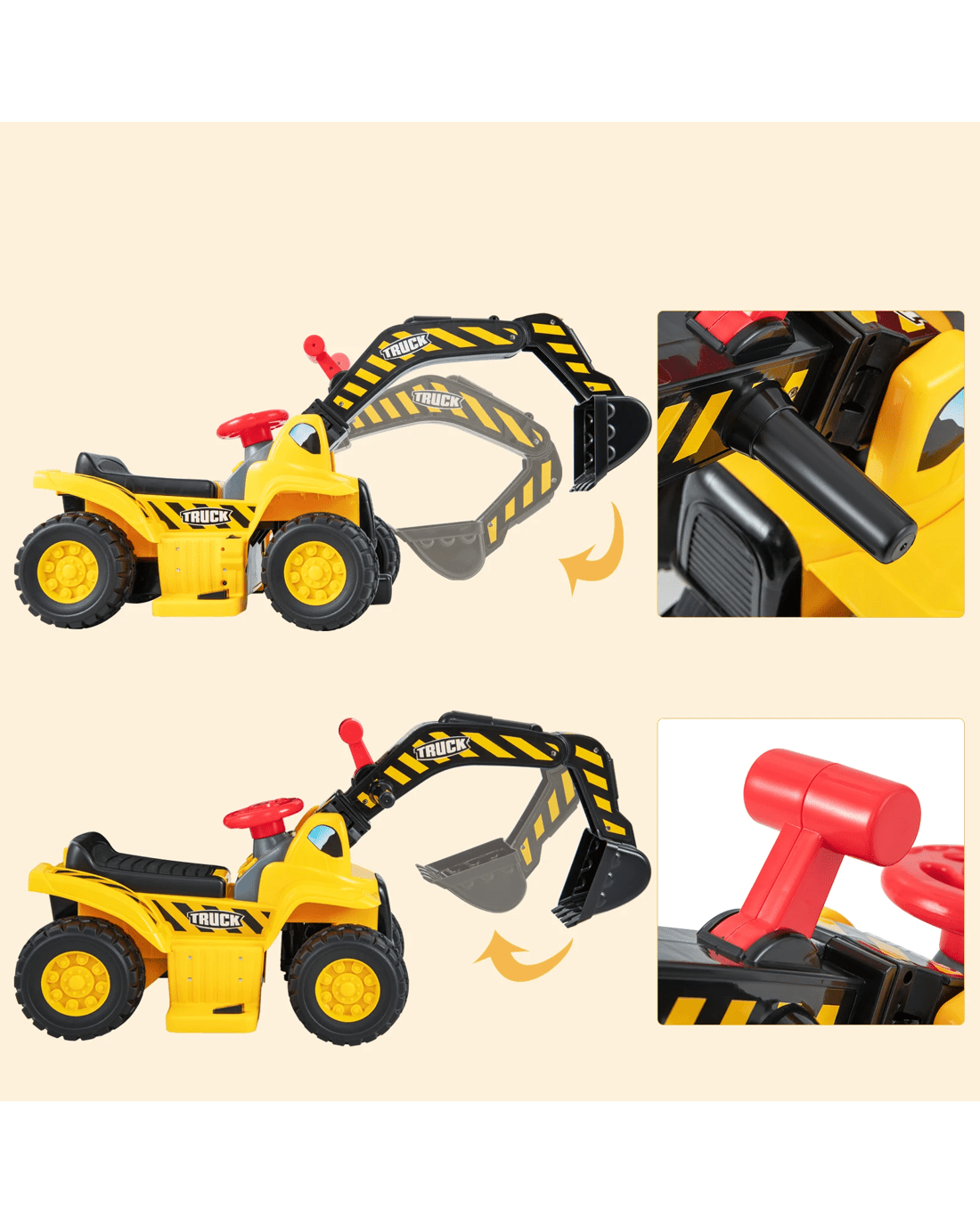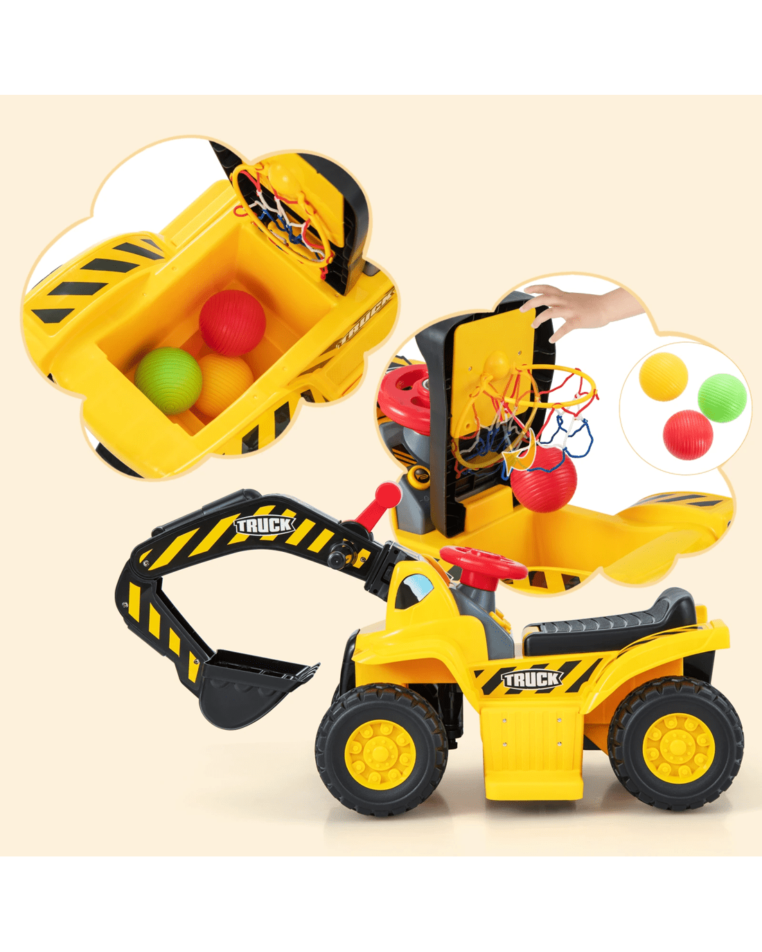 This excavator ride-on toy is the perfect gift for young adventurers who love digging fun! Constructed from safe and high-quality PP and metal materials, this little ones' ride-on car features 4 wear-resistant and non-slip wheels for a smooth and secure ride on various surfaces. Equipped with a steering wheel, easy-to-use handles, forward/backward buttons, and a foot pedal, this ride-on excavator is simple to operate for endless enjoyment. The under seat storage space offers a convenient spot to keep toys and treasures. Additionally, the folding basketball hoop and colorful balls add an extra element of playful fun. Treat your little ones to an exciting and enjoyable ride every time with this wonderful gift option!