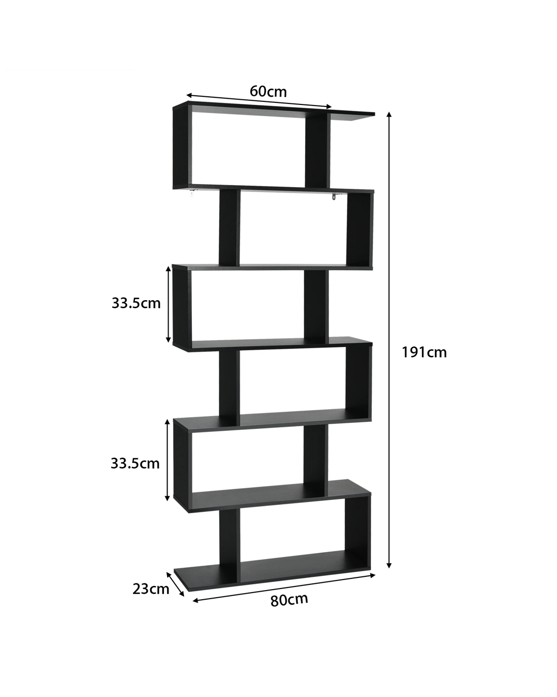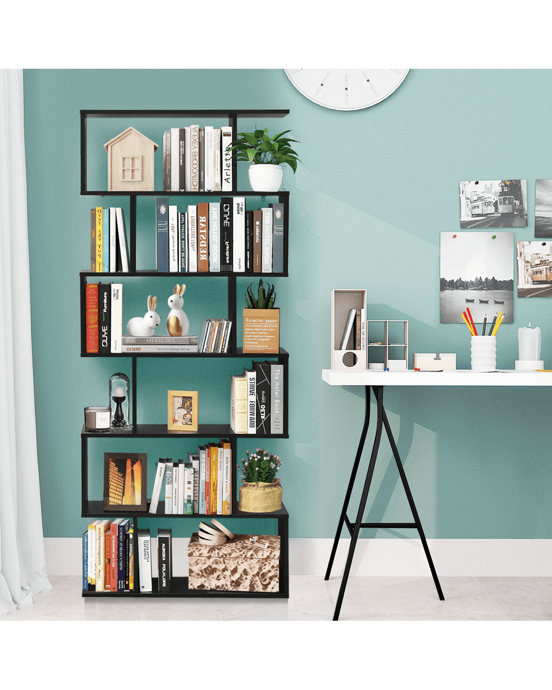 Our 6-tier bookshelf will meet your different storage needs and build a perfect condition for your home! 6 open shelves provide you with ideal storage space to hold daily items in a neat and orderly way. It is clear that reasonable space arrangement will create a well-organized room. Moreover, the stylish s-shaped design adds a refreshing feeling to your home. It can be used not only as a bookcase, but also as a display shelf and room divider. Thanks to the anti-dipping device, the bookshelf ensures a stable structure for security use. In addition, the bookcase with modern and elegant style is harmoniously combined with home decoration. Don’t hesitate to take it home!