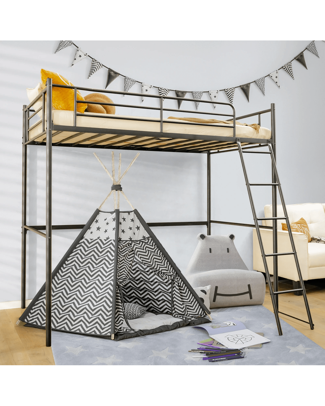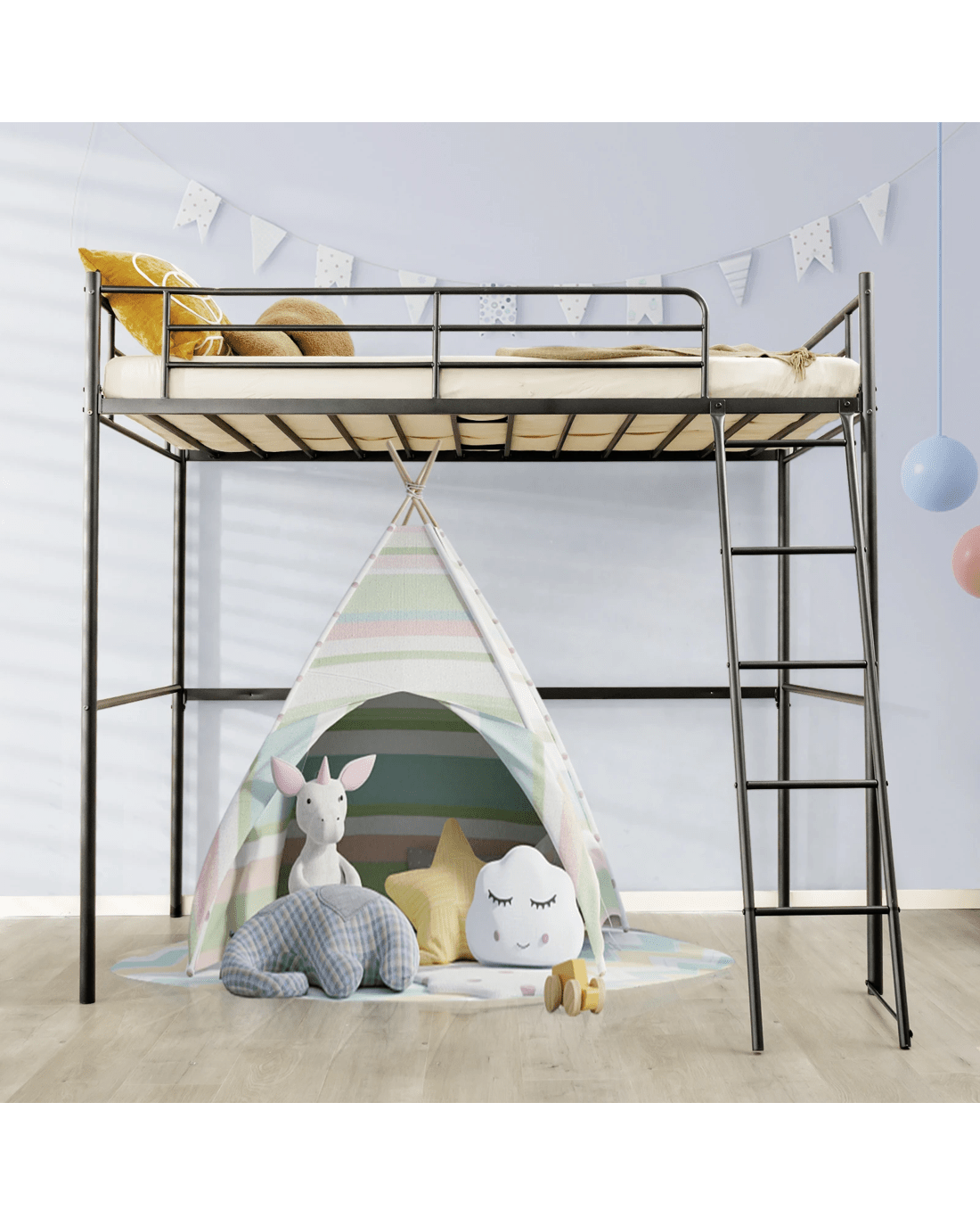This loft bed is an excellent option for rooms with limited space. It has ample floor space underneath and can support up to 150 kg thanks to its sturdy steel frame with durable connections. The rustproof surface ensures longevity. The bed is also protected by 28 cm high guardrails, providing a sense of security for a good night's sleep. Additionally, the stable ladder with a reinforced pole allows for easy access to the bed. The non-slip foot pads ensure stability and prevent floor scratches. Additionally, the smooth surface is easy to clean.