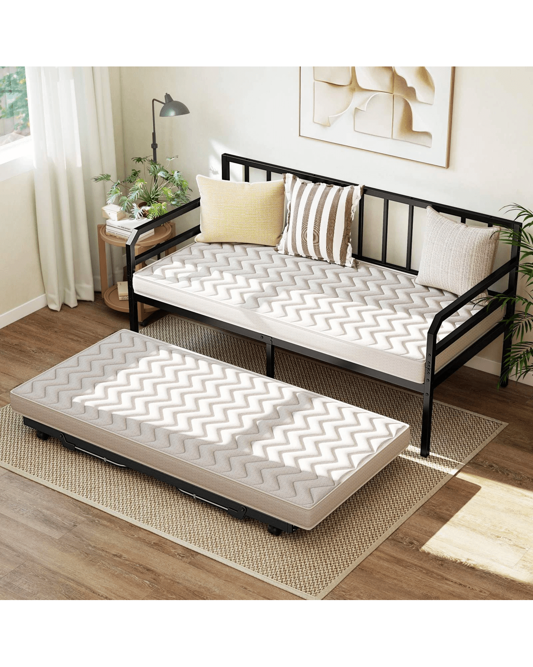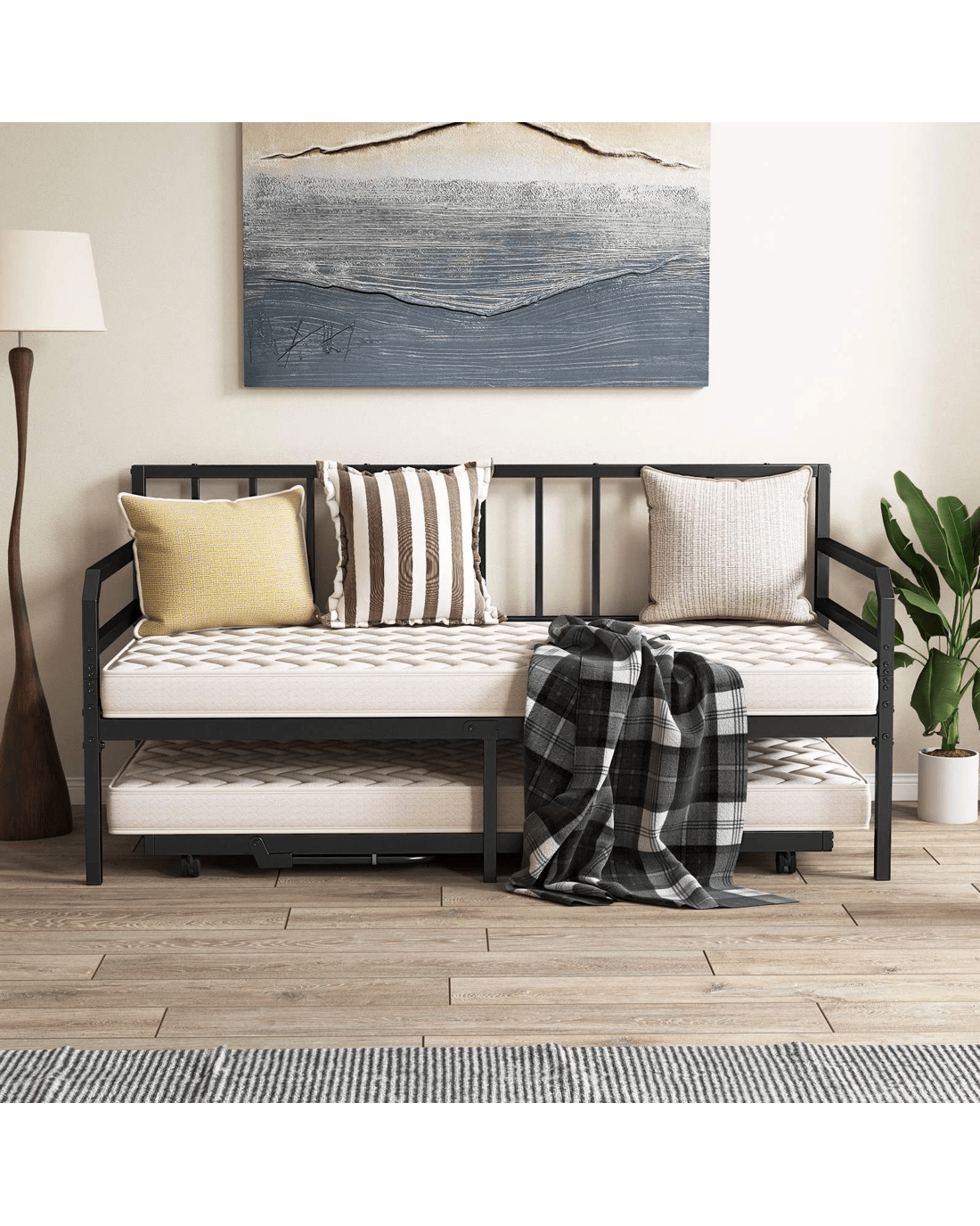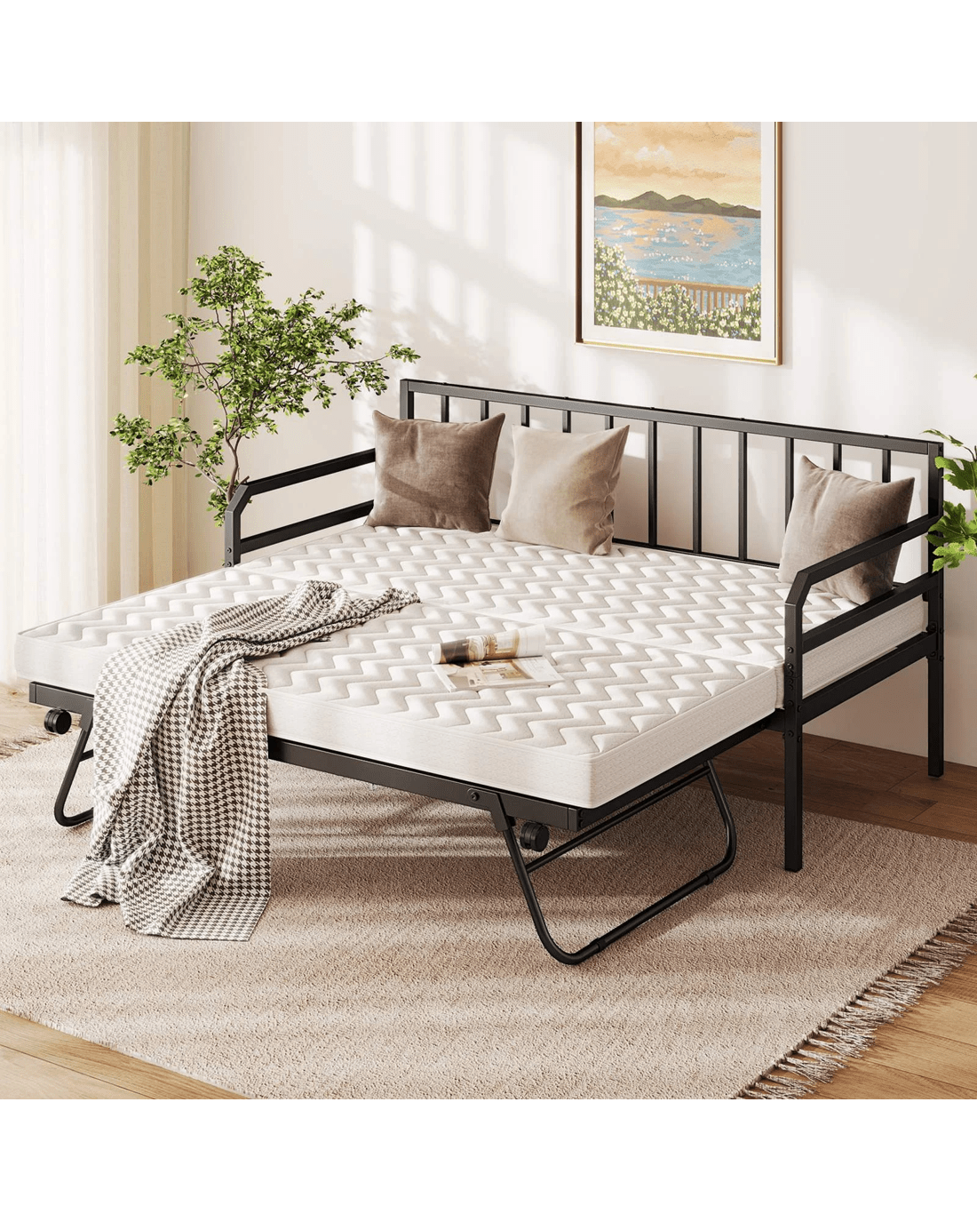 This versatile daybed doubles as comfortable seating by day and transforms into a cozy sleeping area at night with its pop-up trundle. Equipped with smooth rolling wheels, 2 with brakes, the trundle is easy to push in and pull out. Constructed from a sturdy metal frame, the sofa bed frame ensures long-lasting durability and prevents sagging. Besides, security handrails with smooth, rounded edges add extra comfort and protection. Perfectly combining functionality with style, this daybed adapts seamlessly to your various needs.