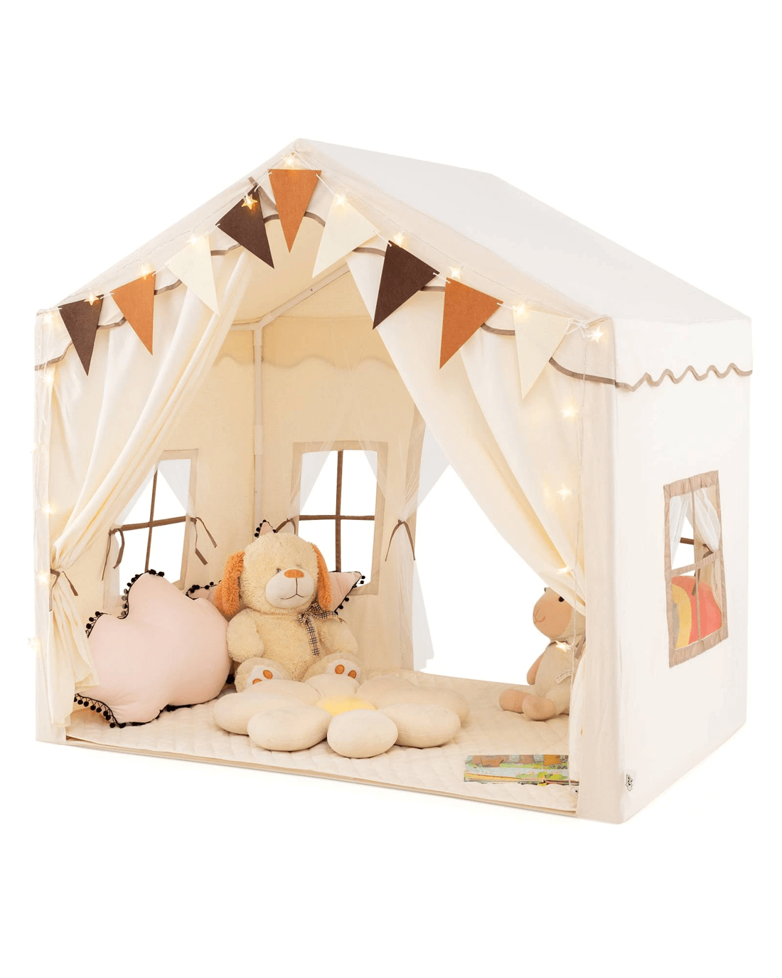 Are you looking for a versatile and engaging play tent for your little ones? Look no further! Our little one-friendly play tent features 2 opening door that allows little ones easily access from the front and back. With a large playing space accommodating 3-4 little ones and a little ones' bed up to 125 cm wide, this tent creates a cozy and private room for endless fun. Meanwhile, this enjoyable little one play house comes with star lights and colorful pennant banners, offering endless fun to your little ones. The comfortable padded mat is soft and breathable for safe play, you can easy to clean it with a washing machine. This play house can be an ideal choice for little ones aged 3+.
