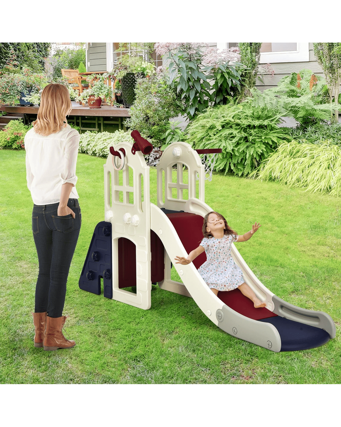 With an extra long and wide slide, a climber, a tunnel, a basketball hoop and a telescope, your little ones will have hours of fun in different playing areas. Besides, the rocking climbing panel and 3-step ladder increase fun and convenience. Made of The high-quality HDPE material, wide base and triangular construction make this slide sat with great stable and secure enough for little one's use. More importantly, the enhanced handrails of the slides and the waiting zone maximize security. This climber and slide set is applicable for little ones aged from 3 to 8.
