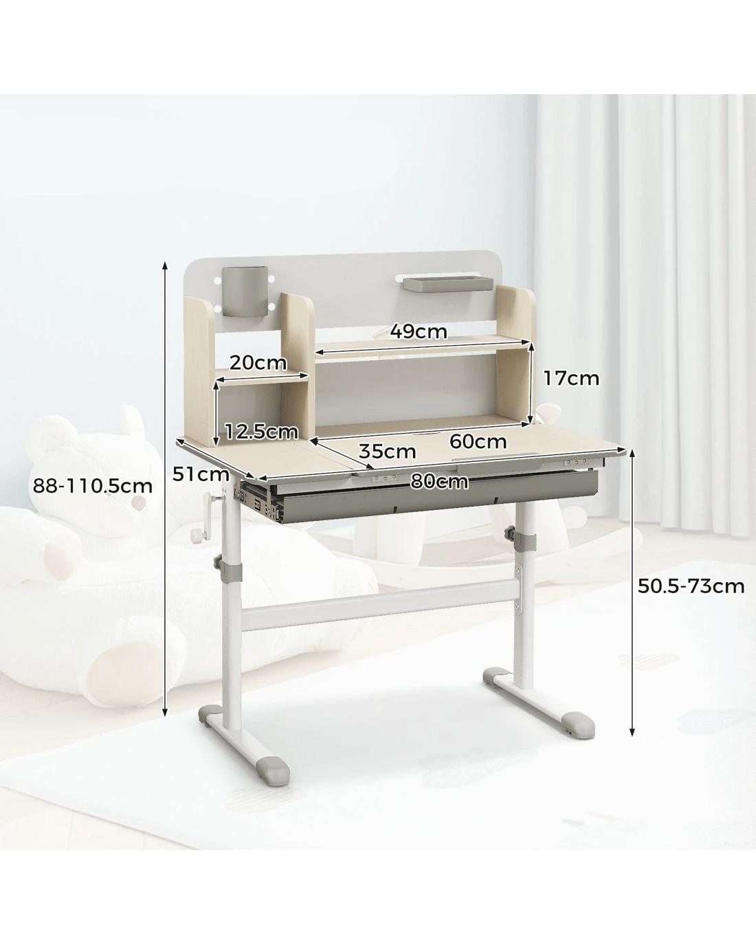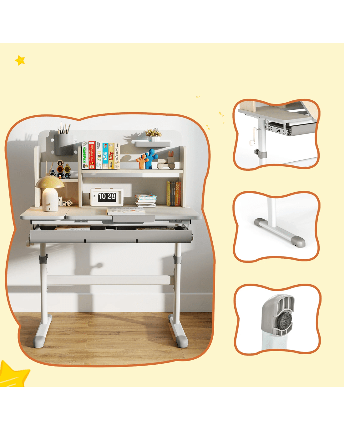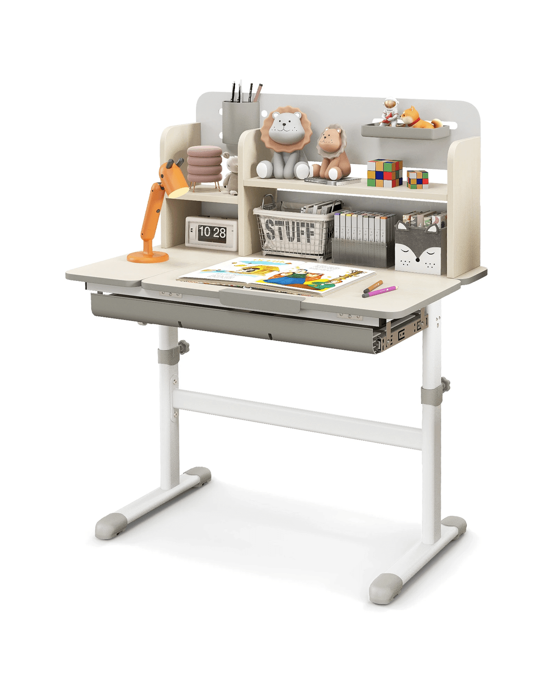 This adjustable little ones study desk is an ideal gift for your growing little one! This height-adjustable desk is suitable for little ones aged 3-12 years, ensuring that it adapts to your little one's development through the years. The tilt desktop with 0°-60° adjustable angle encourages proper posture, making reading, writing, and drawing more comfortable. A built-in scale ruler along the desk edge makes it convenient for little ones to measure while they do homework. Besides, designed with a hutch, a large drawer, a pen holder and a small tray, the writing desk provides a perfect storage solution and keeps the study area tidy. The durable materials and sturdy construction ensure years of reliable use, while the smooth round corners enhance security.