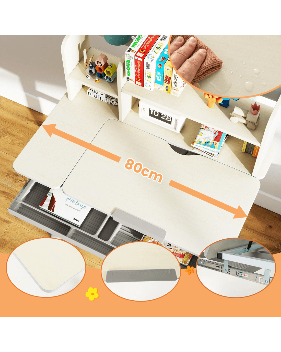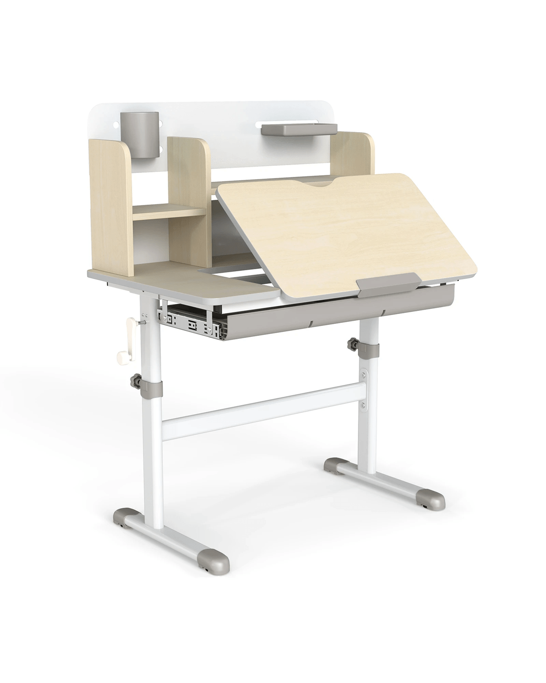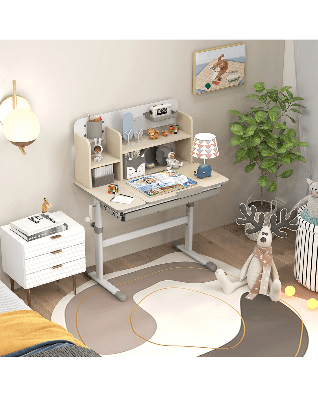 This adjustable little ones study desk is an ideal gift for your growing little one! This height-adjustable desk is suitable for little ones aged 3-12 years, ensuring that it adapts to your little one's development through the years. The tilt desktop with 0°-60° adjustable angle encourages proper posture, making reading, writing, and drawing more comfortable. A built-in scale ruler along the desk edge makes it convenient for little ones to measure while they do homework. Besides, designed with a hutch, a large drawer, a pen holder and a small tray, the writing desk provides a perfect storage solution and keeps the study area tidy. The durable materials and sturdy construction ensure years of reliable use, while the smooth round corners enhance security.