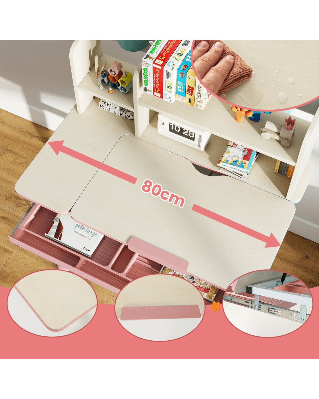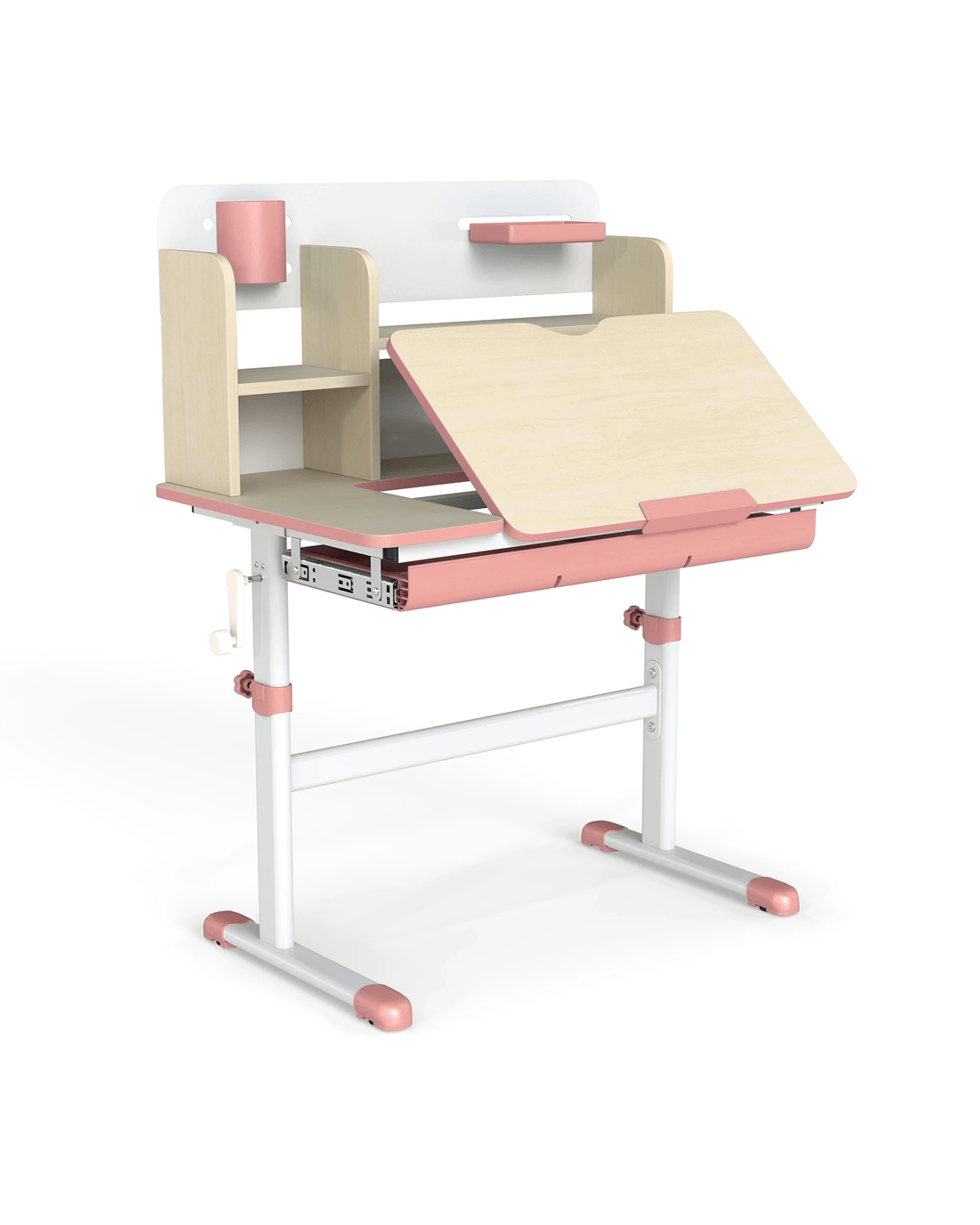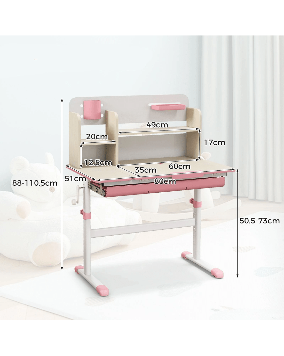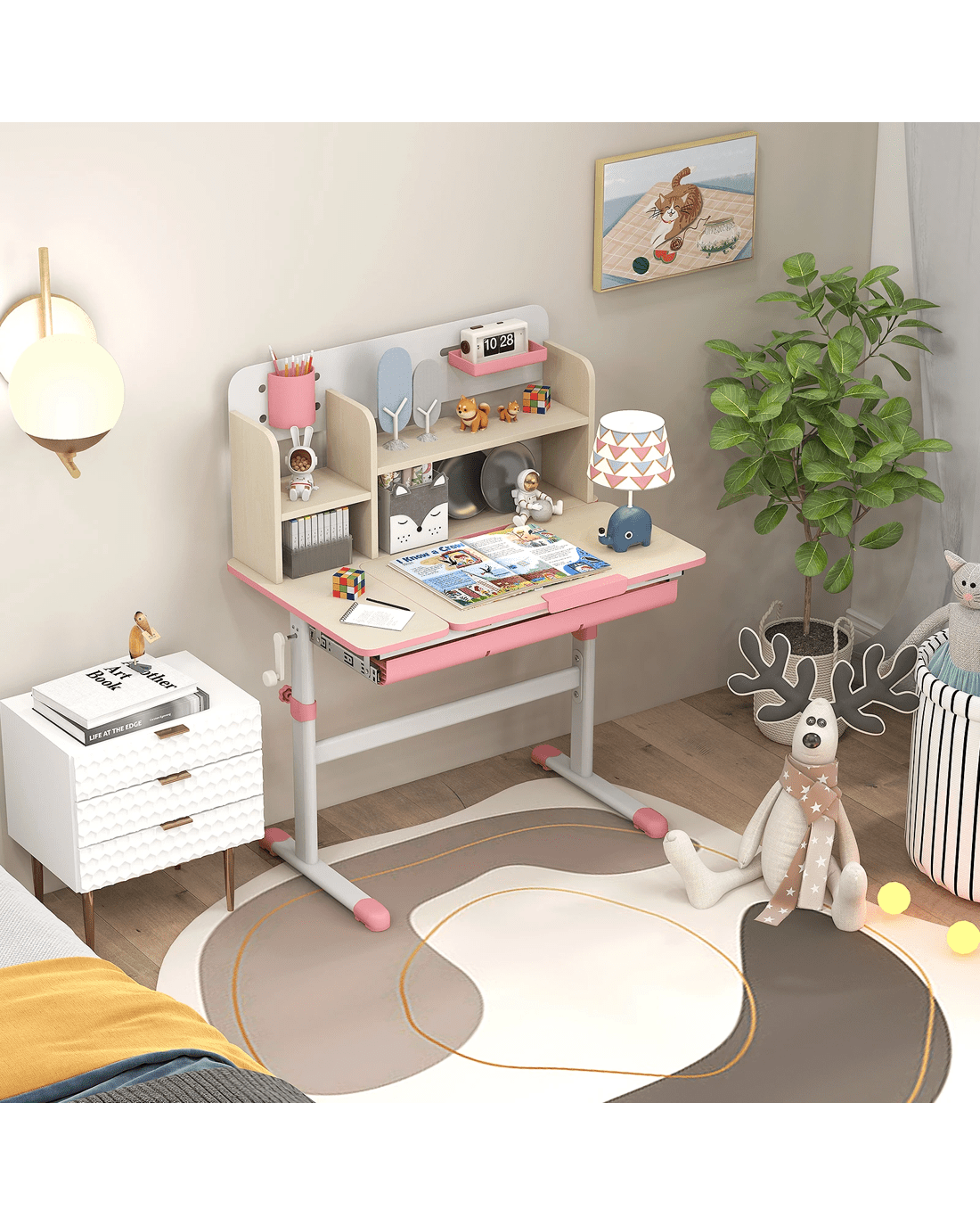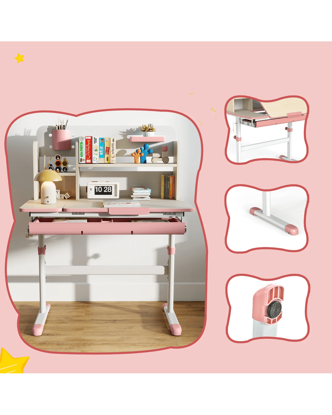 This adjustable little ones study desk is an ideal gift for your growing little one! This height-adjustable desk is suitable for little ones aged 3-12 years, ensuring that it adapts to your little one's development through the years. The tilt desktop with 0°-60° adjustable angle encourages proper posture, making reading, writing, and drawing more comfortable. A built-in scale ruler along the desk edge makes it convenient for little ones to measure while they do homework. Besides, designed with a hutch, a large drawer, a pen holder and a small tray, the writing desk provides a perfect storage solution and keeps the study area tidy. The durable materials and sturdy construction ensure years of reliable use, while the smooth round corners enhance security.
