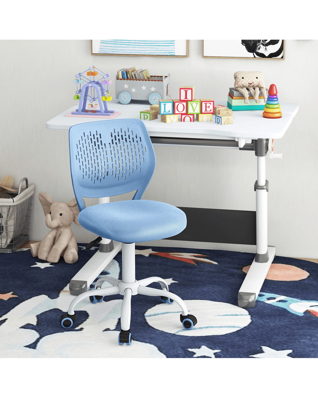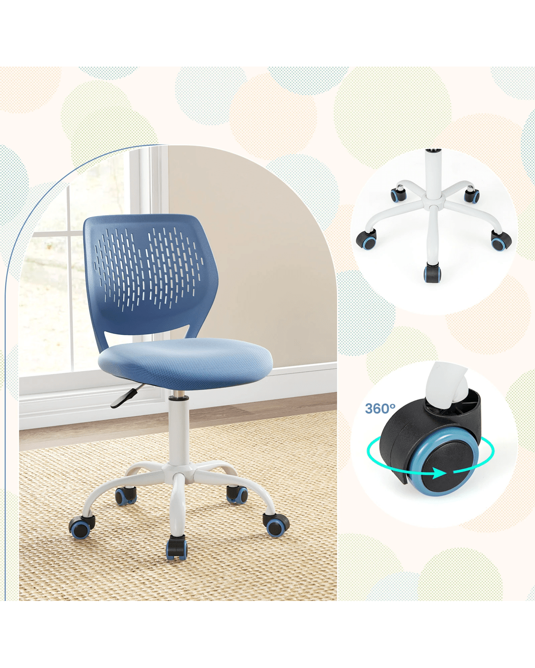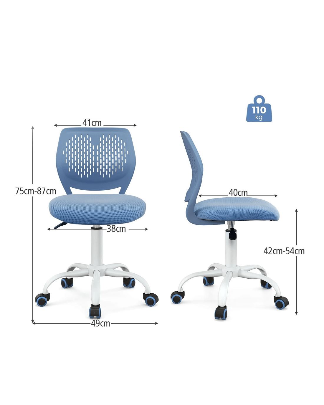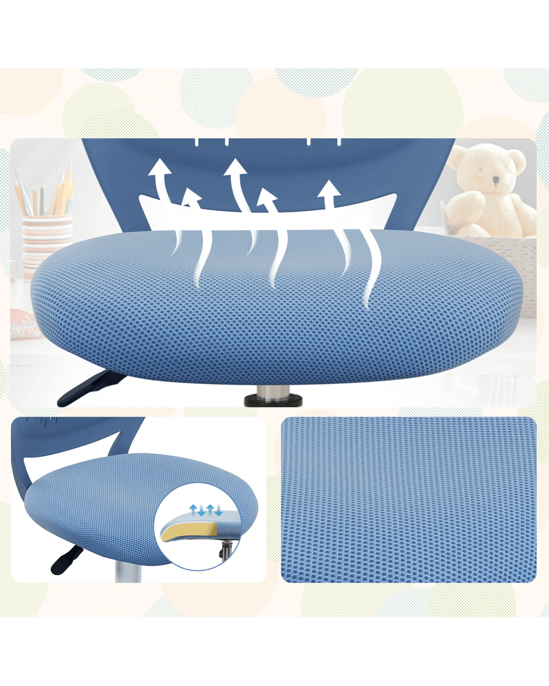 The ergonomic backrest perfectly fits little user's body curve and develops good sitting posture. More, 12cm seat height adjustment is capable of catering to people of different ages and heights. Breathable mesh backrest and seat promote air flow and circulation. Stuffed with high density sponge, the seat cushion offers more comfortable feeling. In addition, reinforced frame, durable PU casters and 5-claw base are all in one chair, with good quality and high reliability.