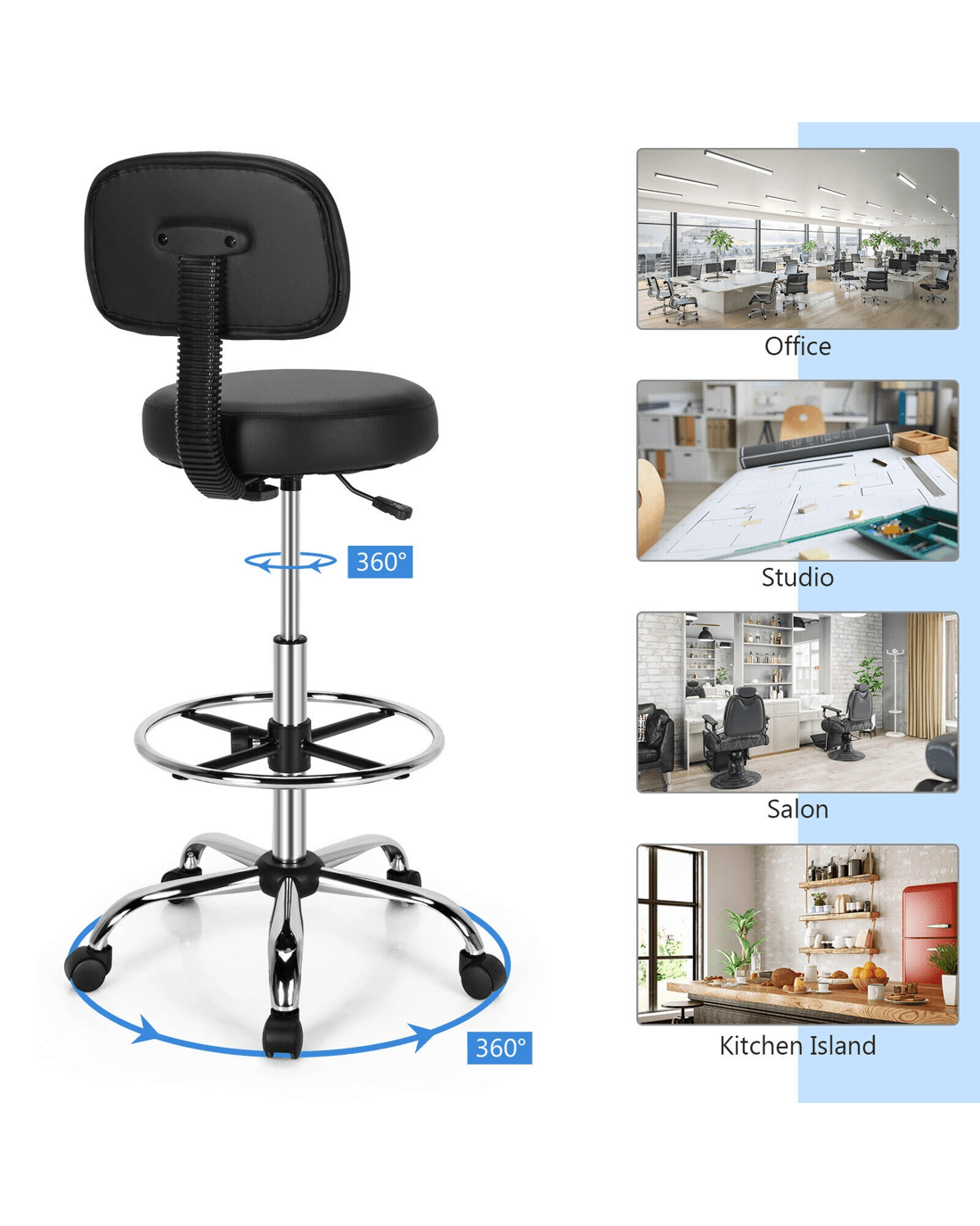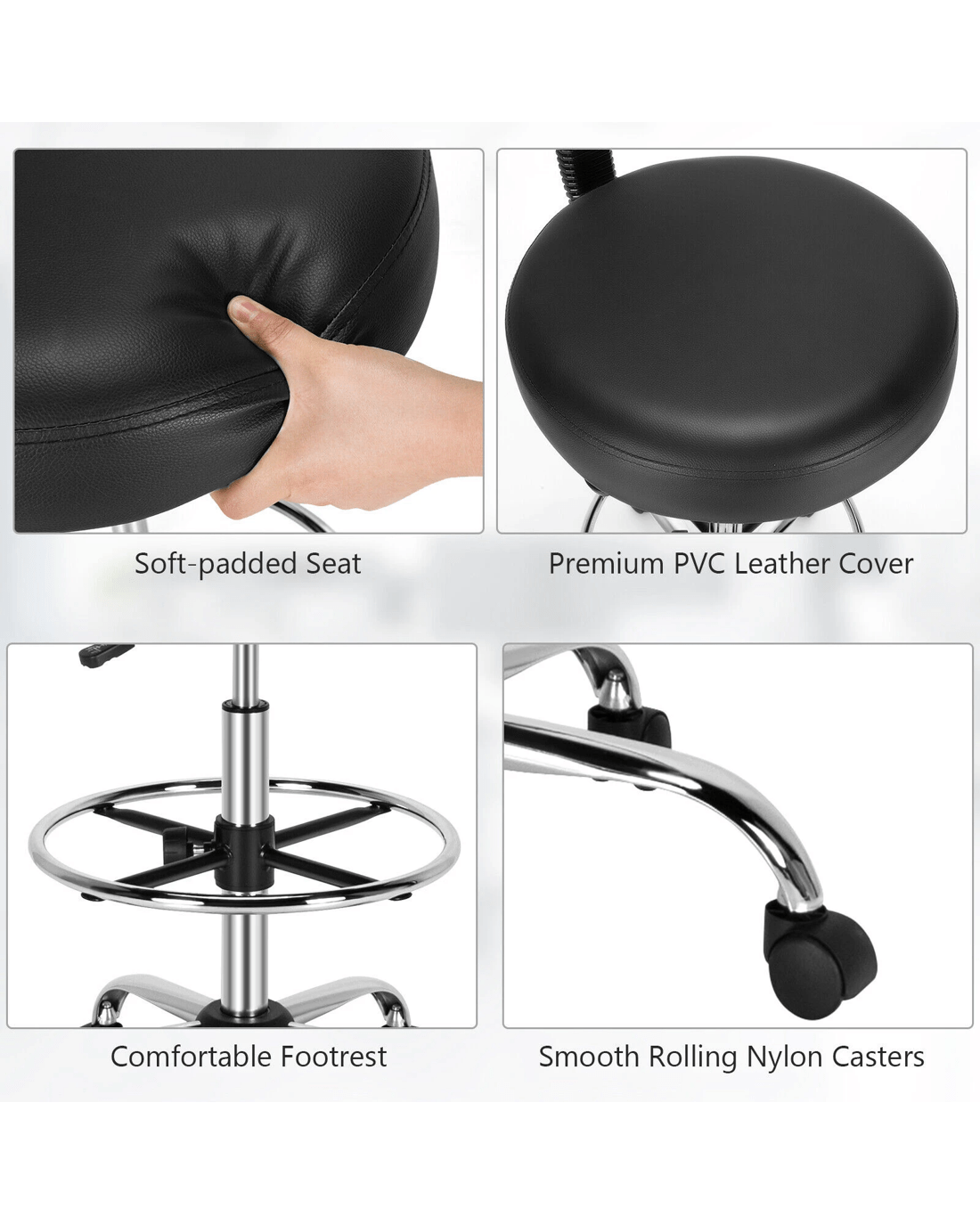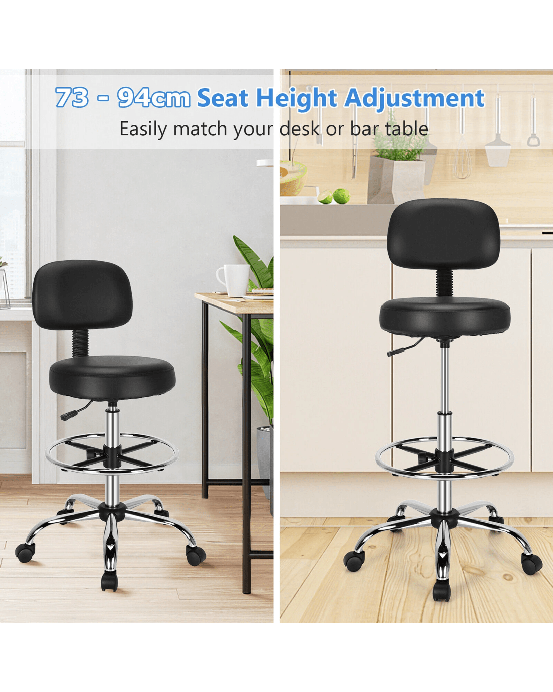 And our adjustable drafting chair may just meet your requirements. This chair is fully adjustable, can fit your sitting posture well and give you comfortable support. With the support of high-quality pneumatic rod, the seat can be adjusted up and down about 21 cm to adapt to the height of the table. Besides, the backrest can be adjusted back and forth to fit your back and the footrest can also be adjusted up and down. In addition, the chair also boasts comfortable seat padded with high-density sponge and covered with high-quality PVC leather. What’s more, the heavy-duty 5-claw base fitted with smooth rolling casters ensures a stable structure and flexible movement.