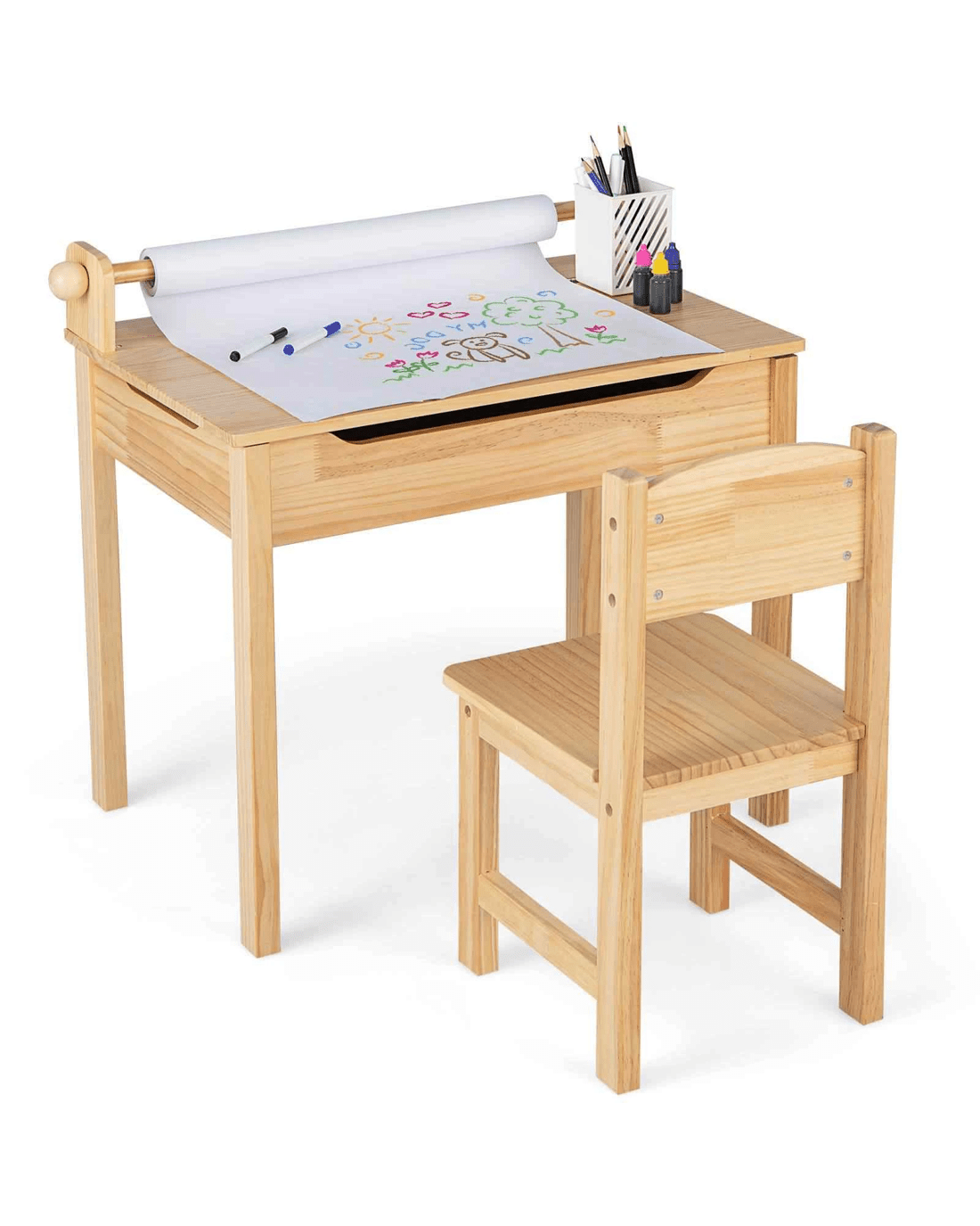This activity table and chair set will be a great gift choice for your growing little ones!This table and chair set helps to create a comfortable environment for little ones to enjoy various activity, ideal as a gift. The paper roll holder is designed to hold the paper roll and you can easily remove it for replacement. The tabletop is also built with a pen slot. Open the tabletop, the inside space is roomy enough to store often-used stationary, books, painting tools and more. The cutout handles can prevent hands from getting injured when closing the tabletop. Made of solid wood and high quality MDF material, this little ones table and chair set is durable for long term use.