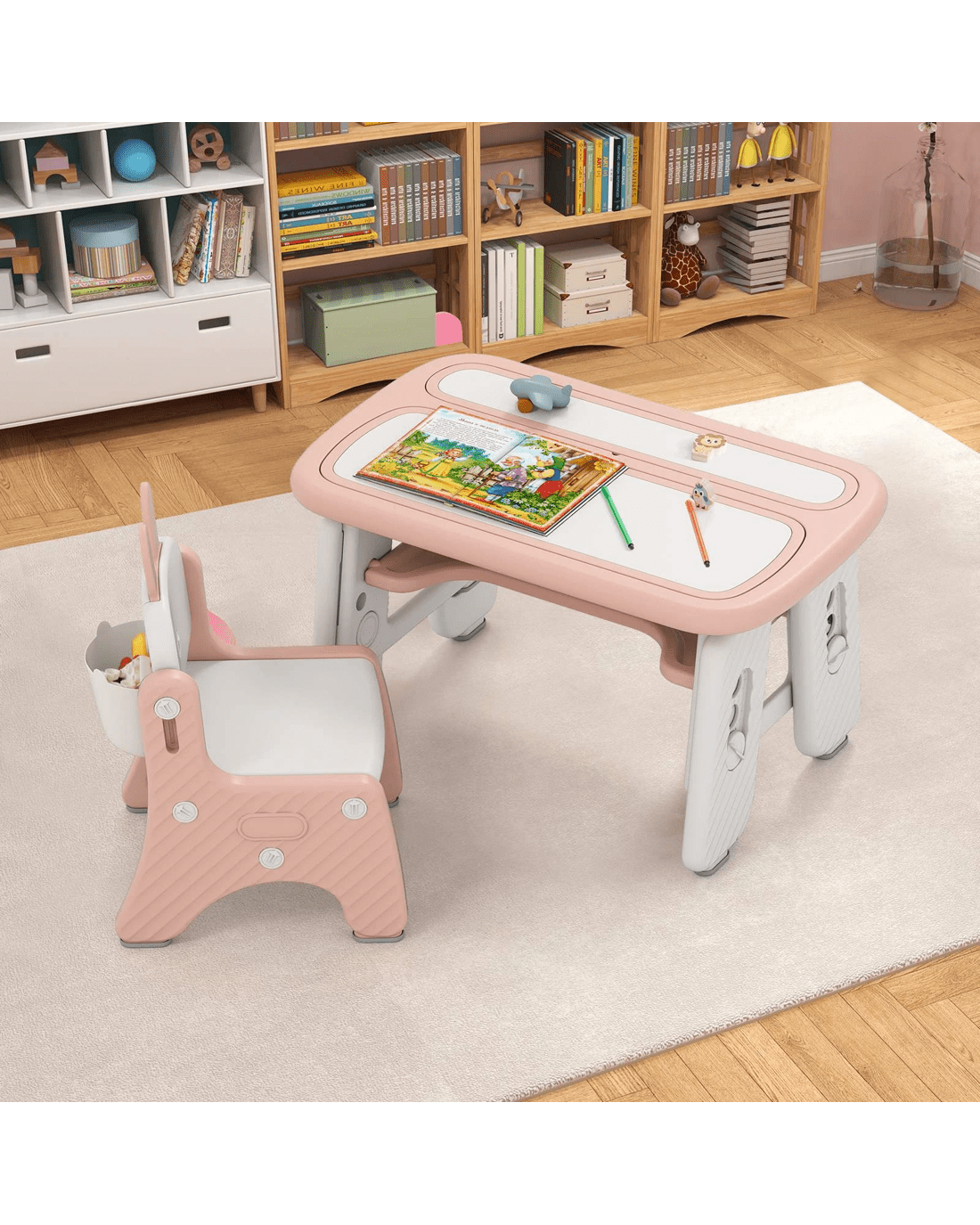 The tabletop consists of 2 erasable and useful drawing boards, and they can be used as book shelves too. So,little ones can develop a good posture for reading, painting and writing. Plus, the table has 3 adjustable heights to meet the needs of growing little ones. Designed with pen slots, a storage shelf and a storage box, this furniture set helps to keep your stationary, painting essentials, books, toys well organized, suitable for home, kindergarten, daycare and more.