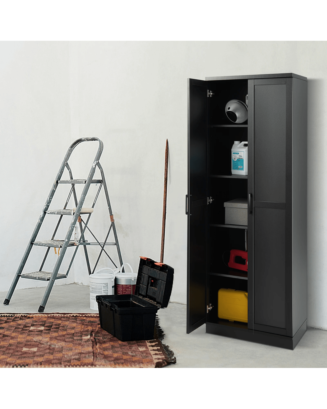 Our multifunctional storage cabinet provide you with a great storage solution to keep your home neat and clean! It is designed with 3 fixed shelves and 2 adjustable shelves, allowing you to customize the storage space and classify the household sundries. In addition, with high-quality material and good workmanship, the multifunctional storage organizer is rather durable and enjoy a strong load-bearing capacity of 150 kg. Moreover, with the anti-toppling device, you don't need to worry about the cabinet's tipping over. Meanwhile, the surface is smooth and easy to clean for your convenience. You can use this cabinet in your bedroom, kitchen, laundry room, garage, etc.