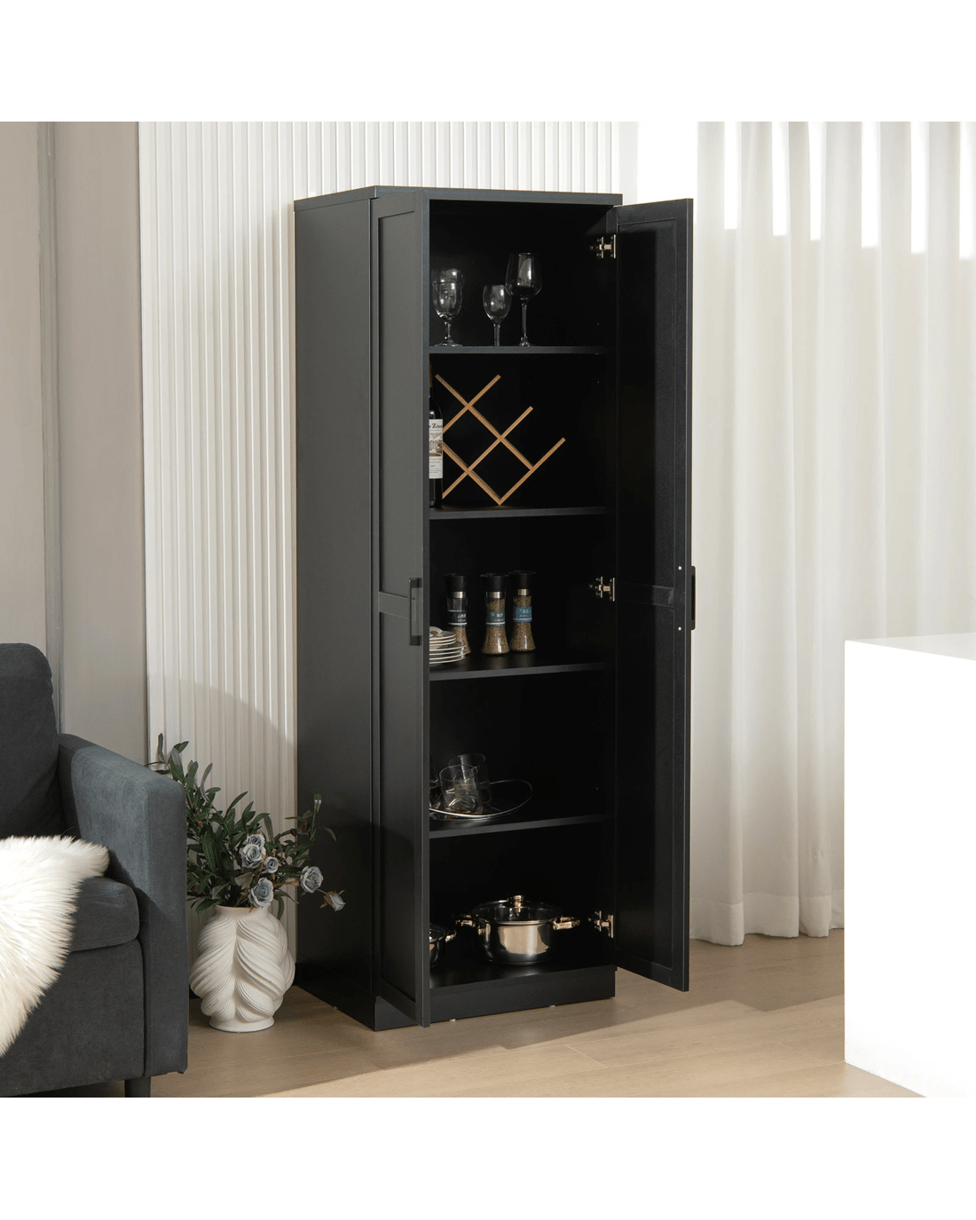 The storage cabinet with a tall and slim profile is suitable for different rooms