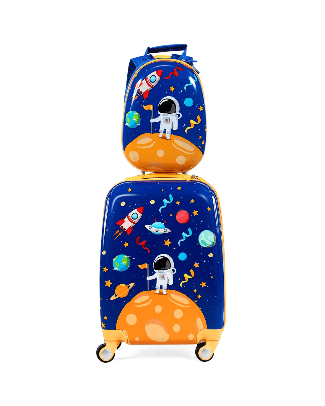 Our luggage set designed especially for little ones, it includes a suitcase and a backpack, cartoon pattern backpack, cute fashion, can be used as a separate backpack, little ones can use as a schoolbag when they go to school. The luggage set was created with the unique characteristics of little ones in mind, as it incorporates several design features that benefit little ones. These beautiful cases have cute lovely astronaut pattern specially printed onto their hard shell surfaces, which little ones will like it. The lightweight is not overly heavy and the little ones can use independently with adequate capacity. And the selected high quality ABS plastic especially and polycarbonate makes our luggage set has a better performance of anti-vibration and pressure resistance. 3 levels adjustment adjustable aluminum alloy tie rod and design to fit little ones' palms. Our trolleys and backpacks can accompany your little one for a long time. Don't hesitate, come buy it. Let the little ones travel happily.
