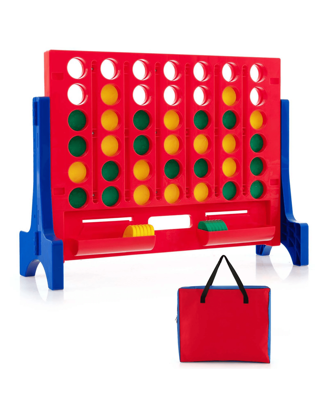 This versatile and interactive family game can be mounted on the wall or placed on the tabletop, offering endless entertainment and laughter for adults and little ones alike. The objective of the game is simple: players take turns dropping chesses into the slots, aiming to be the first to connect four in a row horizontally, vertically, or diagonally. And it is easy to reset the game. The set includes a sturdy game board, 42 colorful chesses, 2 drawstring bags and a convenient carrying bag. Whether you're hosting a family game night or a backyard party, this giant 4-in-a-row game is the perfect game to bring family and friends together.