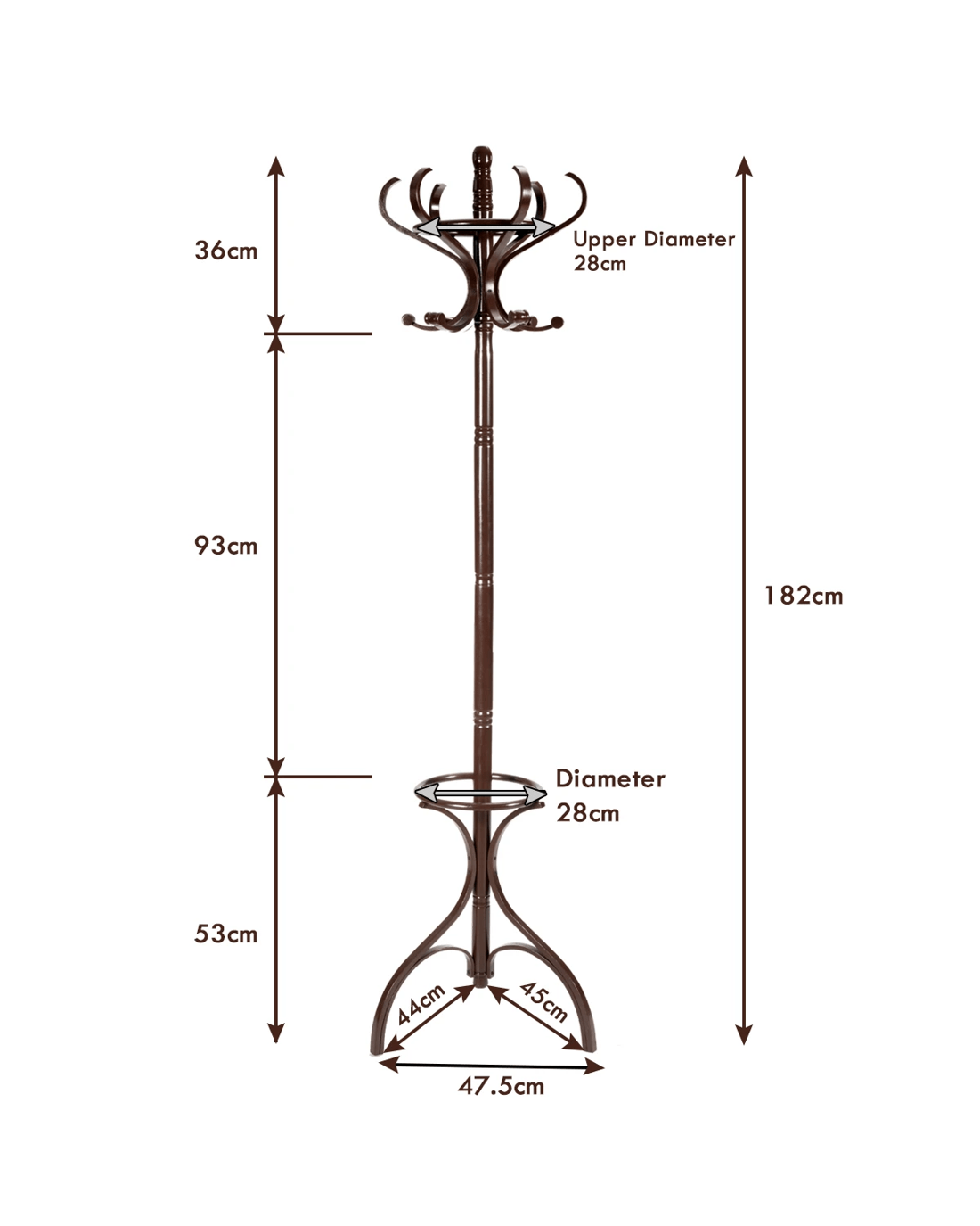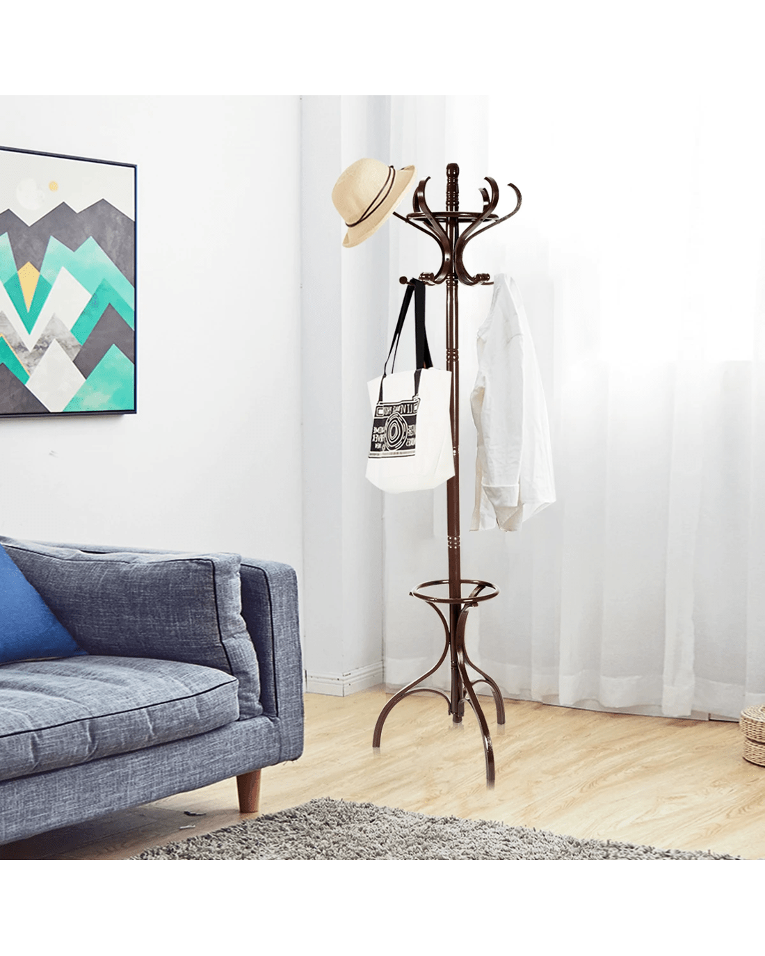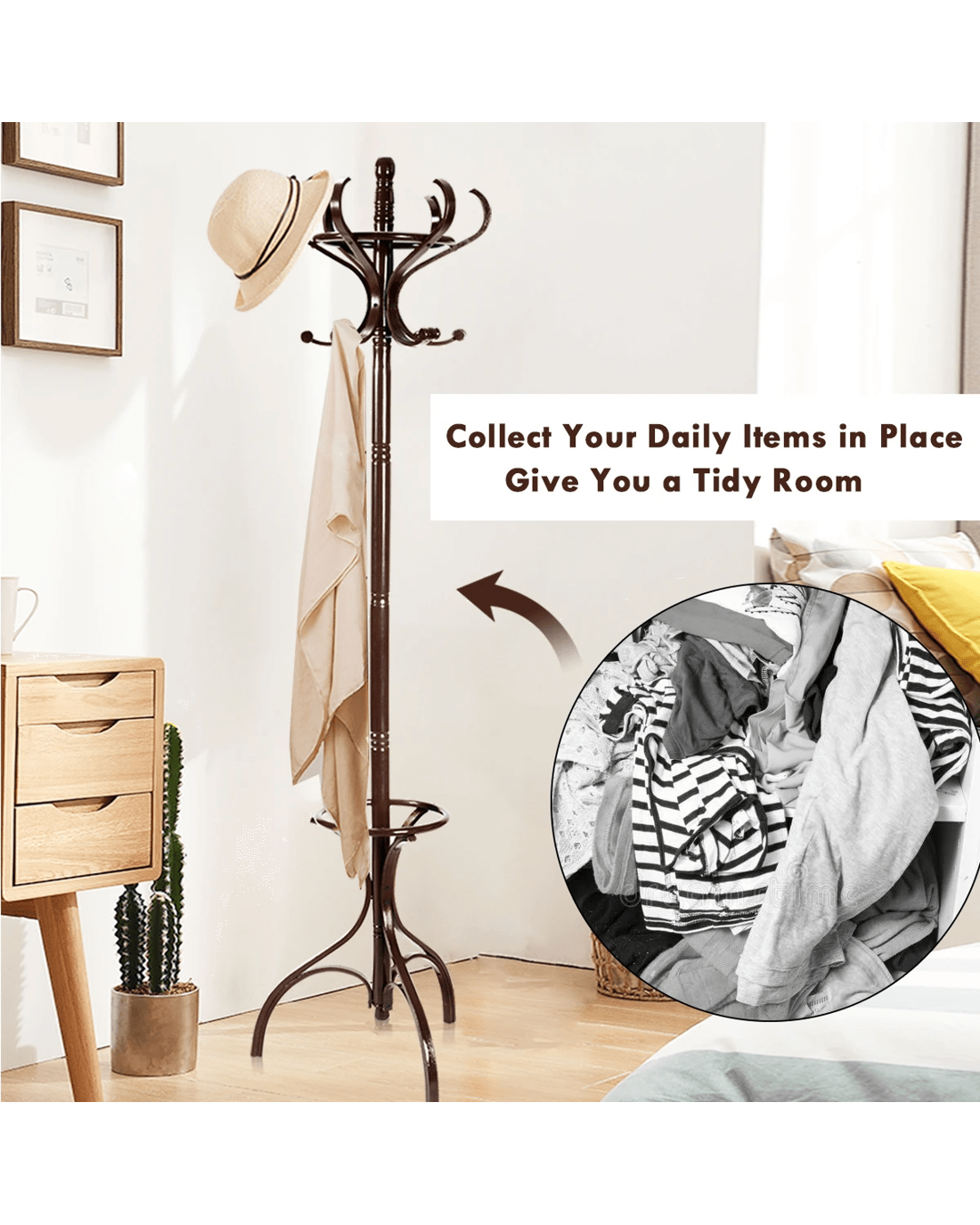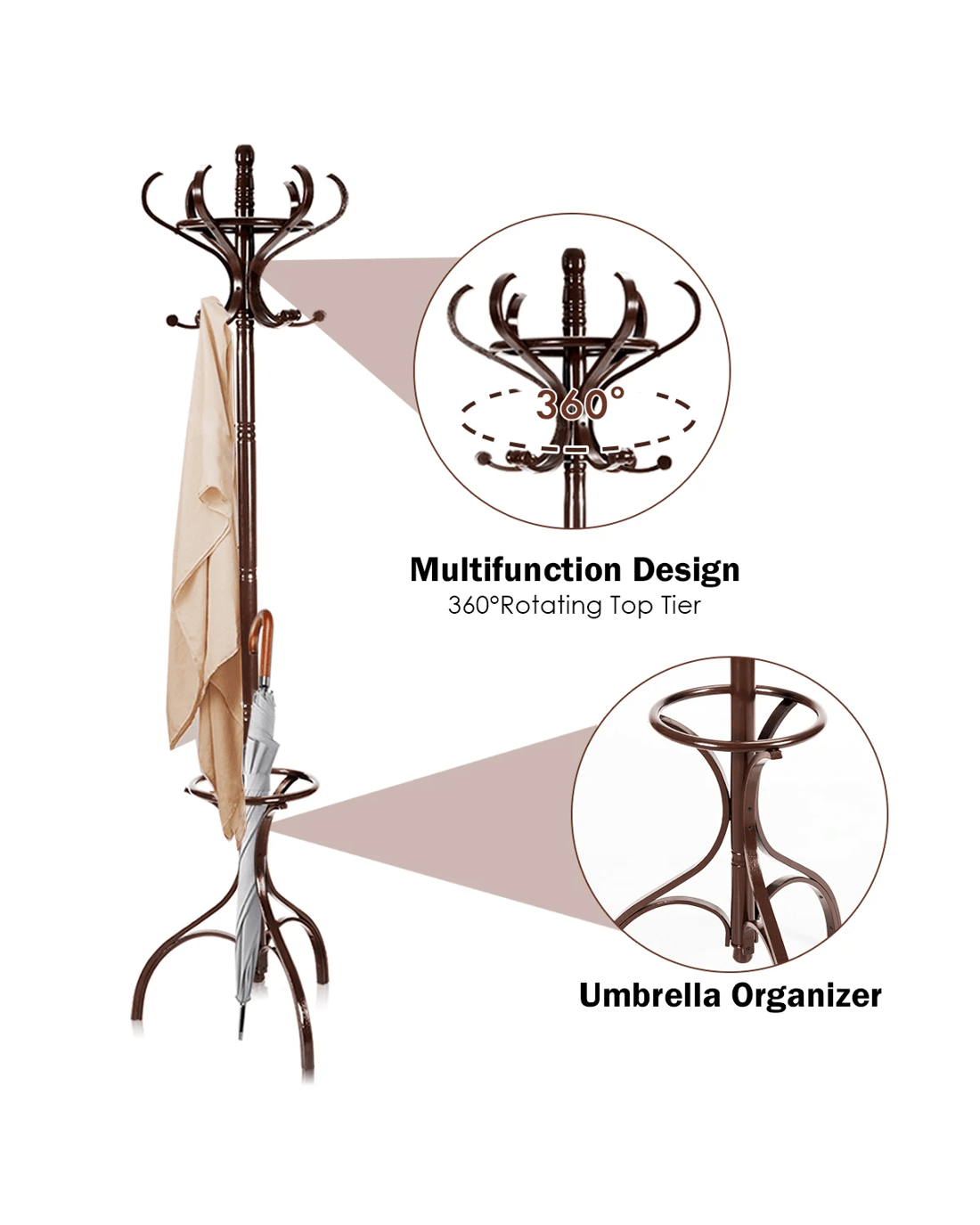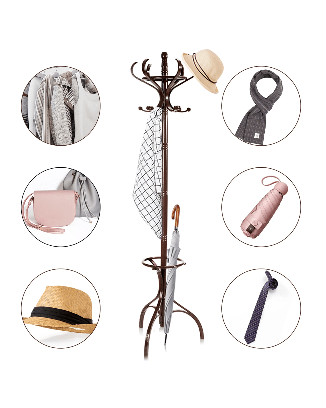 This is our new clothes bag hanger, which is a perfect solution to conveniently storage your bag, hat or clothes. In order to hold perfectly in place, the coat rack has been designed with triangular base, improving the stability and balance and avoiding wobbling. Our flexible top hanger can be rotated 360 degrees, so you can fetch everything easily. Besides, the lower part is hollow out design of umbrella stand. No worry about assembly thanks to simple structure and detailed manual. It is perfect to add a touch of style to your entrance way.