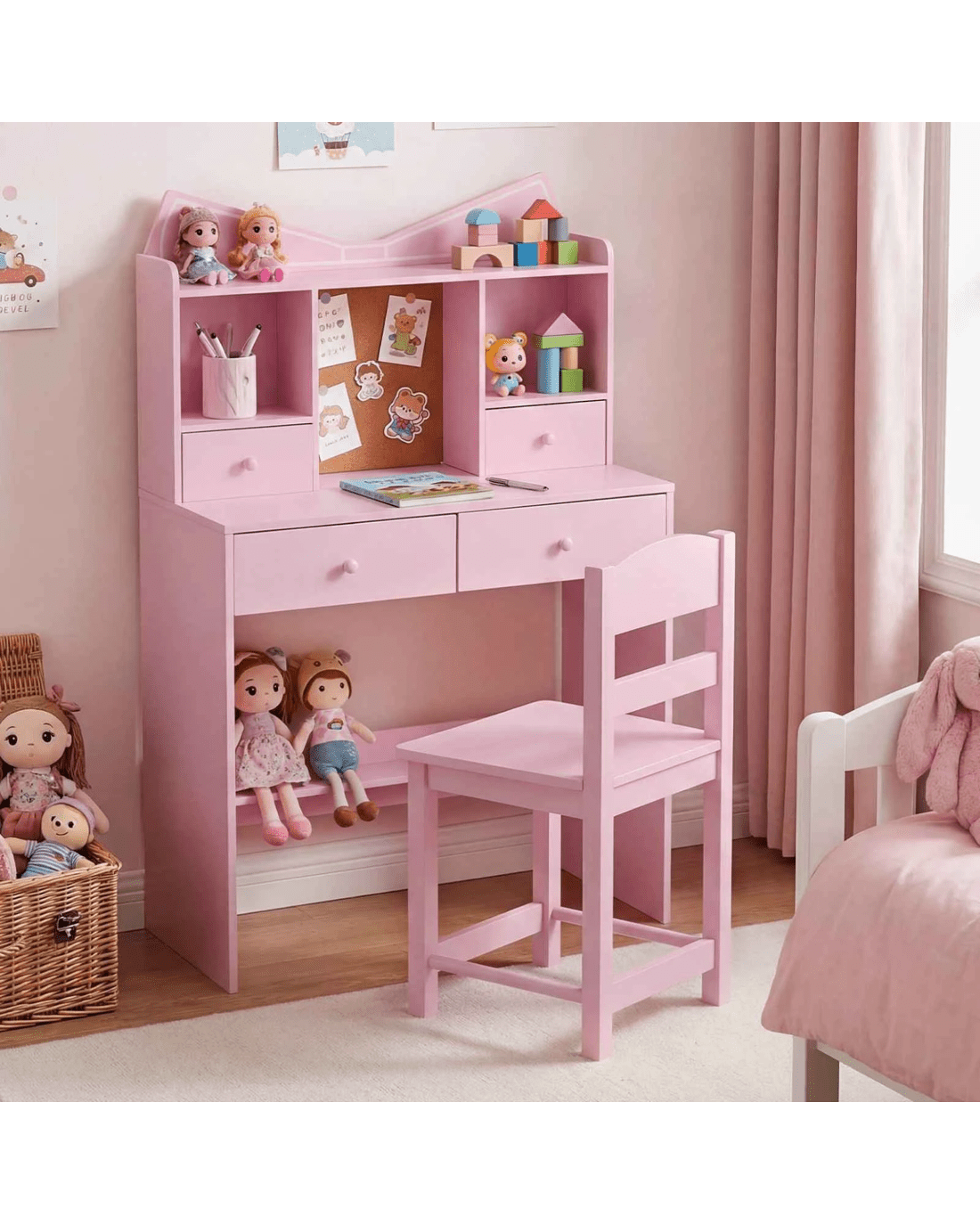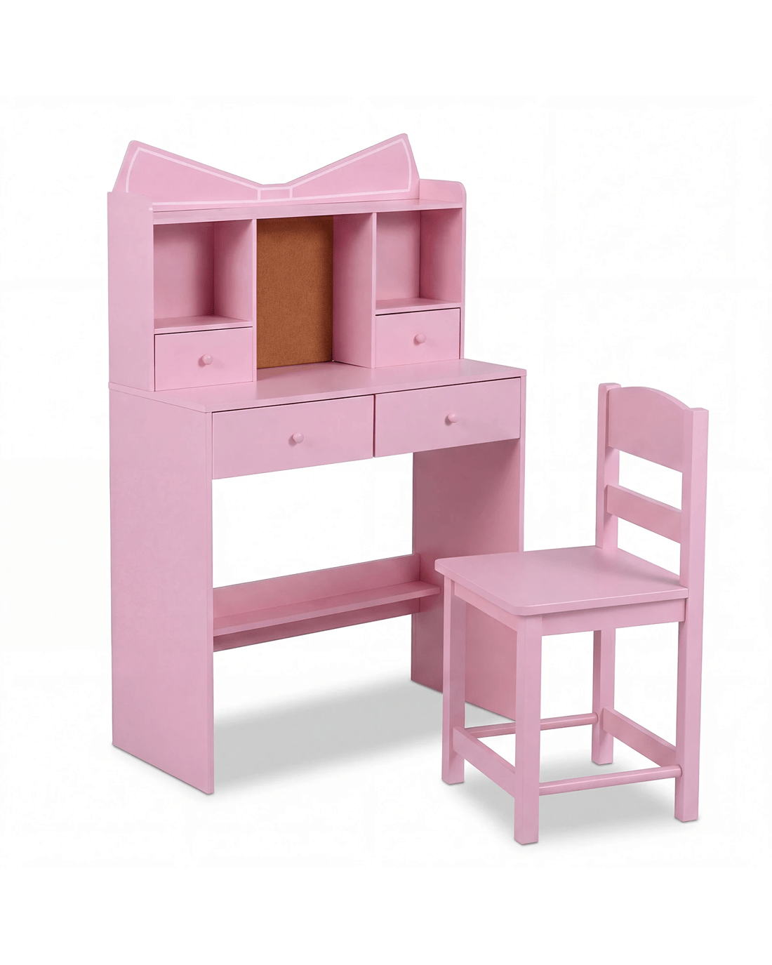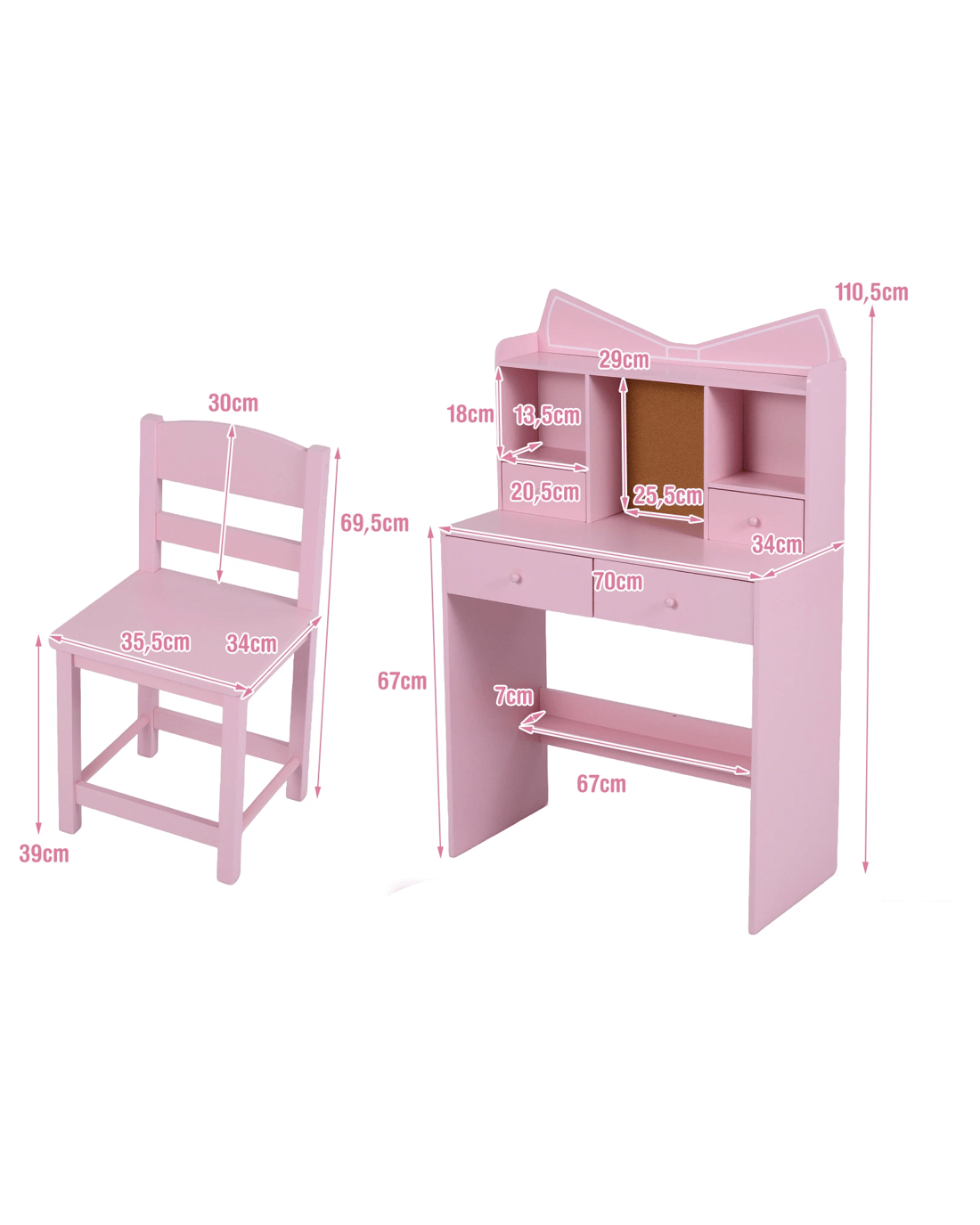 This little ones study desk and chair set provides ample storage with multiple open shelves, 4 drawers of 2 sizes and a wide tabletop to keep books, toys and supplies organized and accessible. Crafted from safe materials, it also includes an anti-tipping kit to ensure stability and little one security. The accompanying chair is designed for comfort with a supportive backrest and an ergonomic footrest to relax little legs. This versatile desk supports various activities such as studying, drawing, reading and playing, enhanced by a handy cork bulletin board for pinning notes and reminders. Its charming pink bow design combine functionality and aesthetic appeal, making it an ideal and thoughtful gift.