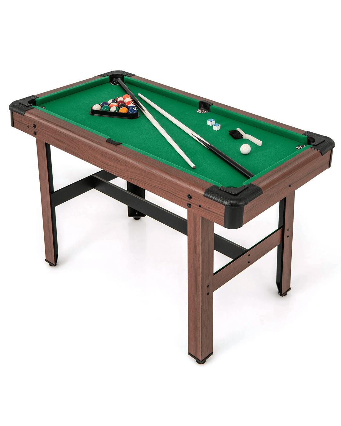 Features a full set of balls, 2 cue sticks, 2 cue chalks, a brush, and a ball triangle