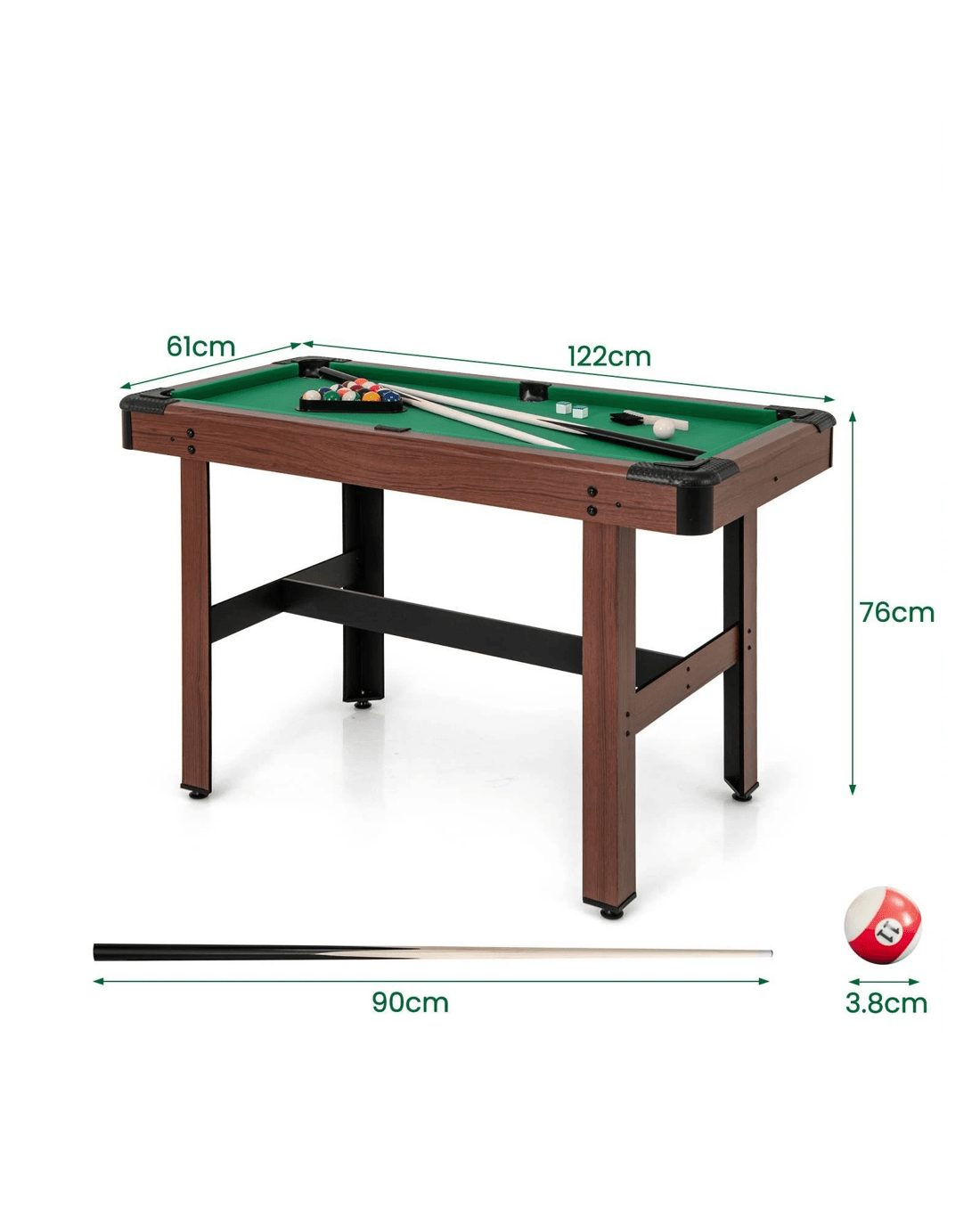 Our pool table measures 122 x 61 x 76 cm (L x W x H), which strikes the perfect balance between size and comfort, fitting seamlessly into any space from basements to game rooms. Featuring a luxurious velvet surface and cue sticks free of any rough edges, every shot is smooth and accurate. The reinforced H-shaped table legs and thick tabletop ensure exceptional stability, while adjustable footpads ensure a level playing field every time. Furthermore, it includes a full set of balls, 2 cue sticks, 2 cue chalks, a brush, and a ball triangle, allowing you to enjoy exciting games with friends and family. Prepare to unleash your competitive spirit and have endless hours of fun with our premium pool table!