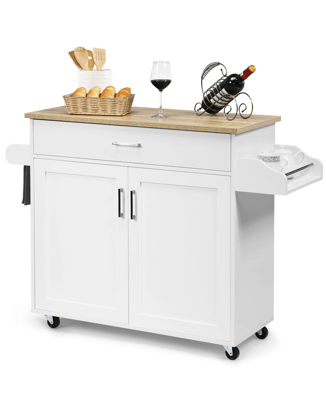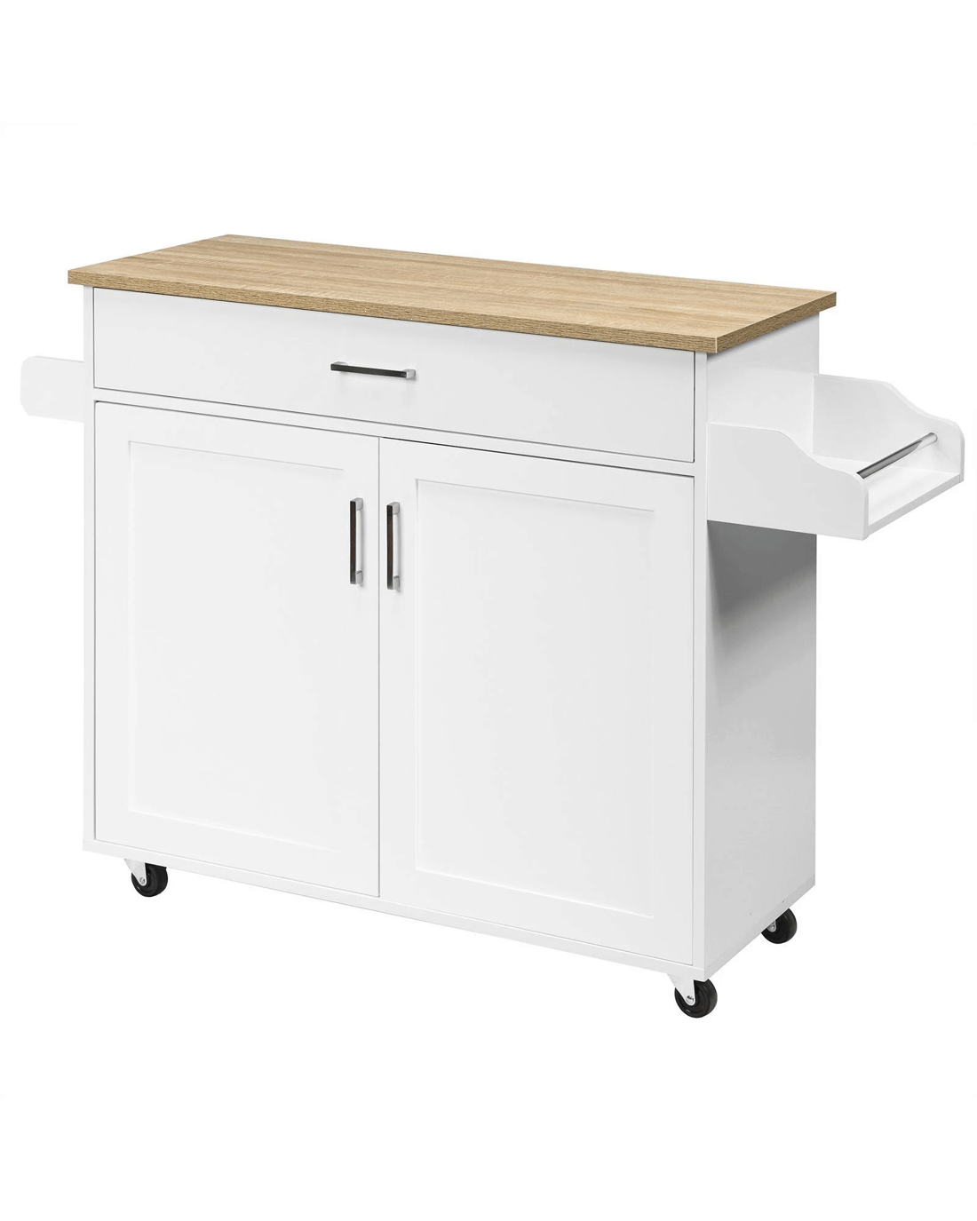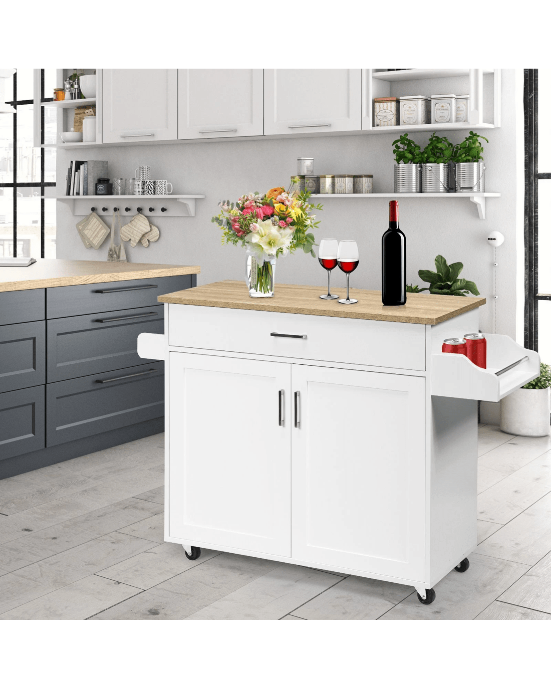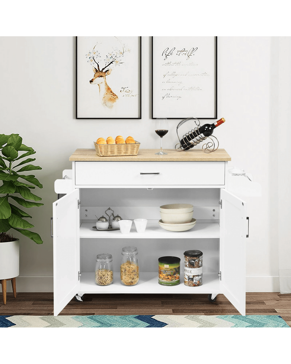 Featuring a spacious countertop, a large drawer and a cabinet, this trolley cart will offer ample storage space for tableware, glasses, food, etc. The shelf inside the cabinet can be adjusted with 3 positions, which allow you to customize the spacing of the shelves according to the storage items. And specially designed spice rack and towel rack make it easy for taking the towel and spice bottles at any time. Equipped with 4 universal casters (2 with brakes), it achieves a perfect balance between convenient mobility and high security. Whether you want an extra working surface, or to better organize your kitchen supplies, our kitchen island cart is your ideal choice.