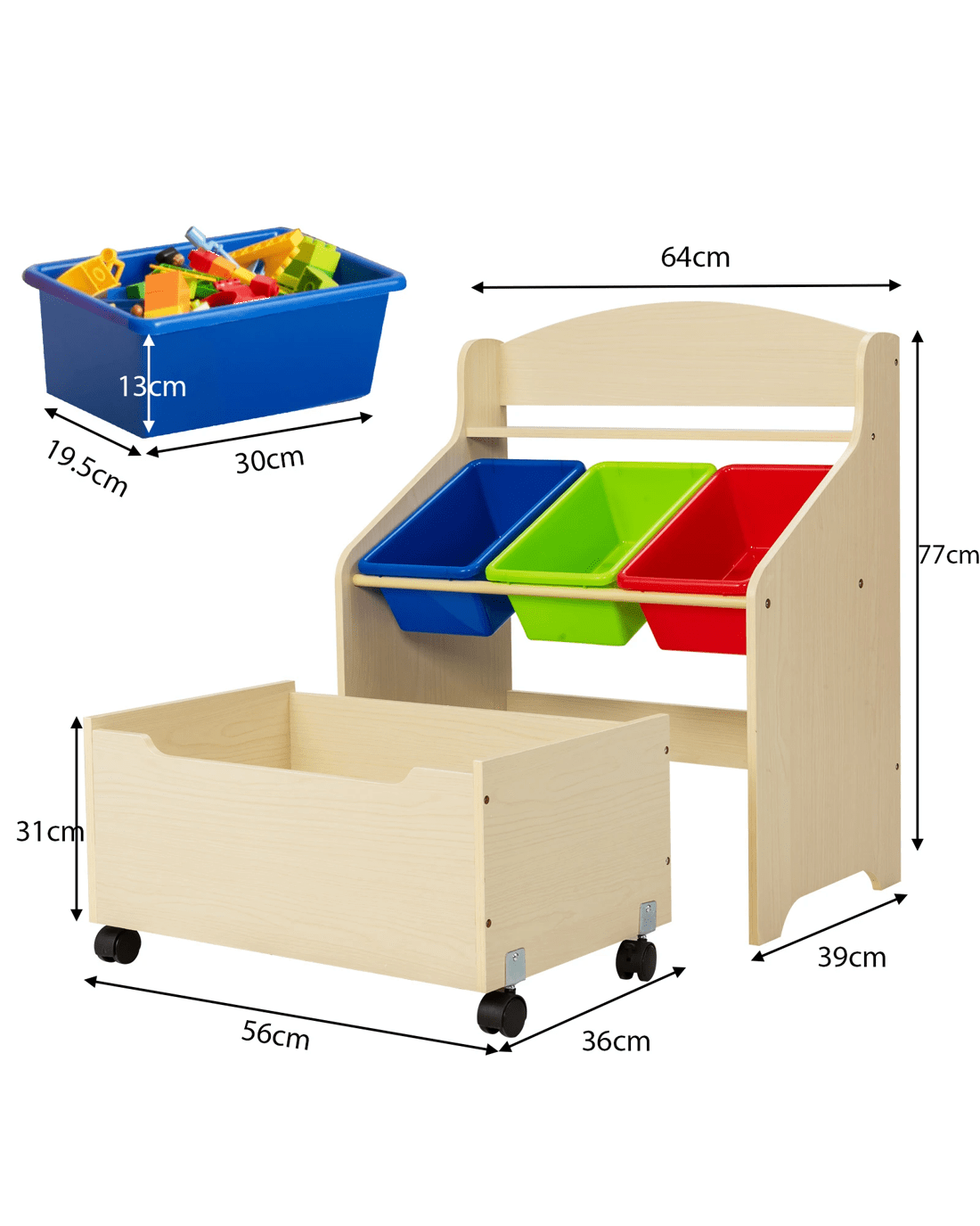 Includes 1 large capacity toy box, 3 removable plastic bins, 1 top display shelf