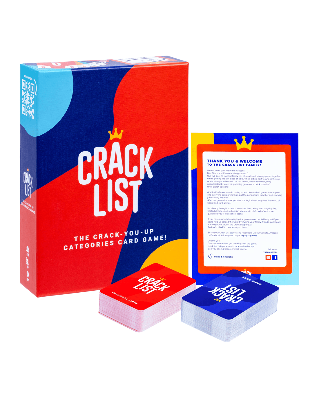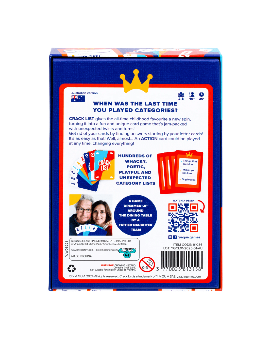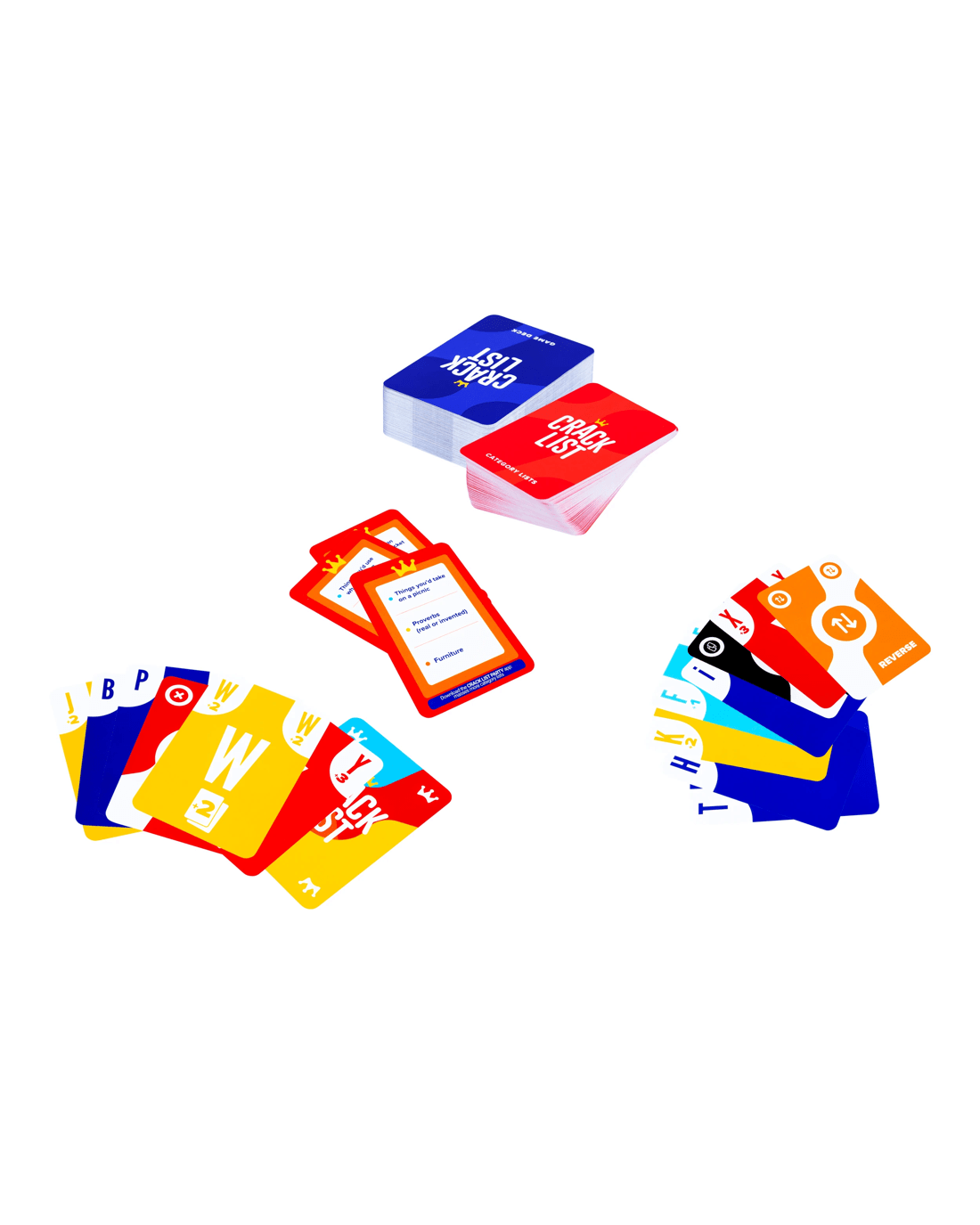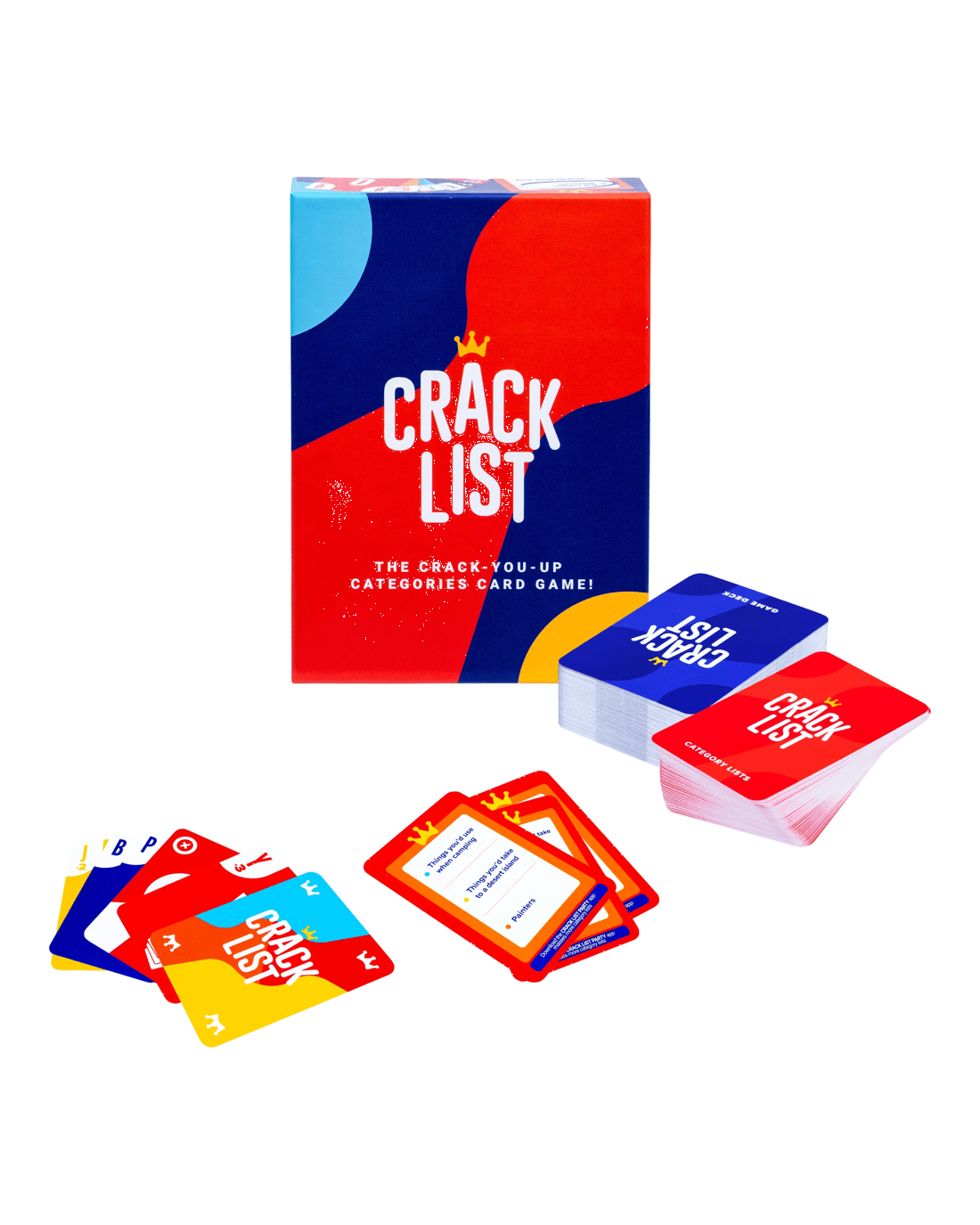 Crack List is a brand new take on Categories in an exciting card game format where everyone takes turns to play! Get rid of all your cards faster than the other players. Crack the category lists by finding answers for the chosen category that start with the letters in your hand. Sound easy? Think again! Each time a new Crack List card is played, a brand-new category gets chosen. And an action card can change everything! The twists and turns just keep on coming until one of the players wins the round by cracking the category and playing their final card. It's the perfect way of challenging or bonding with 2-8 family and friends, aged 10 and up! Crack List is a great game to play in teams of two or three as well and allows up to 20 players to join in that game all at once!