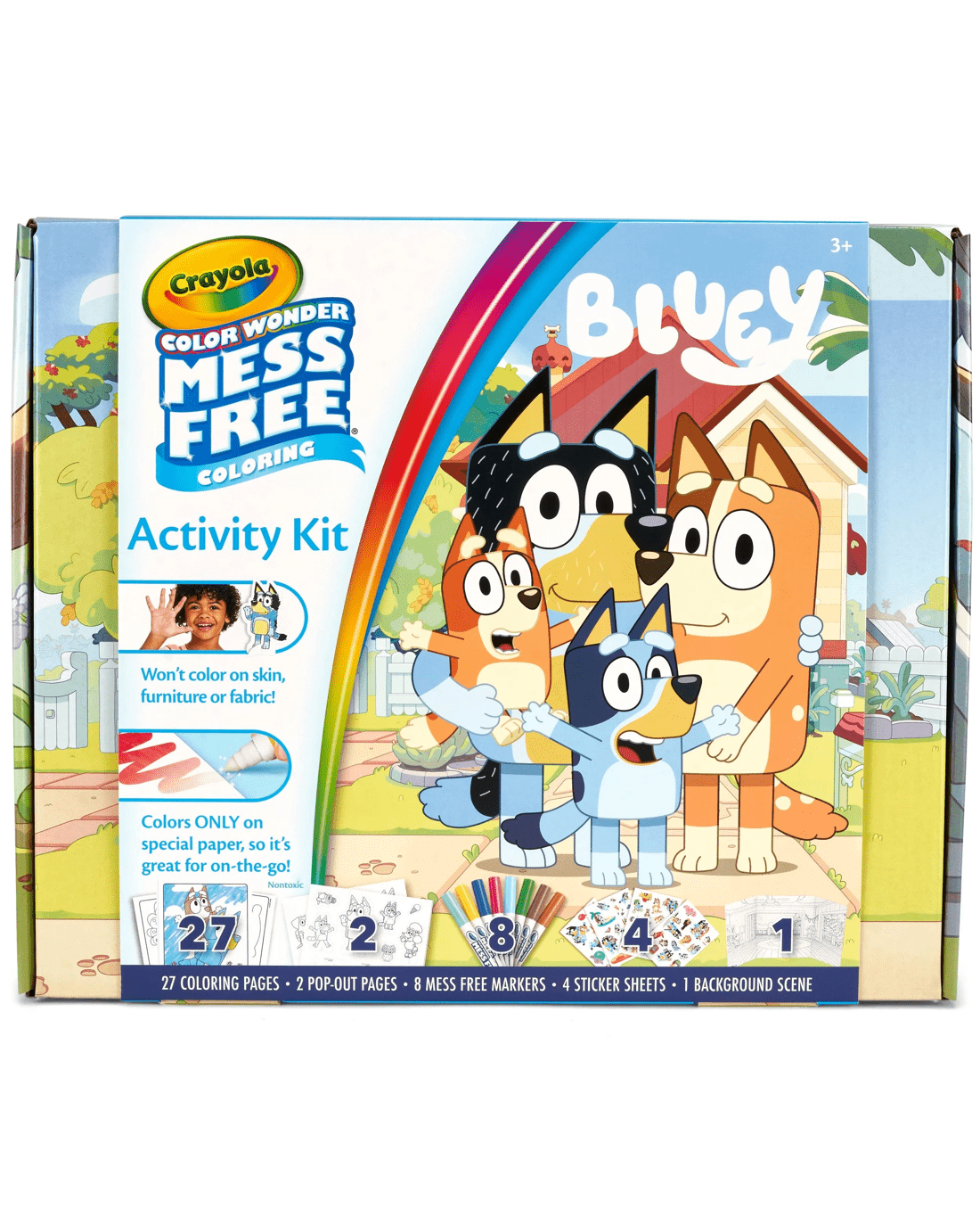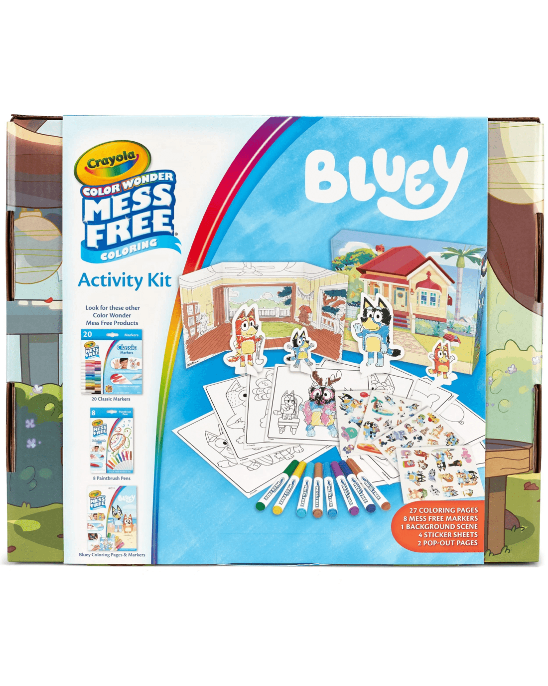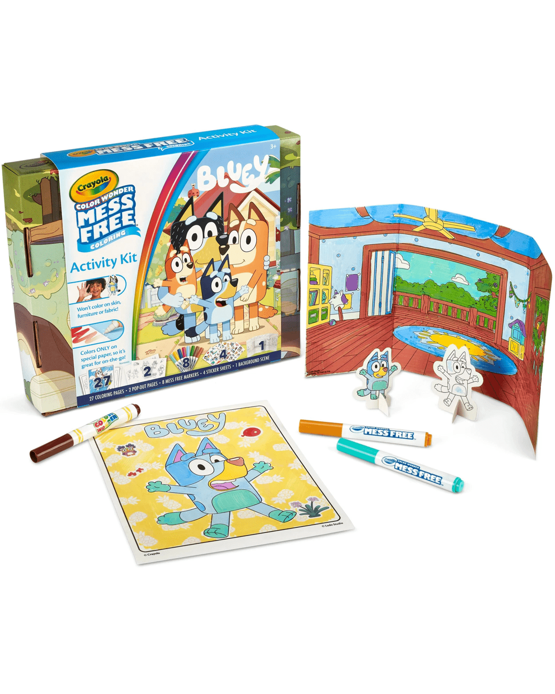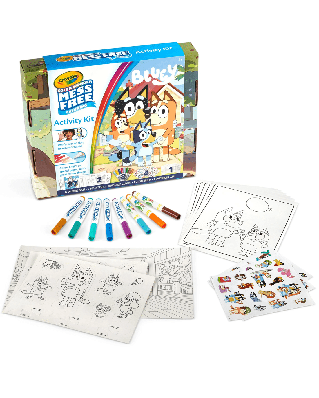 - Includes 27 Bluey Colouring Pages, 8 Mess-Free Markers, 4 Sticker Sheets, 2 Die Cut Cardstock Character Cutouts, and 1 Trifold Background Scene.