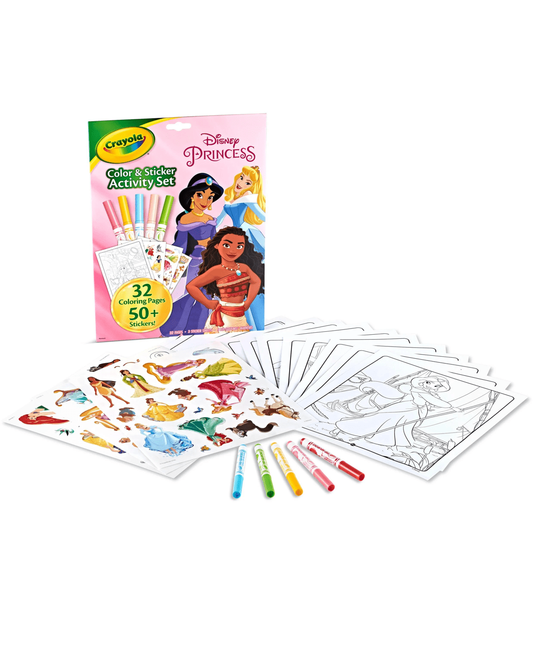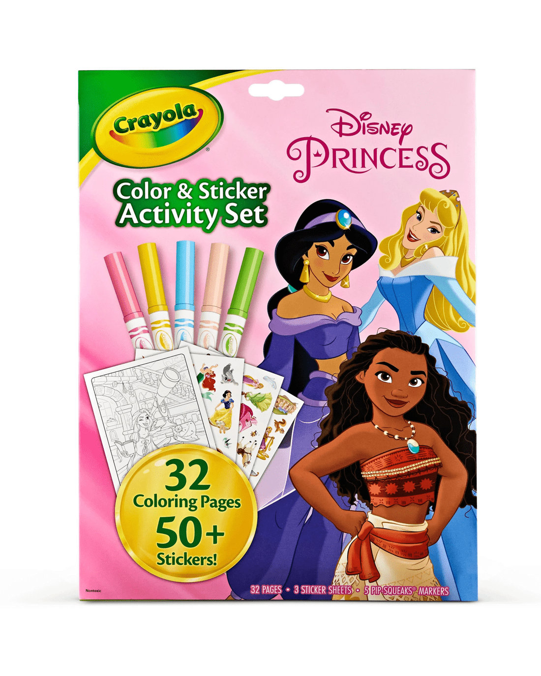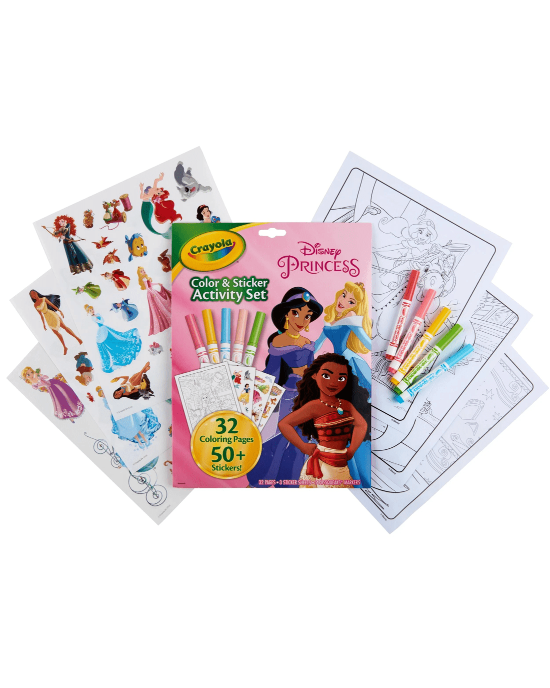 - INCLUDES: 32 Disney Princess Colouring Pages, 5 Crayola Pipsqueak Markers, and 50+ Stickers of Cinderella, Belle, Moana and friends.