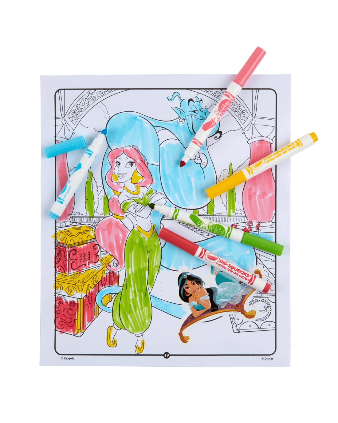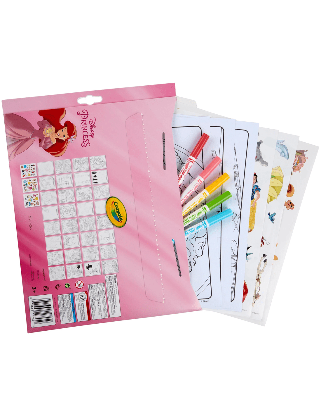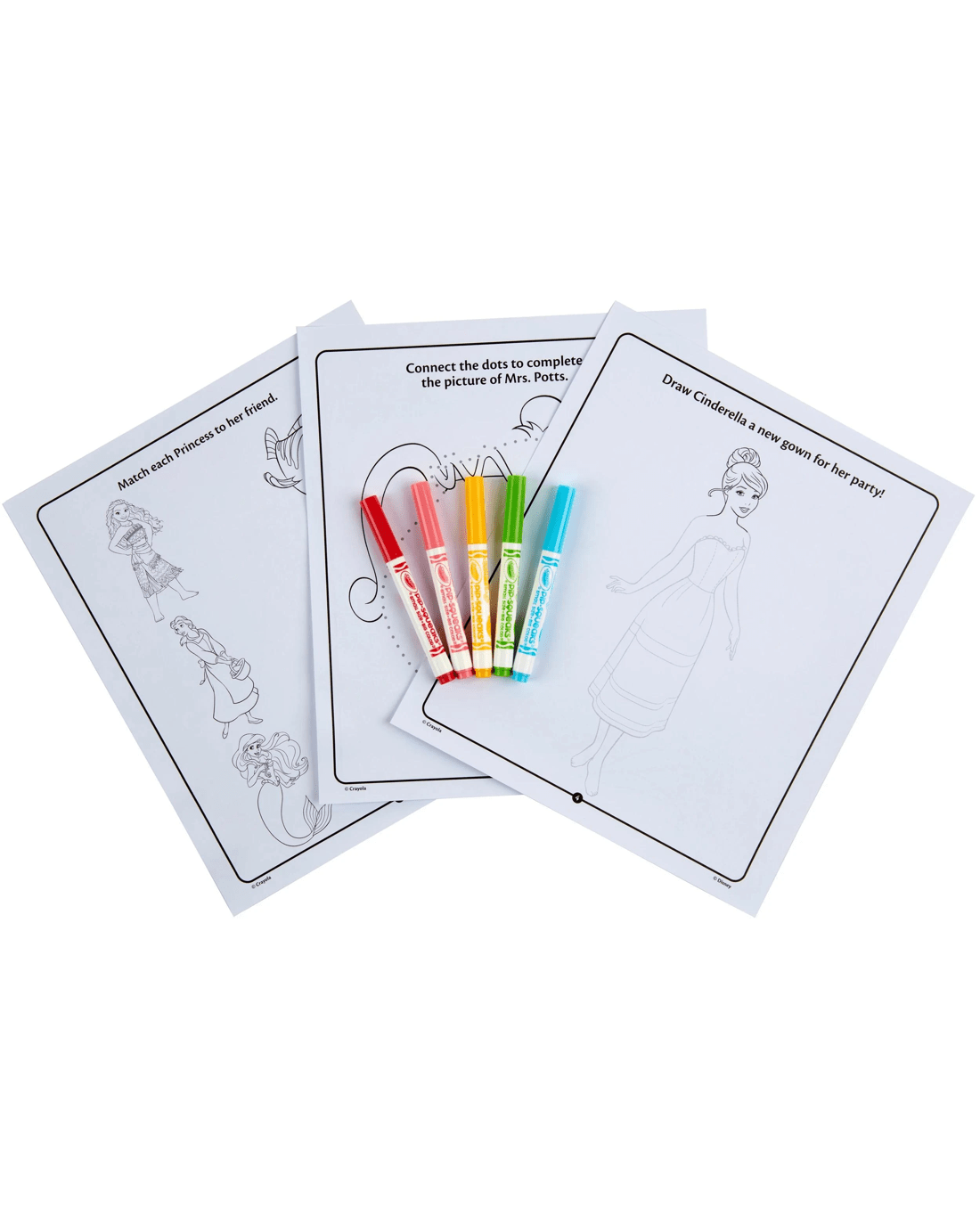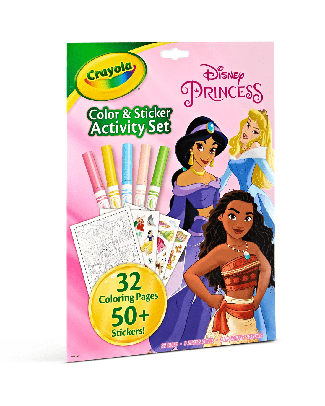 - INCLUDES: 32 Disney Princess Colouring Pages, 5 Crayola Pipsqueak Markers, and 50+ Stickers of Cinderella, Belle, Moana and friends.