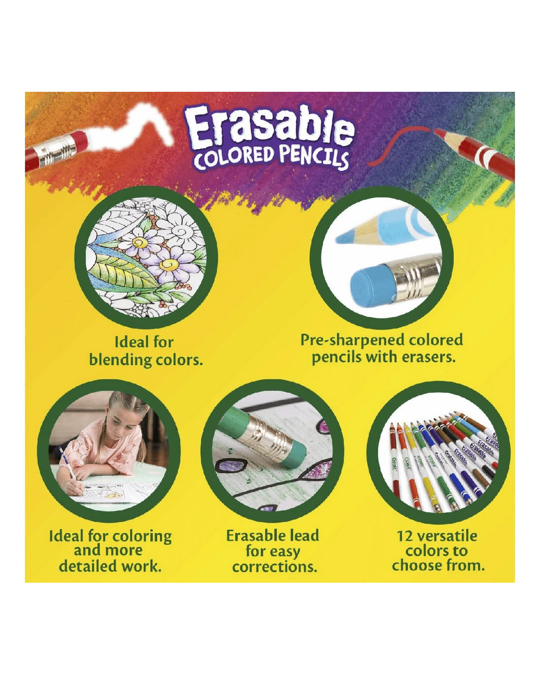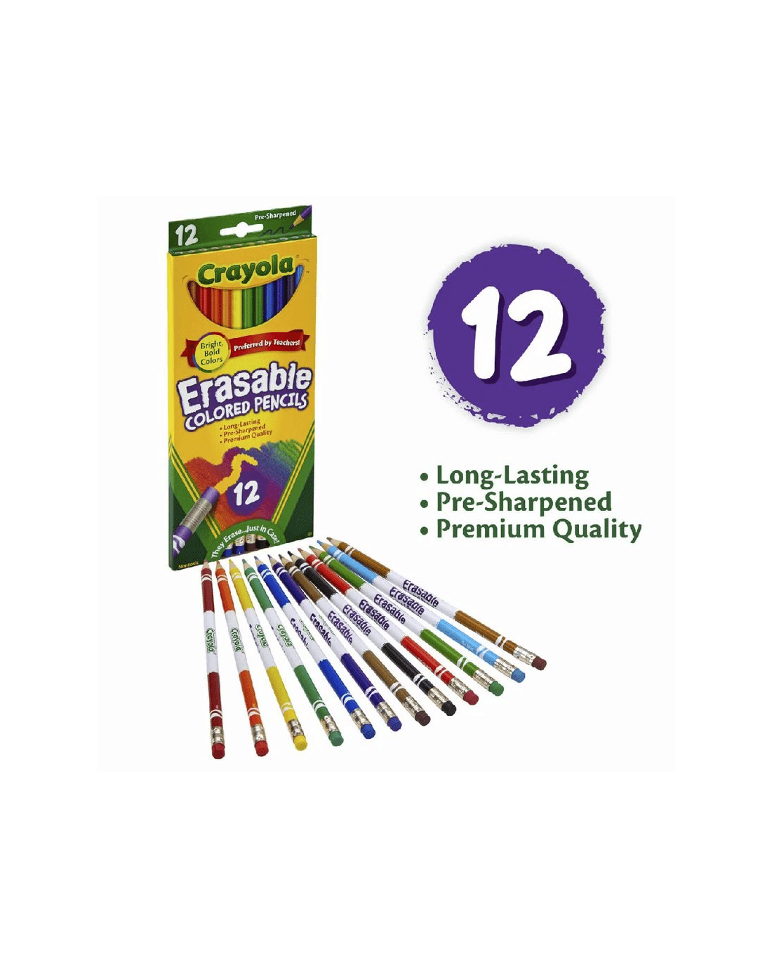 These Crayola Erasable Coloured Pencils are ideal for your pencil case or school desk. These pre-sharpened pencils have an eraser end to fix up mistakes or clean lines, while the leads are thick and soft to resist breakage.